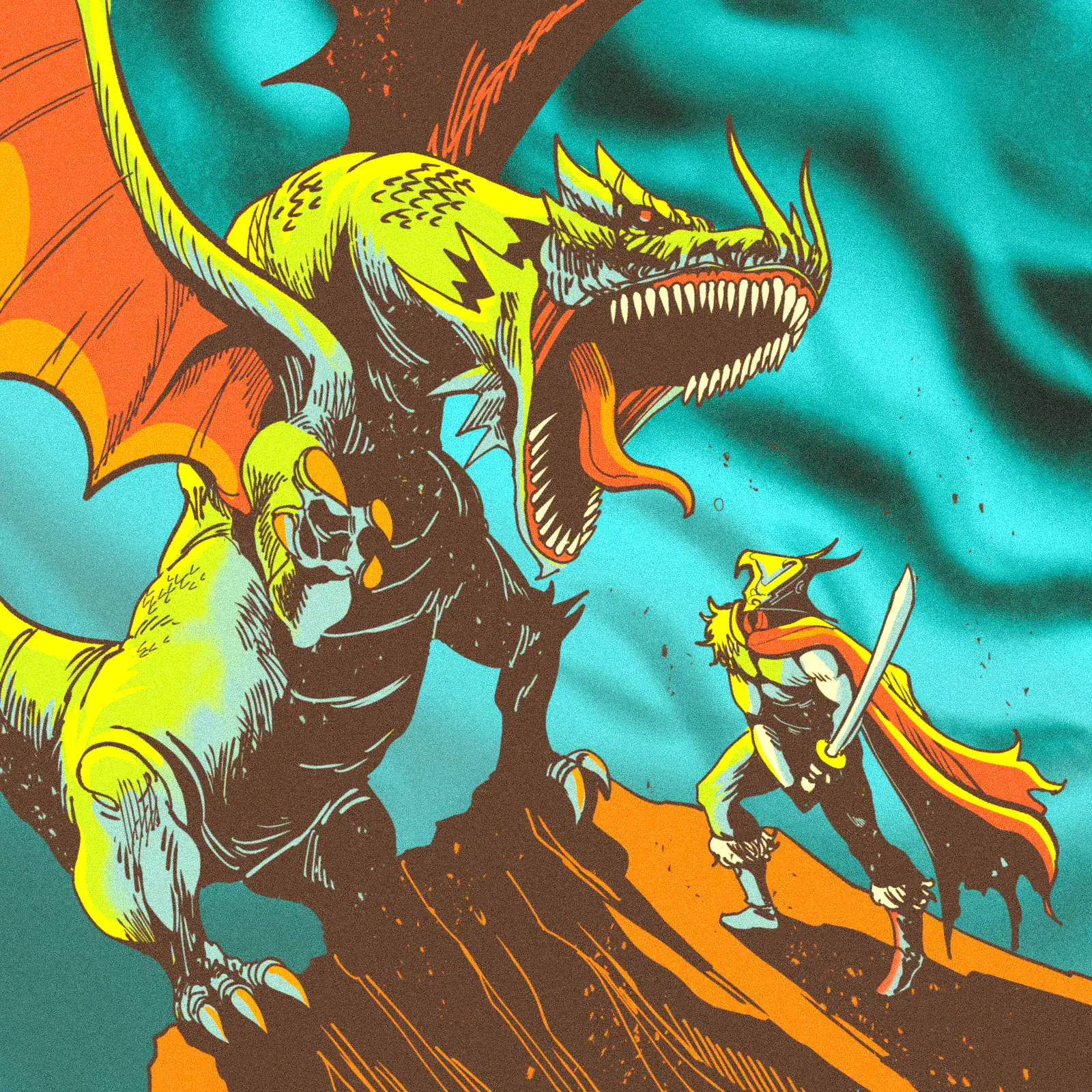 Indeed, turquoise storm clouds frame the confrontation with dramatic black shading throughout the background. The limited palette of yellow, orange, turquoise, and black creates striking visual impact. Moreover, the small warrior below wields his sword against the towering beast.