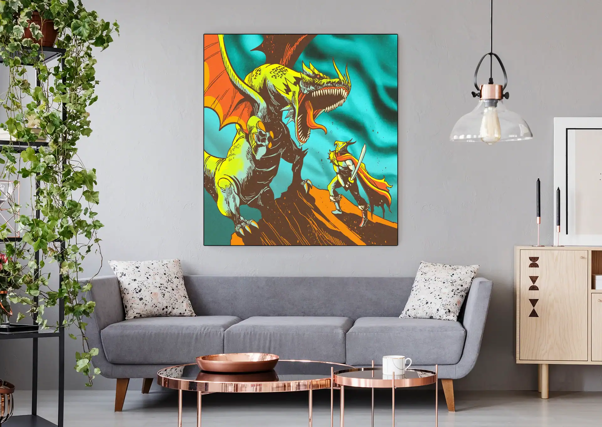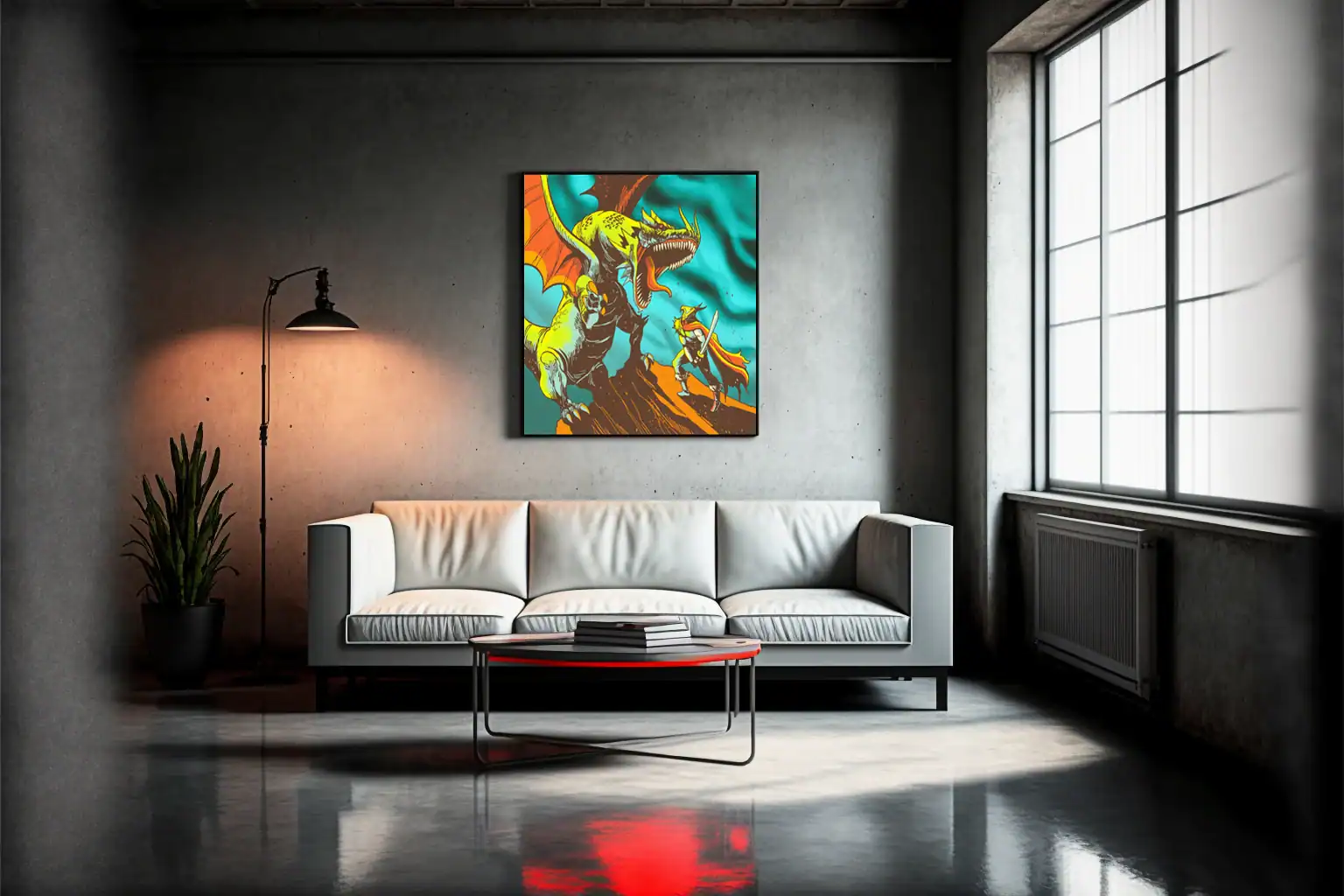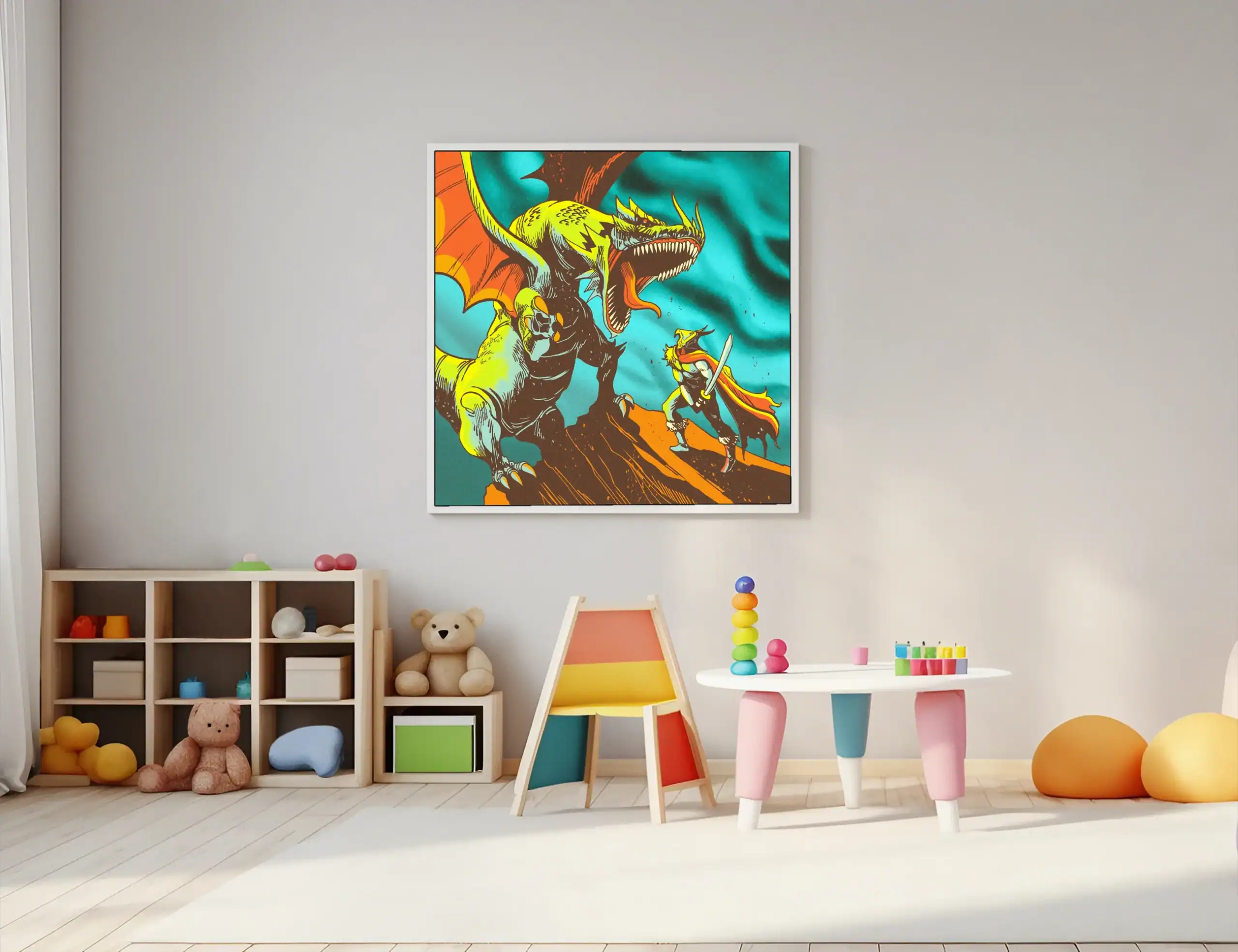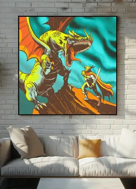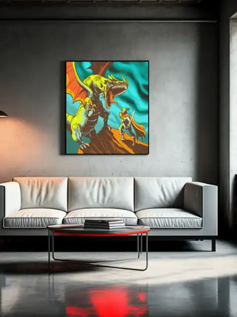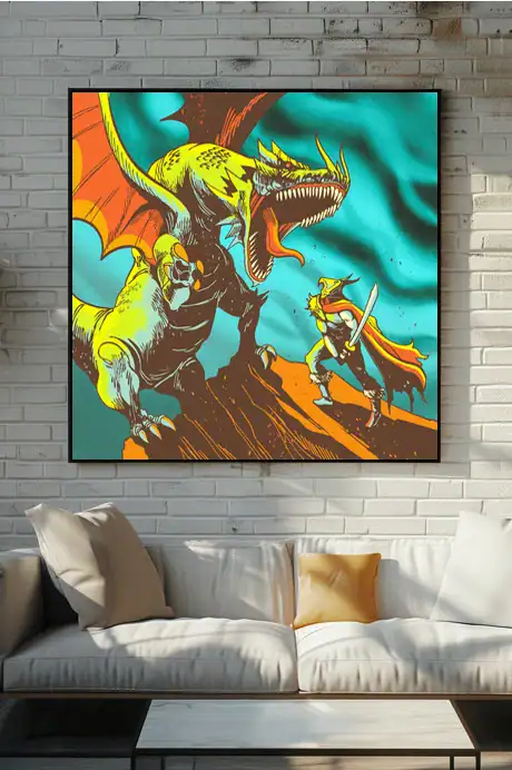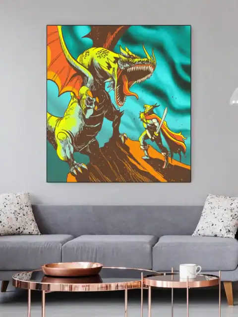 Creative studios and gaming dens gain focus from this confrontational dragon-versus-warrior dynamic. Furthermore, the retro comic aesthetic complements vintage gaming collections perfectly.