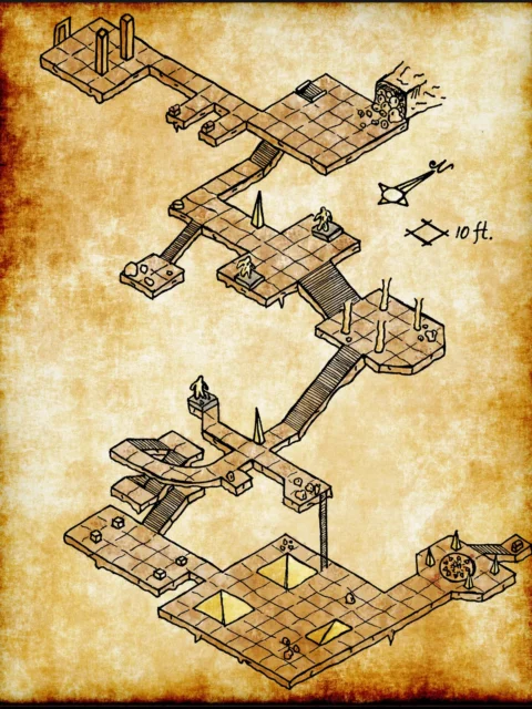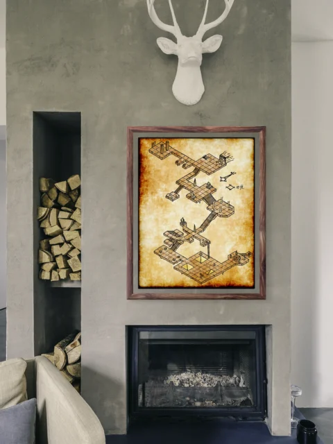 Furthermore, deep amber tones and darkened edges give authentic vintage character. Hatched shading defines elevation changes across interconnected walkways and chambers. A compass rose and 10-foot scale provide tactical orientation for your adventures.