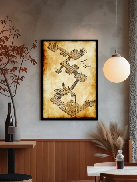 This isometric dungeon crawls across aged parchment in crisp black ink. The hidden temple fantasy battle map canvas print reveals multi-level platforms connected by shadowed stairways. Circular encounter zones and triangular traps mark your path through this labyrinthine complex.