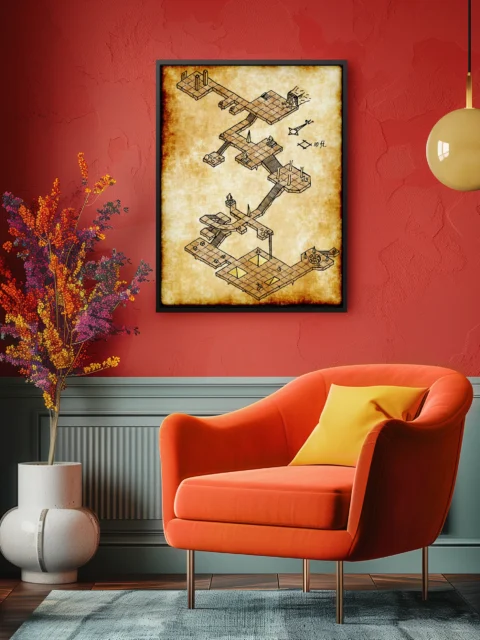 This isometric dungeon crawls across aged parchment in crisp black ink. The hidden temple fantasy battle map canvas print reveals multi-level platforms connected by shadowed stairways. Circular encounter zones and triangular traps mark your path through this labyrinthine complex.
