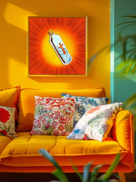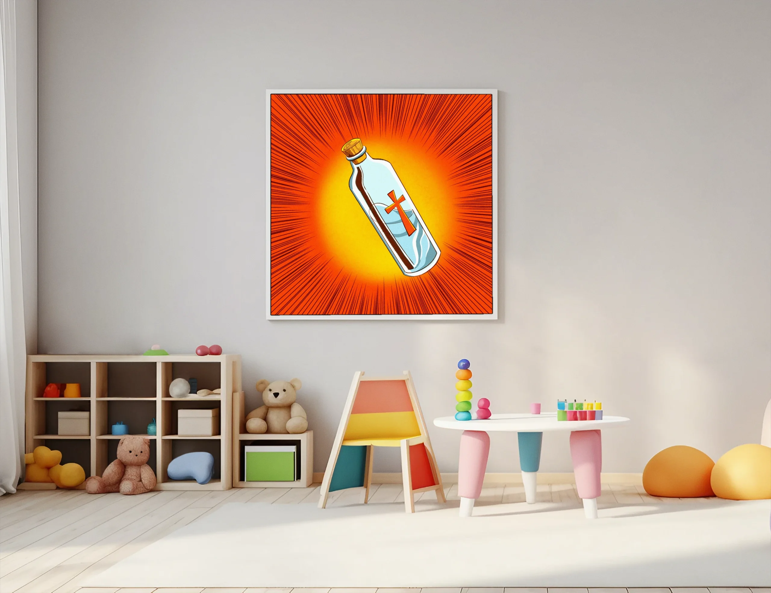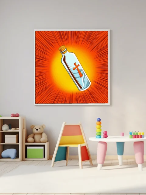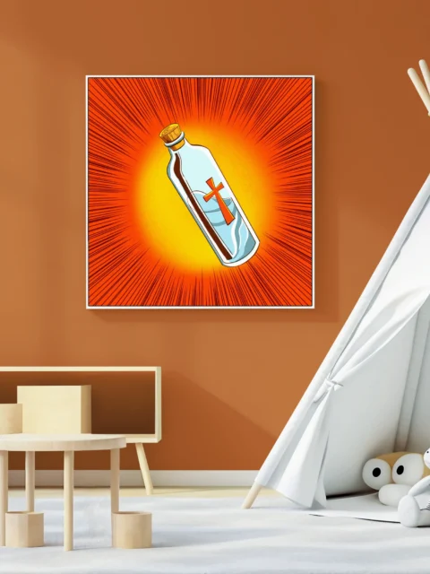 A glass bottle with wooden cork floats diagonally, containing water and a submerged orange-red cross. This holy water art trading card art canvas print presents Fabricio Vainer’s illustration in full. Specifically, the cross sits partially submerged with light refracting through the glass walls.