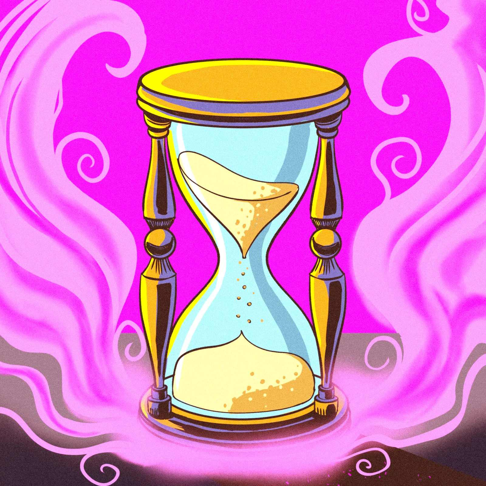 Additionally, the background radiates a vibrant hot pink to magenta gradient that saturates the entire composition. Lighter pink smoke tendrils curl around both sides of the hourglass and pool beneath it. Moreover, bold black outlines define every element with cel-shaded coloring that gives the piece a polished animation aesthetic.