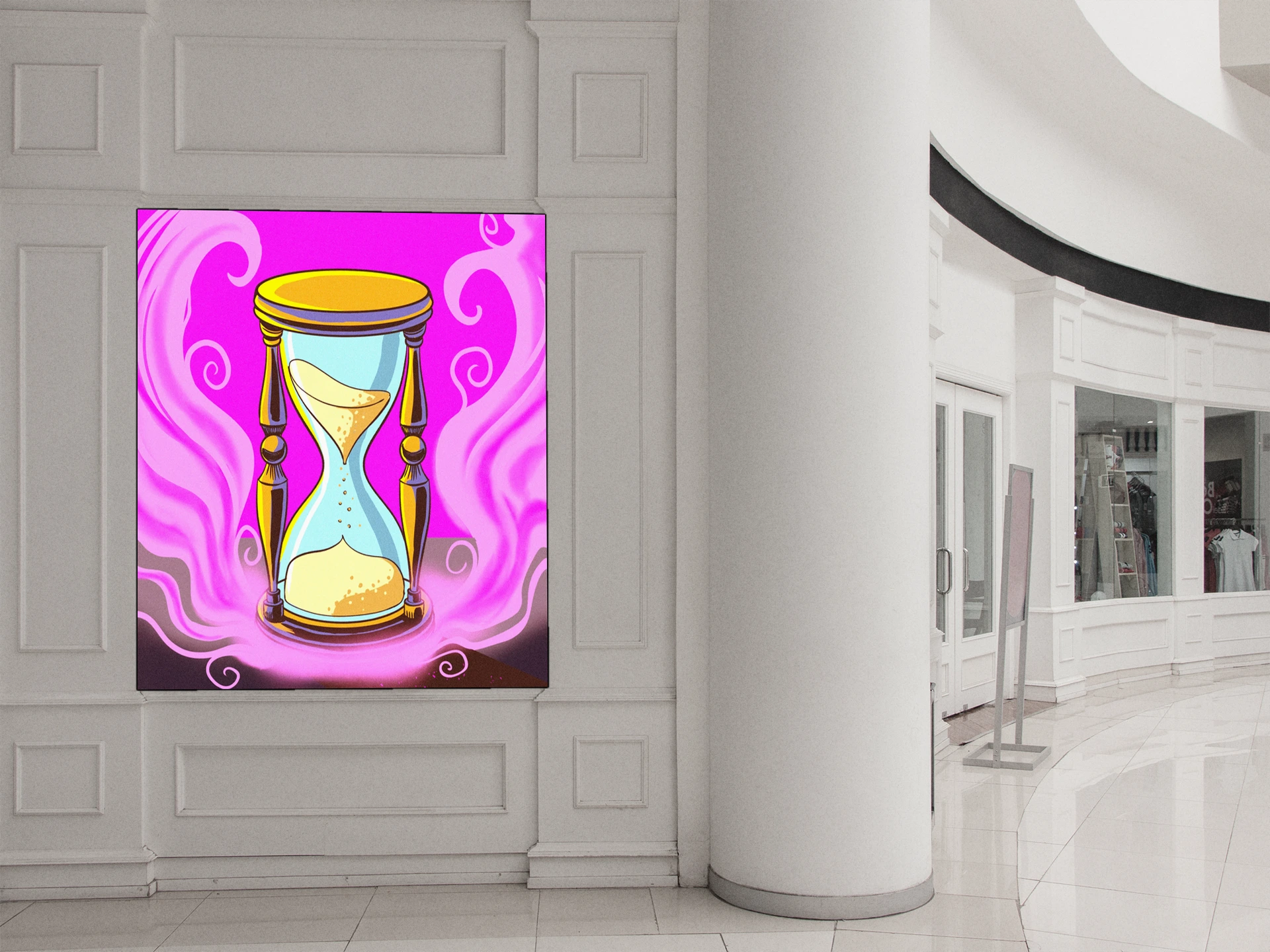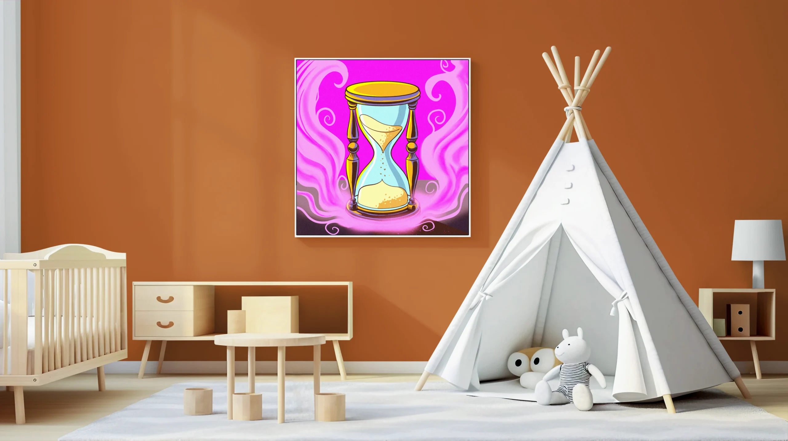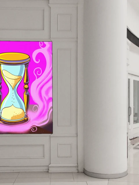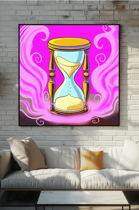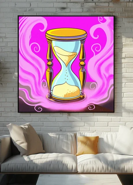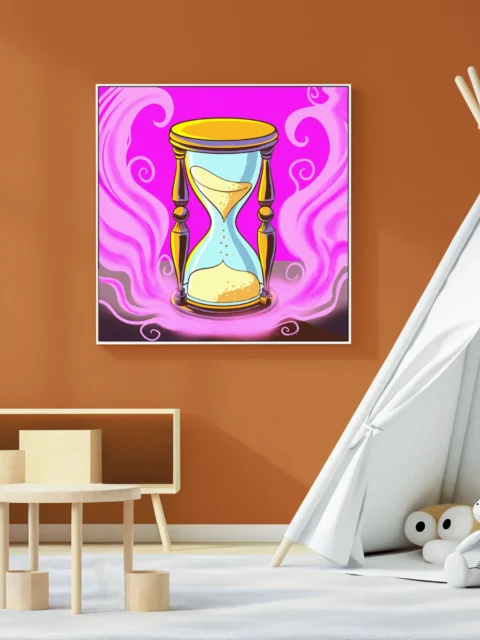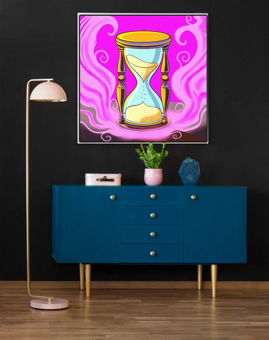 On the wall, the magenta saturation holds intensity that smaller formats cannot match. This speaks directly to Ward TCG collectors and fans of mystical symbolism rendered in cartoon-inspired illustration styles. The hourglass of time art trading card art canvas print delivers Fabricio Vainer’s work at gallery scale.