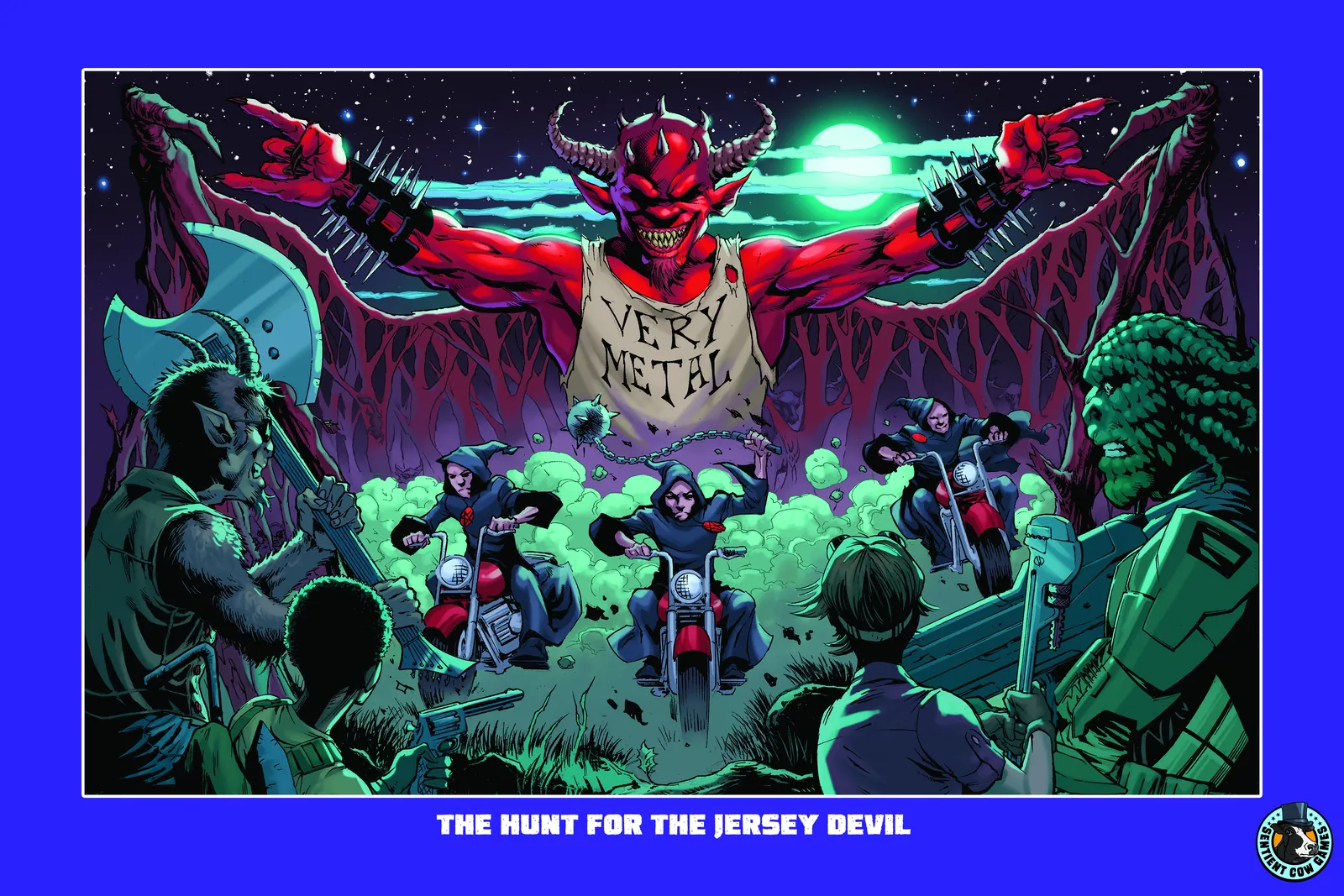 The Hunt For The Jersey Devil fantasy art canvas print unleashes a feral showdown as armed riders charge through a poisoned forest beneath a blood moon. From the first instant, the towering creature dominates the scene with savage confidence. As a result, menace, motion, and dark humor define the artwork’s tone.