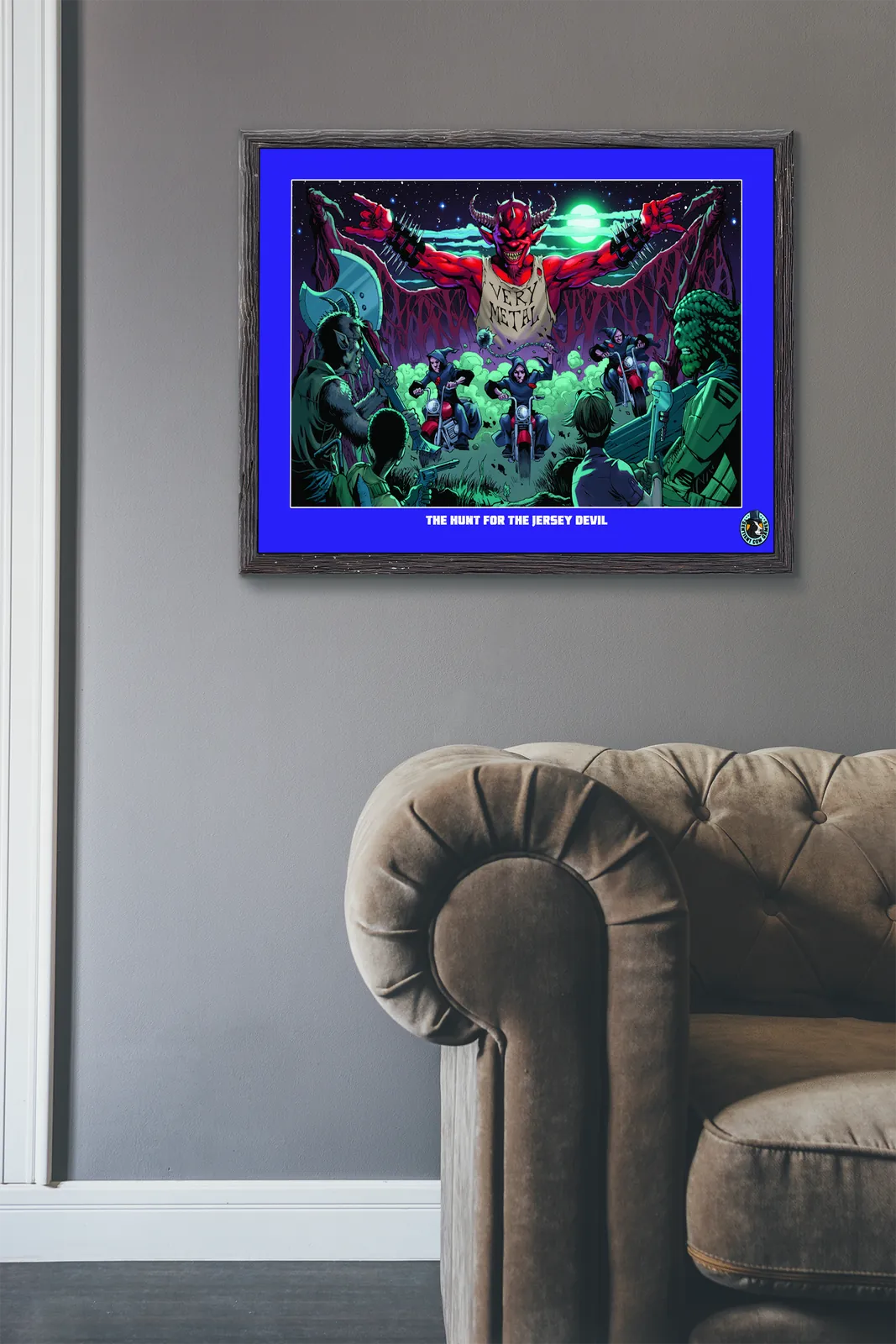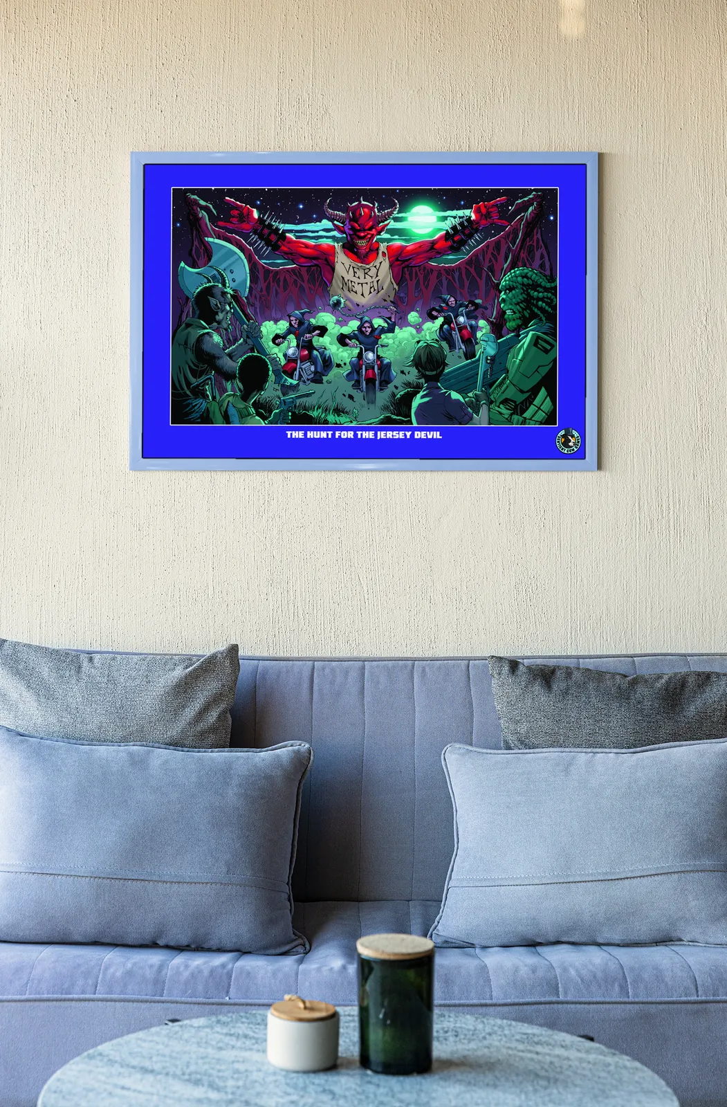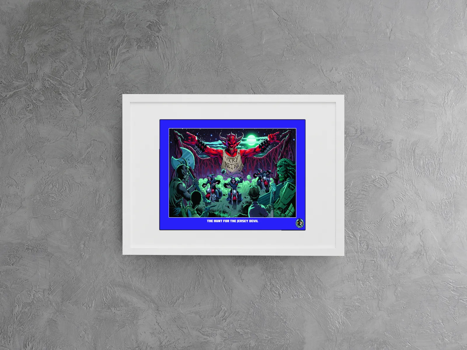 Finally, this art on canvas is produced for bold wall impact and longevity. Therefore, saturated colors, sharp line work, and glowing effects remain vivid at larger sizes. Above all, The Hunt For The Jersey Devil fantasy art canvas print works as collectible display art and as a striking centerpiece for fans of irreverent horror fantasy.