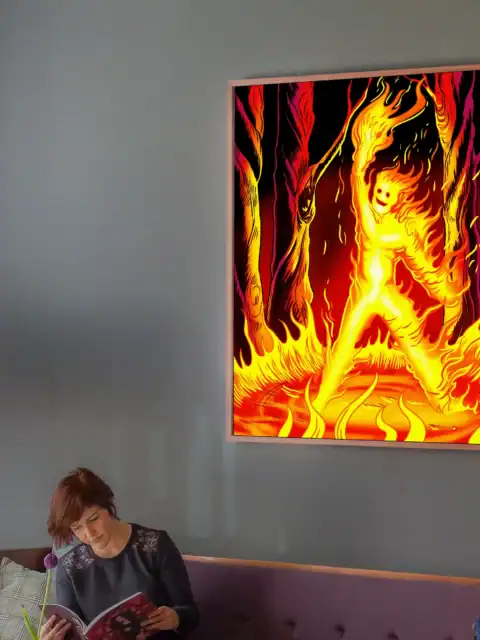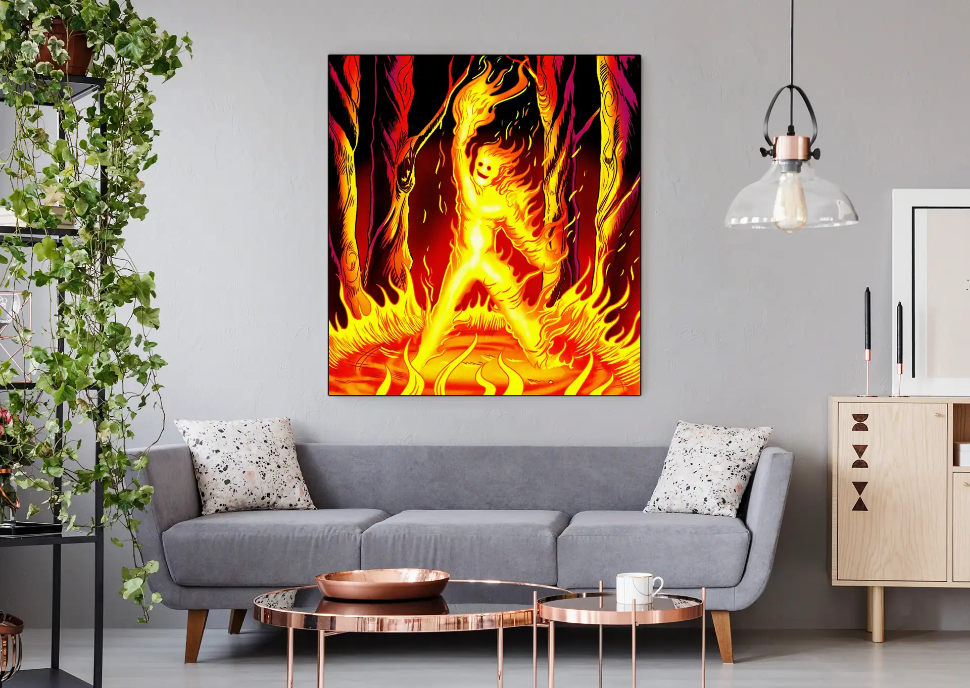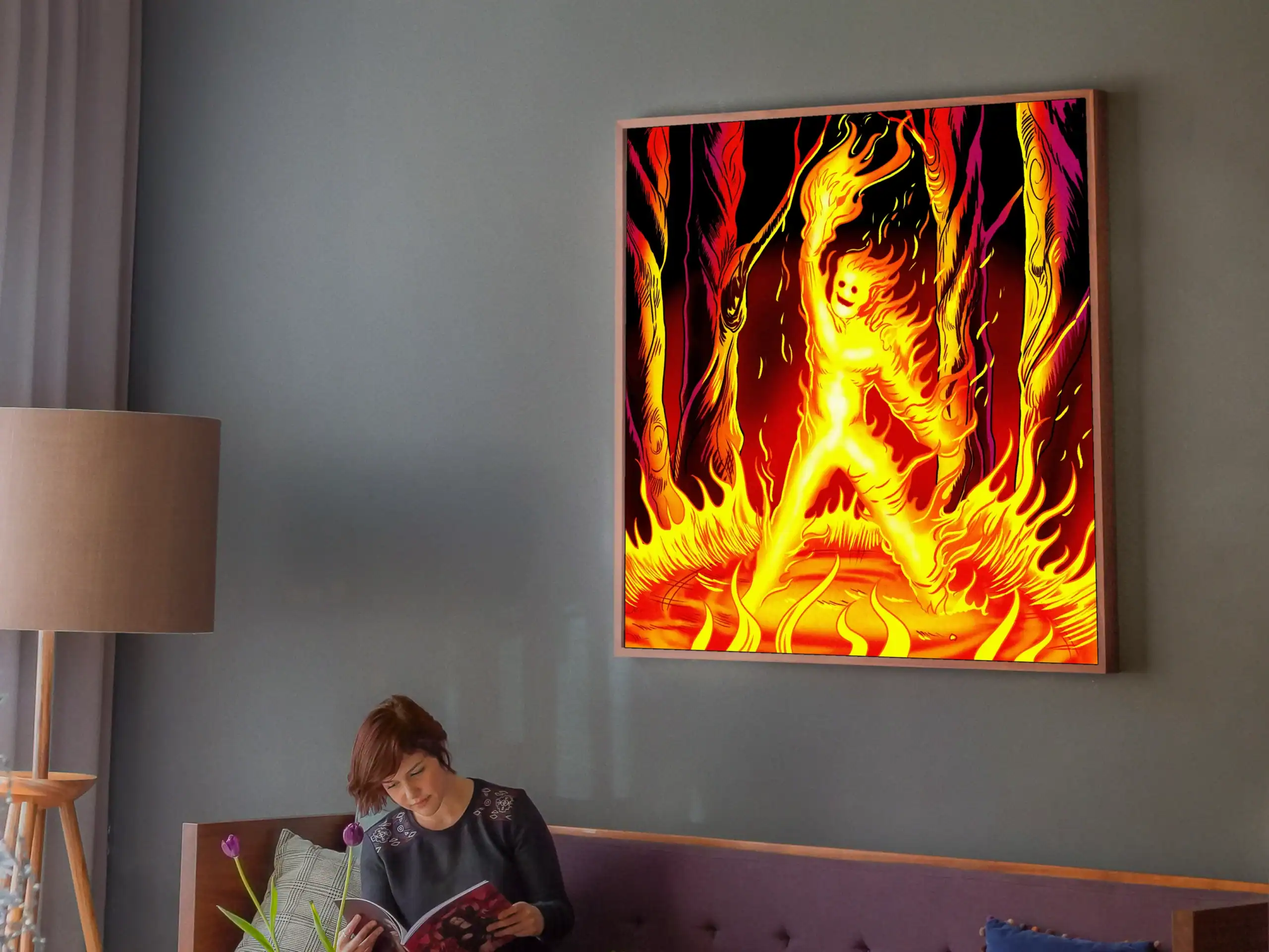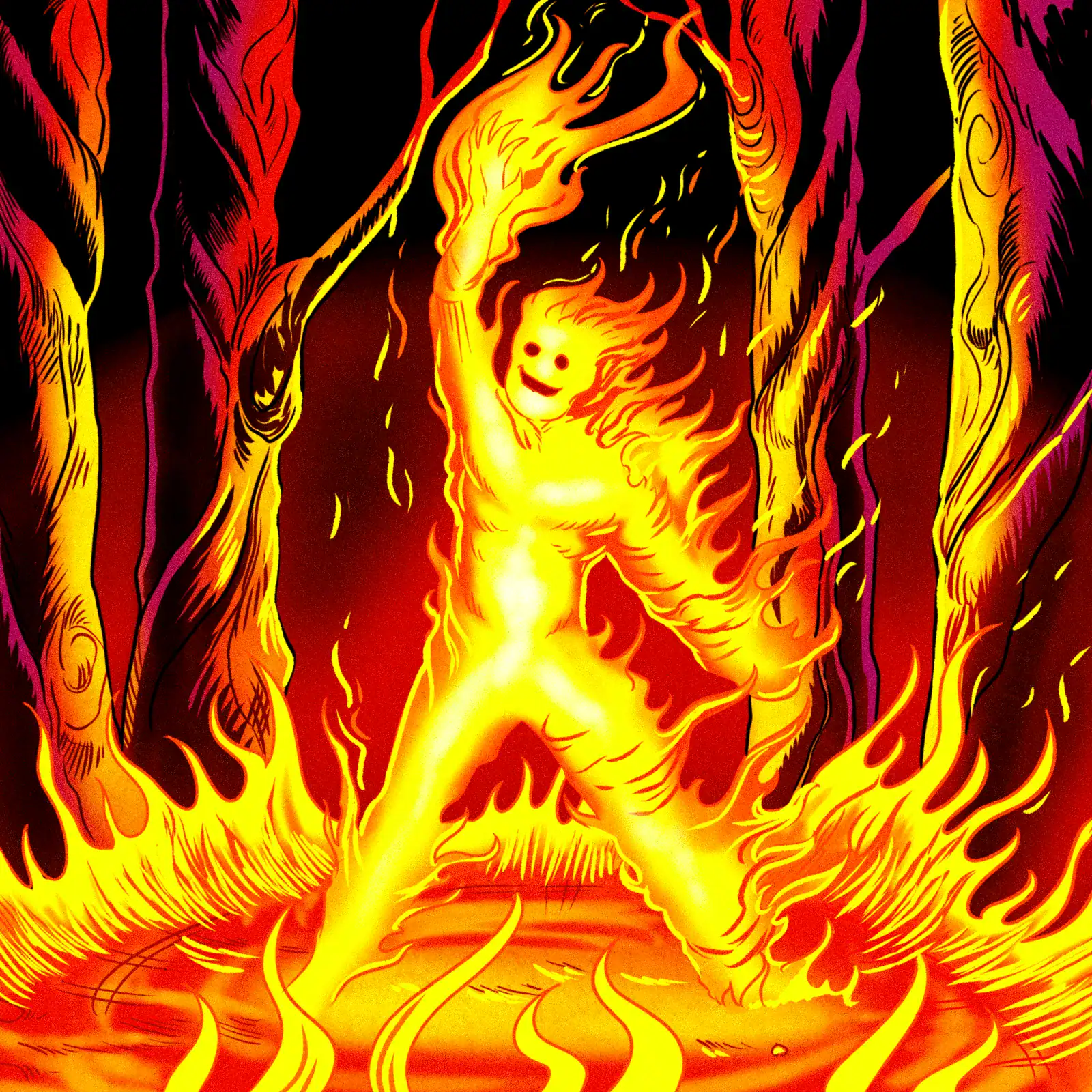 Beyond that, the background shifts from burgundy to black with scattered embers. The twisted forest forms appear to melt downward in red and magenta. Indeed, bold black outlines frame every flame with 1990s comic precision.