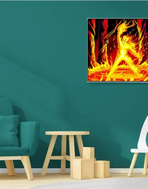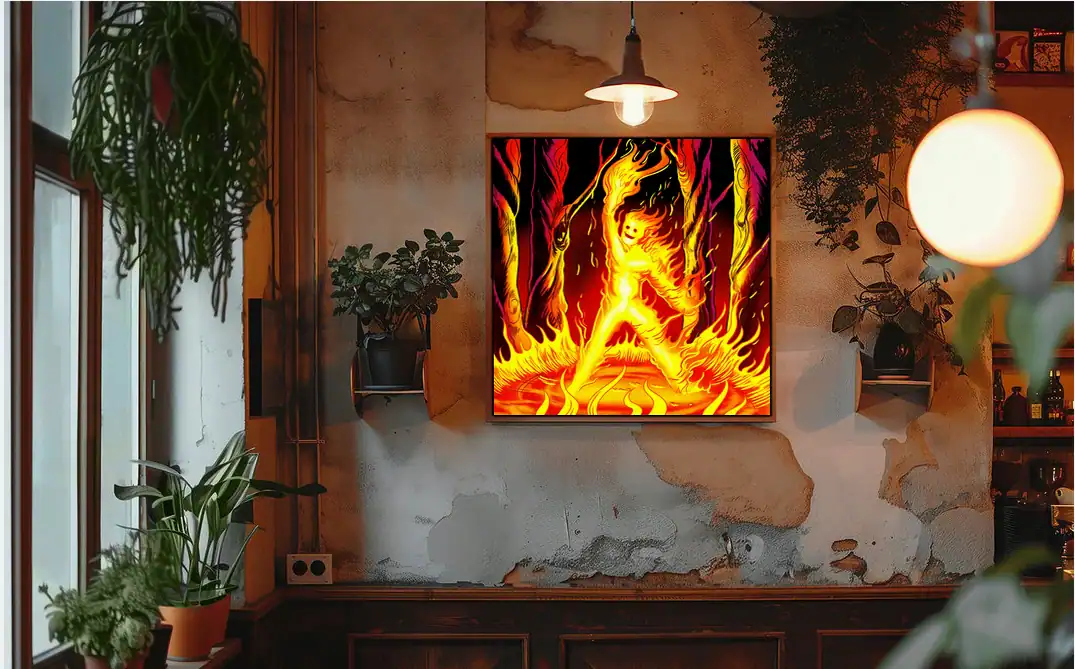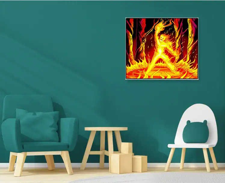 Game rooms benefit from Ward TCG’s distinctive fire elemental artwork above bookshelves. Particularly, the intense orange flames create dramatic focal points in reading spaces.