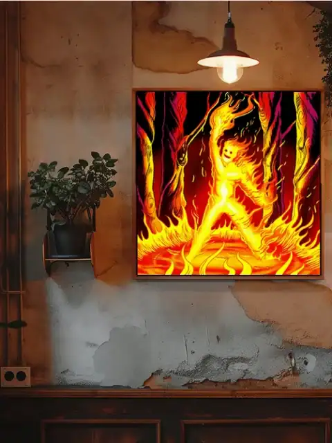 A skeletal fire elemental rises from twisted flame trees in vivid oranges. This ignitus art trading card canvas print captures Fabricio Vainer’s bold comic illustration. Notably, cross-hatching techniques define the creature’s ribcage through burning flesh.