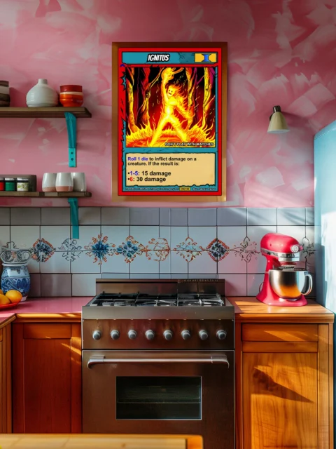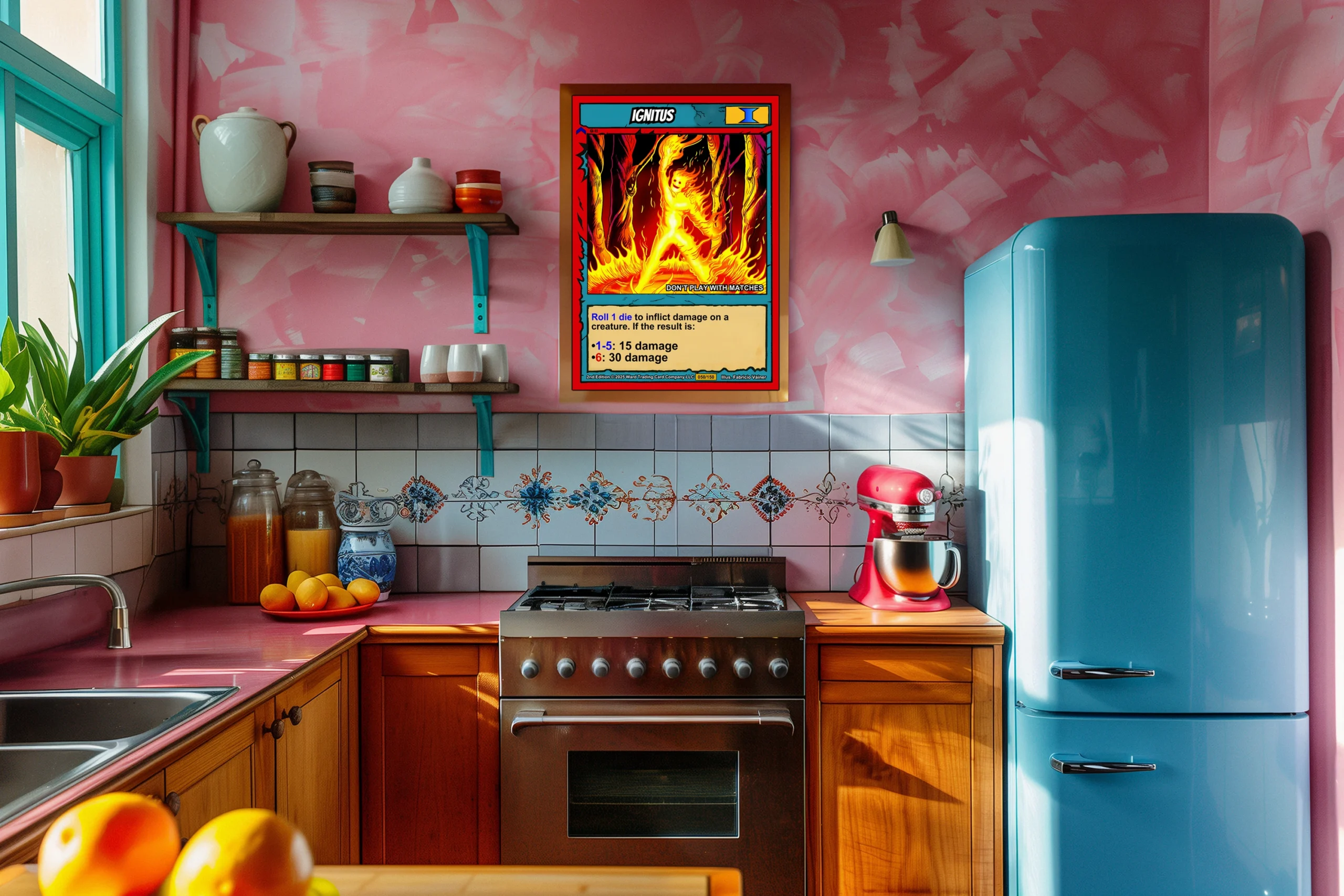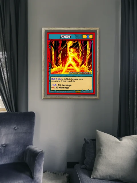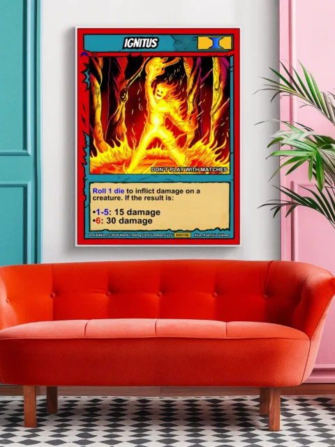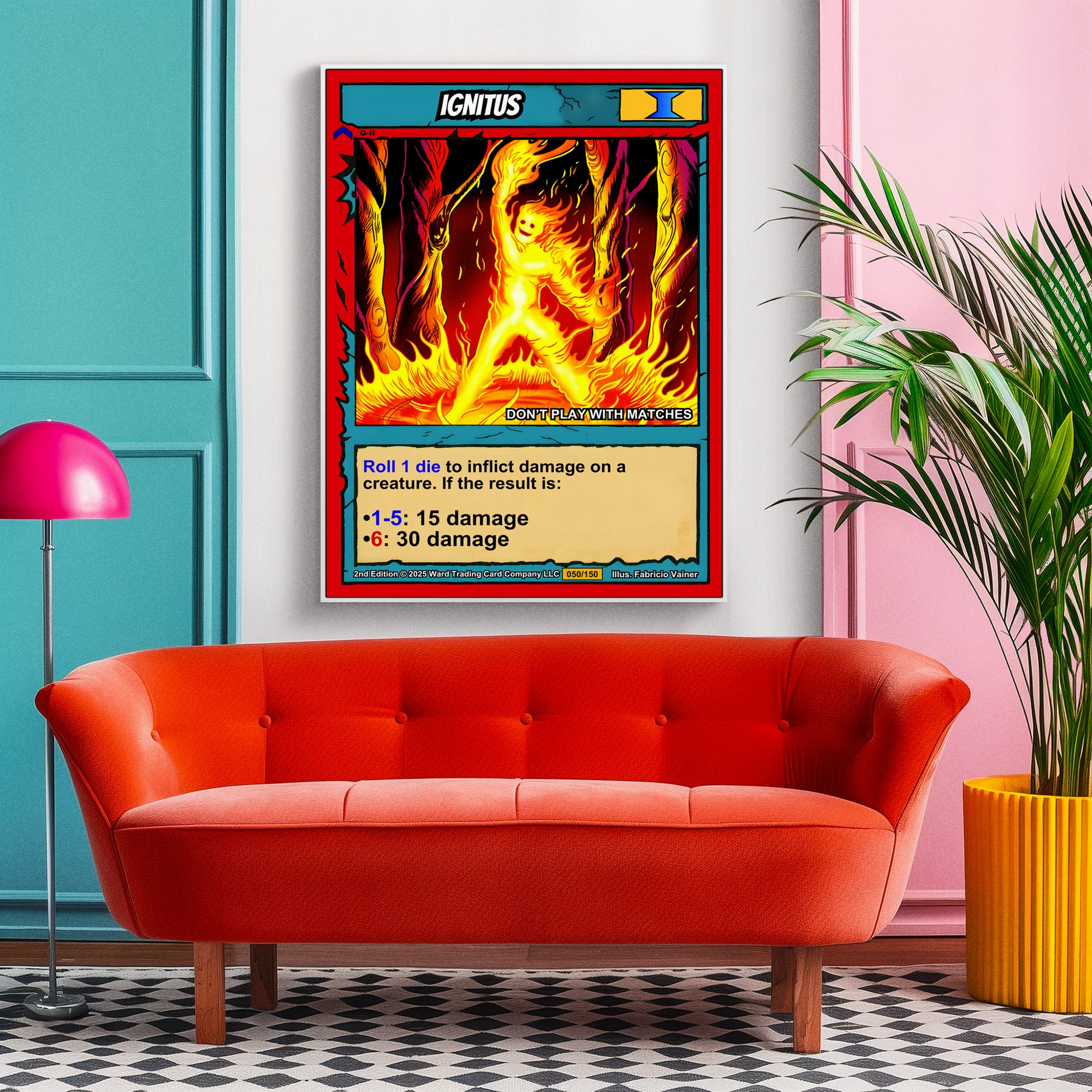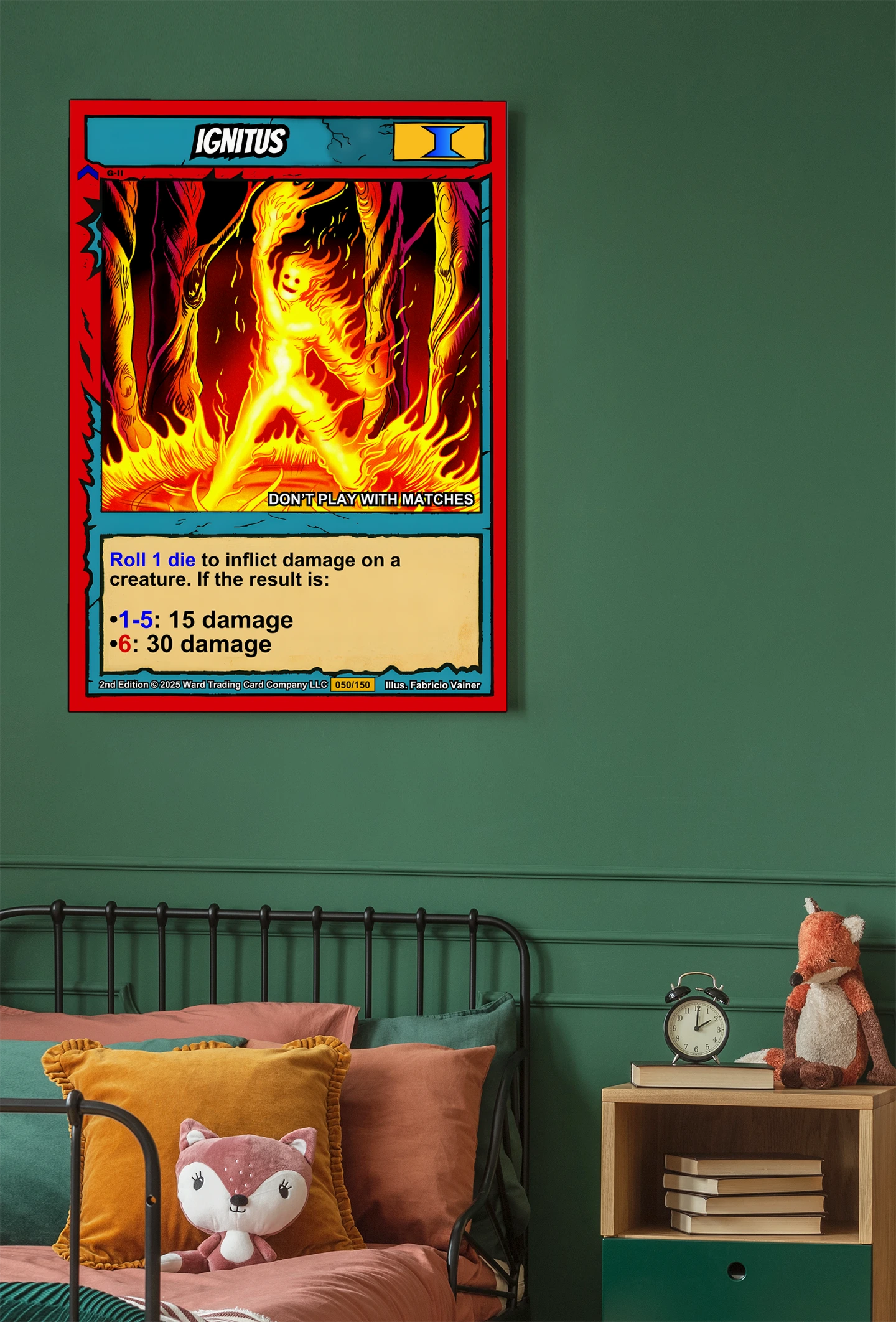 Ignitus Canvas Art Print from Ward TCG: A flame elemental with raised arms stands among burning trees in full trading card layout with red borders.