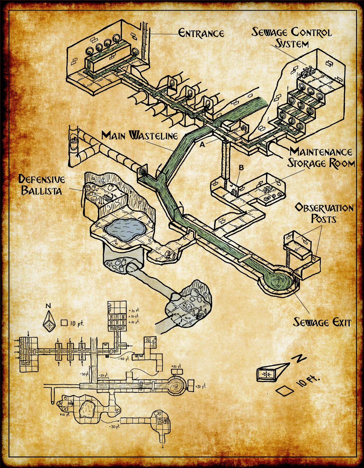 A multi-level sewer complex spreads across aged parchment in sepia-toned isometric detail. This infested sewers 1 fantasy battle map canvas print shows labeled chambers connected by a green-tinted waste channel. Notably, elevation views in the corner reveal vertical relationships between levels.