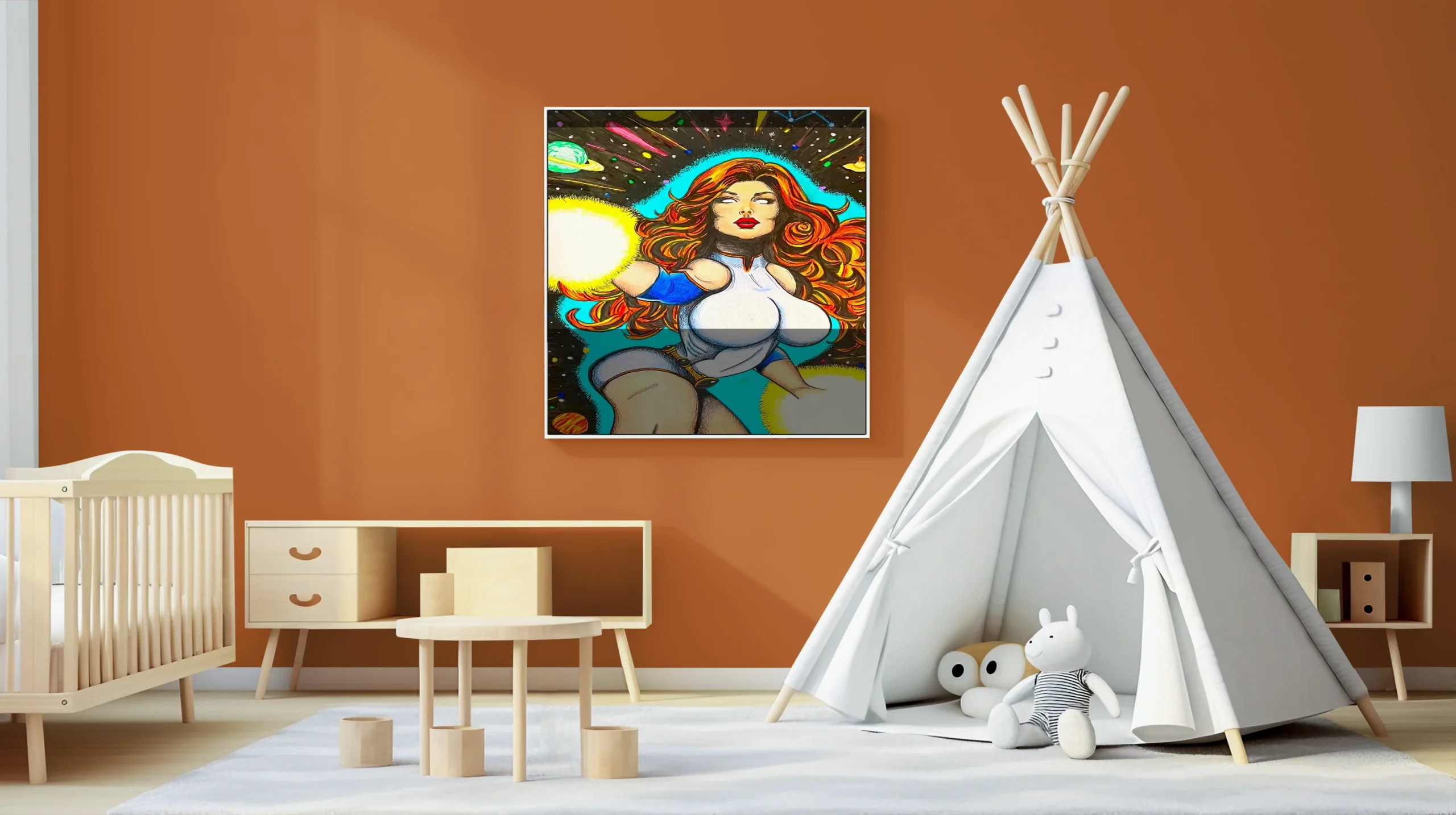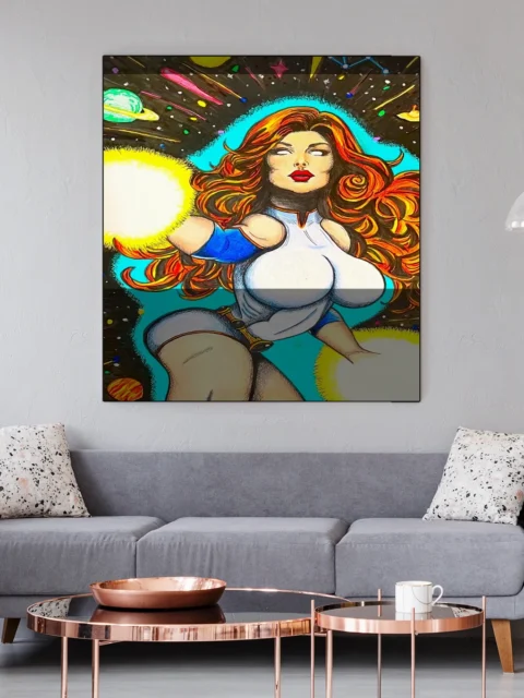 On the wall, the retro sci-fi aesthetic reads like a 1970s Marvel comic splash page. Ward TCG collectors and comic art enthusiasts recognize Vainer’s pop art influenced linework. This infinia art trading card art canvas print delivers gallery-ready superhero fantasy without the frame.