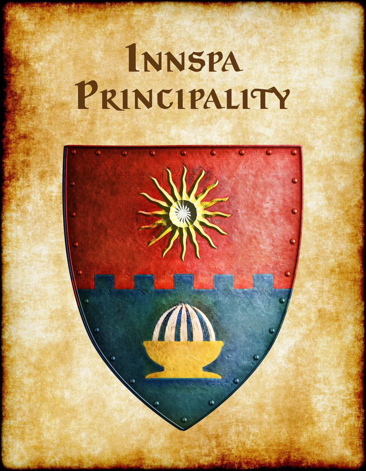 Additionally, the golden sun above represents the healing warmth of Innspa’s famed mineral springs. The chalice below holds a domed white-and-blue element symbolizing the steaming baths that define this principality. Indeed, the battlement division evokes the fortified spa-towns dotting Innspa’s borders with the Great Kingdom.