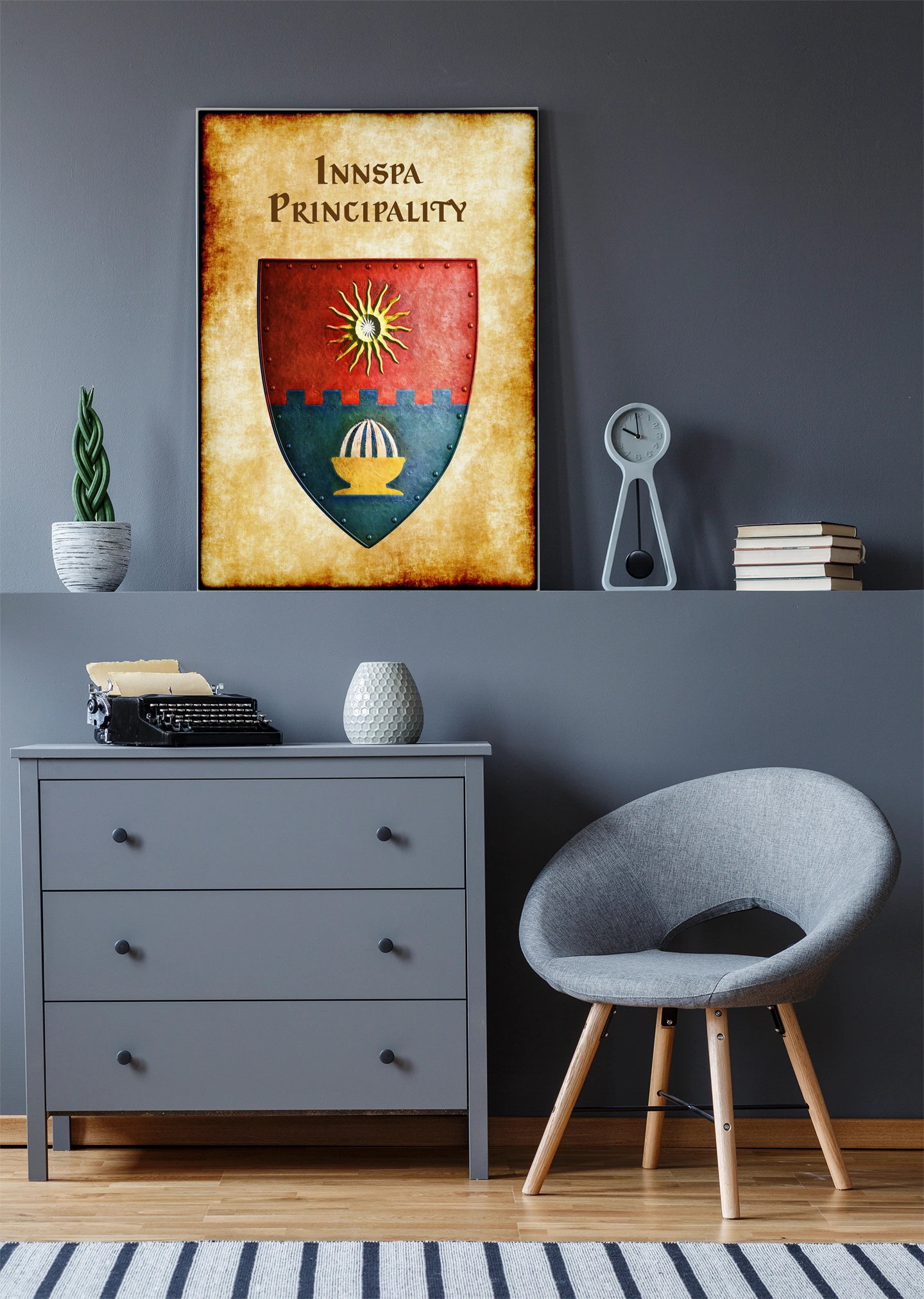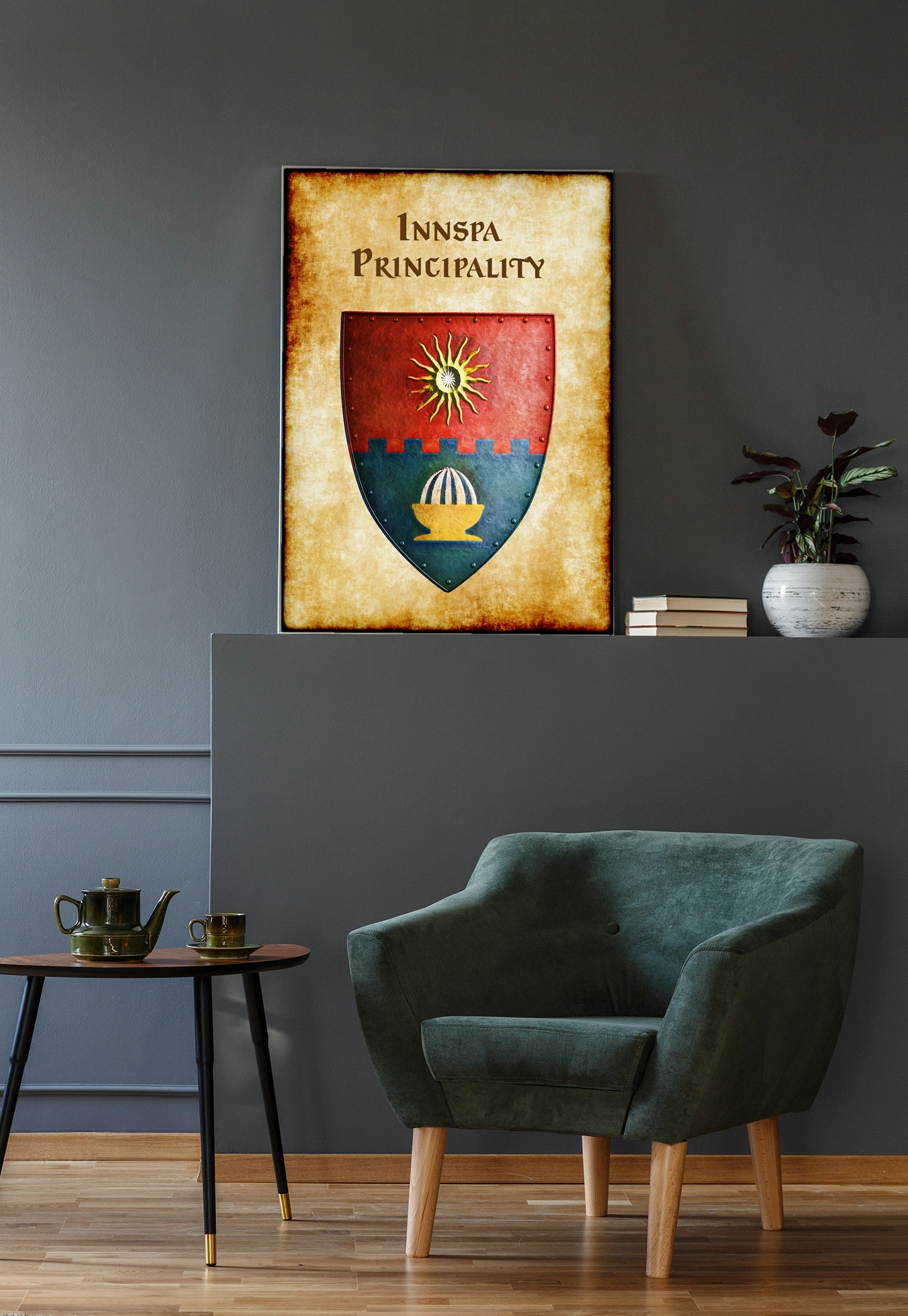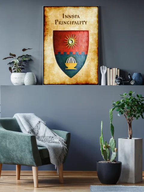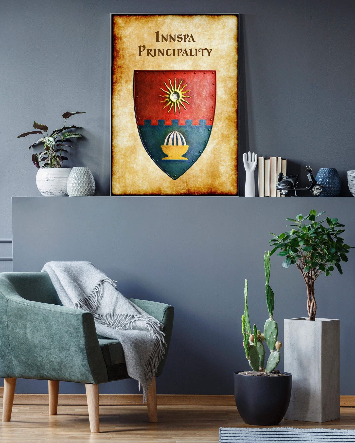 This device marks one of the Flanaess’s smallest yet most strategically positioned realms. DMs running Nyrond campaigns or Great Kingdom politics need this faction’s heraldry visible. The innspa principality Greyhawk heraldry canvas print also completes any Eastern Flanaess collection.