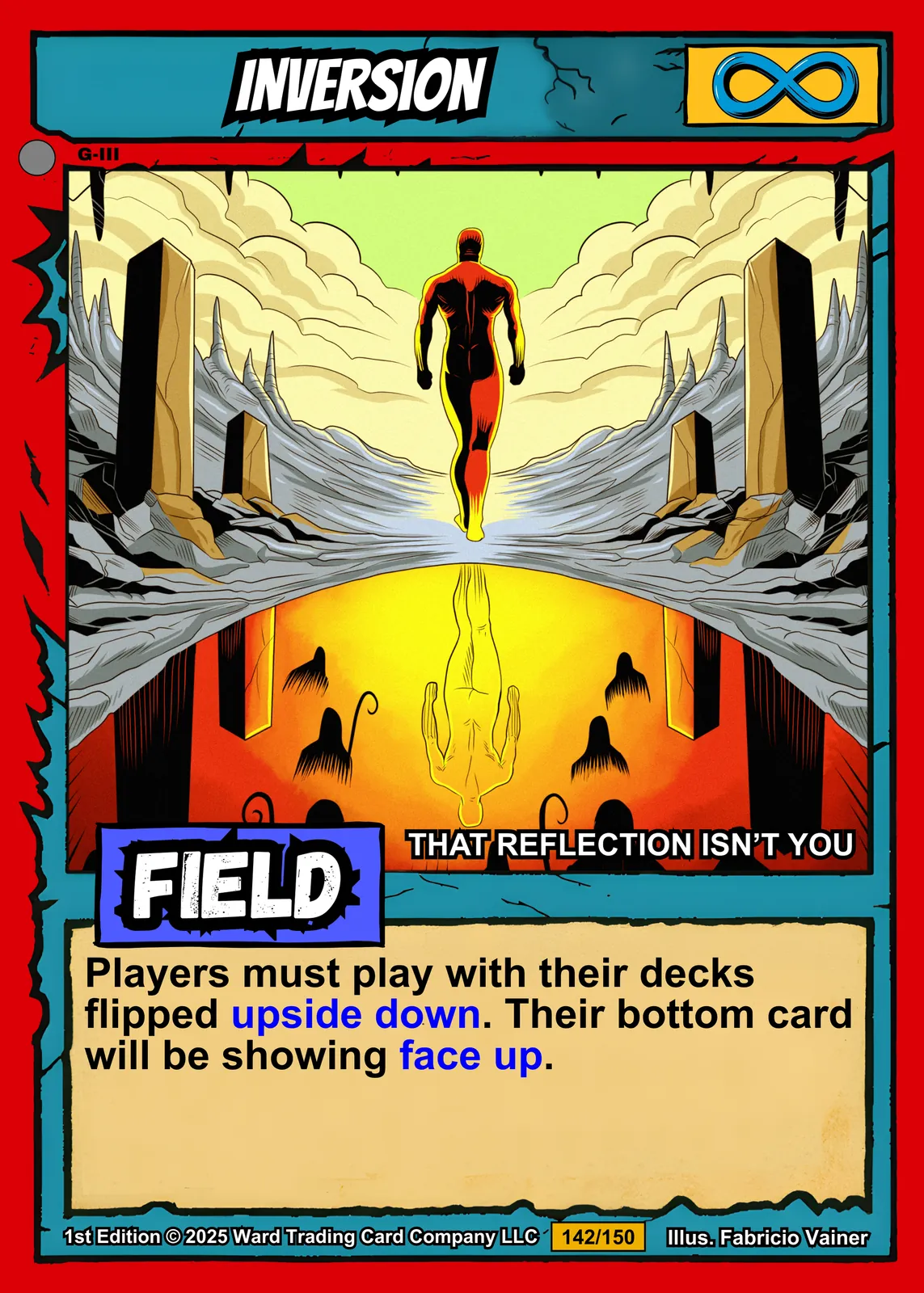 Inversion Canvas Print from Ward TCG: Mirrored humanoid figures walk through a surreal landscape of gray spires and glowing light with bold red borders.