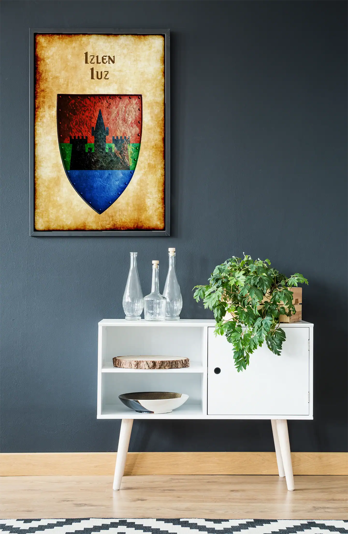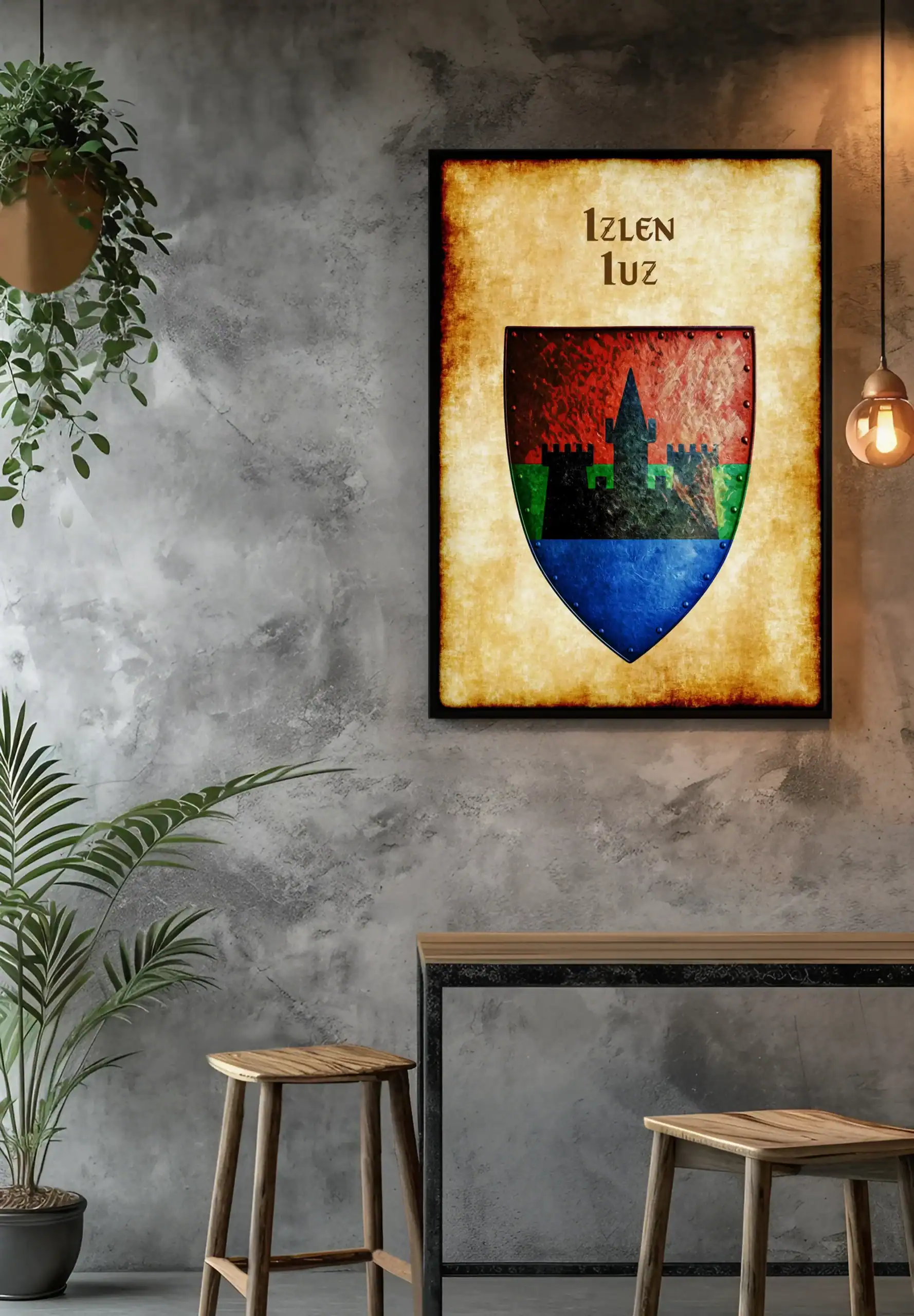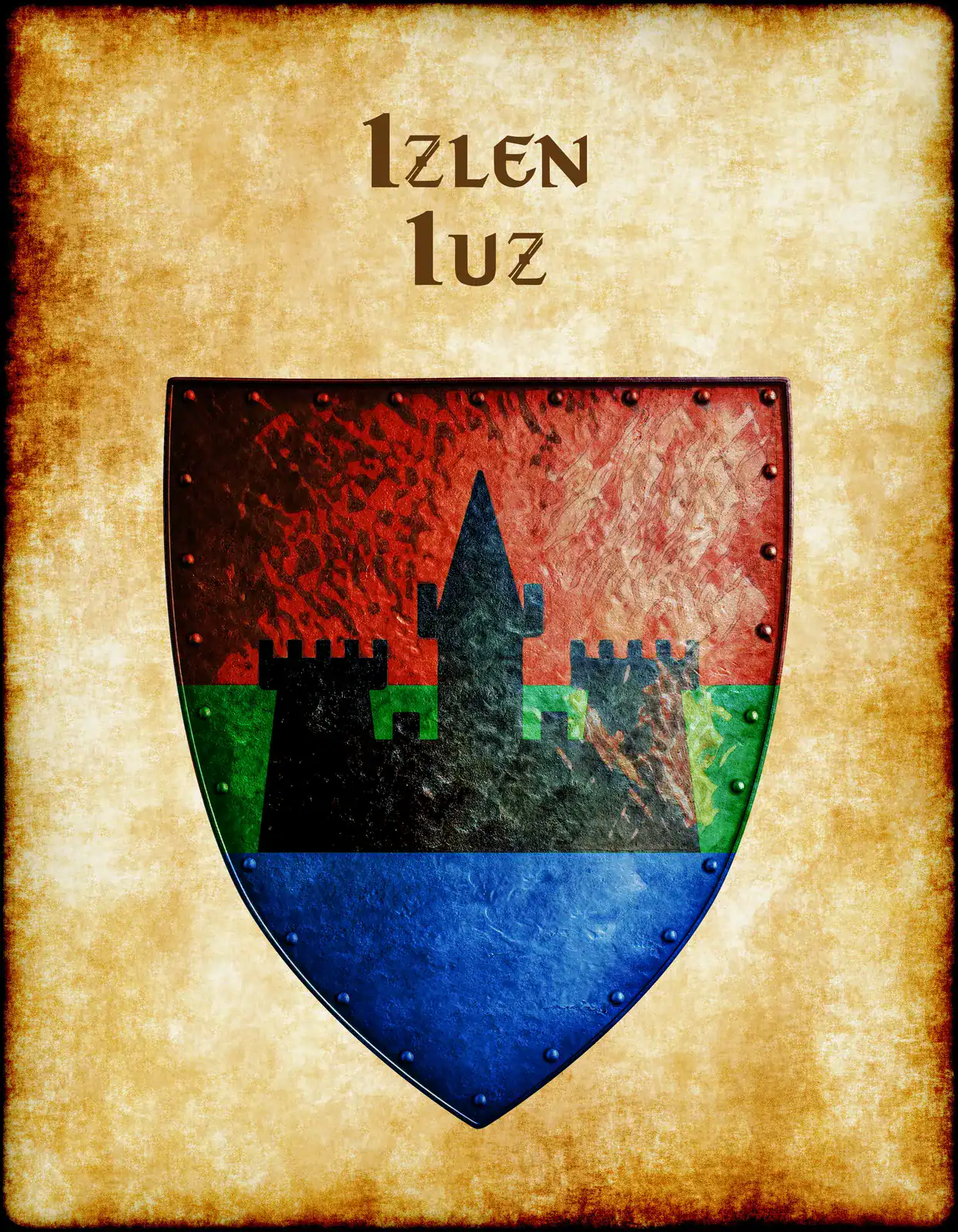 A black castle silhouette commands a tri-colored shield divided into red, green, and blue sections. This izlen iuz Greyhawk heraldry canvas print captures the weathered authority of Iuz’s realm. Notably, metallic rivets border each colored field with authentic medieval detail.