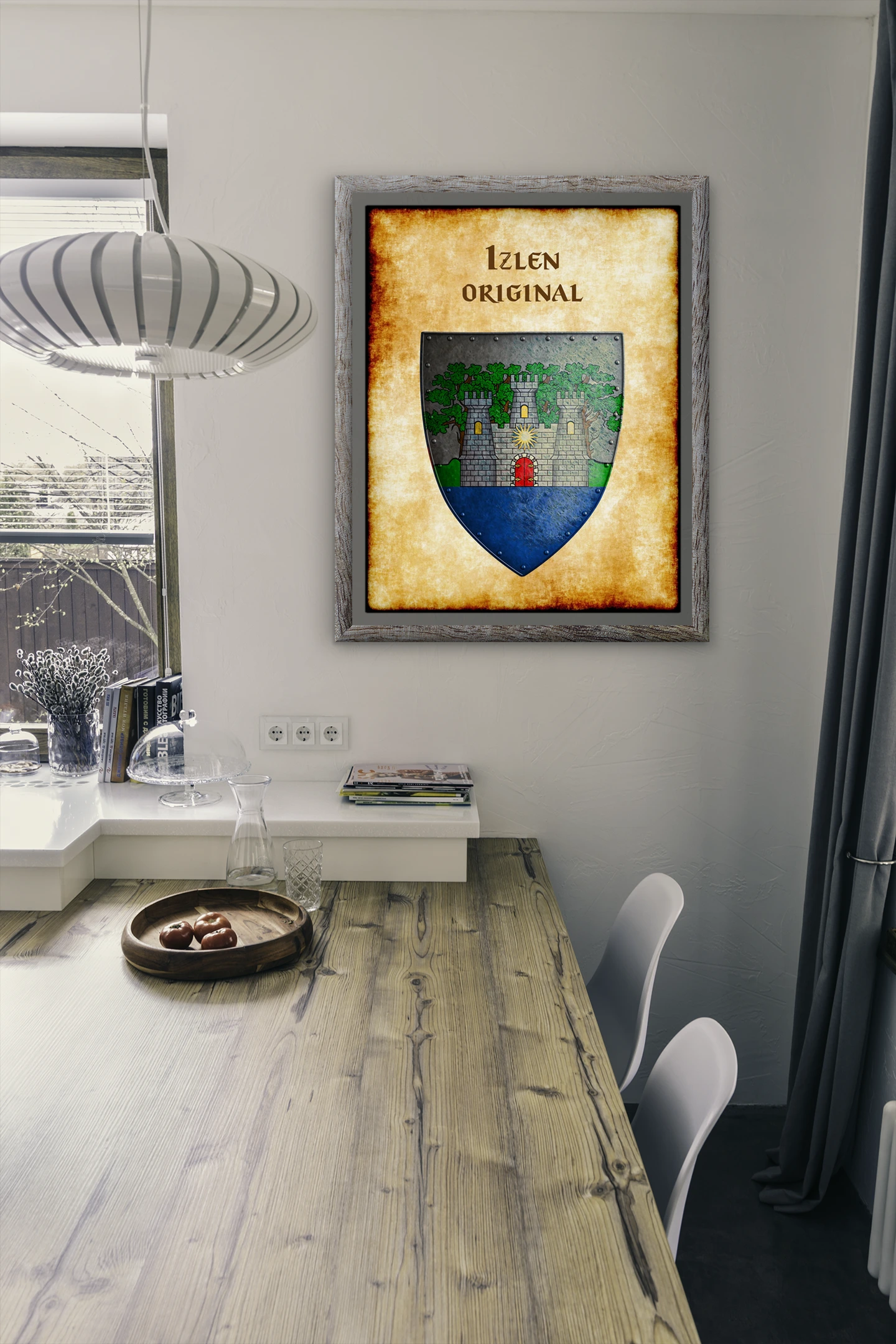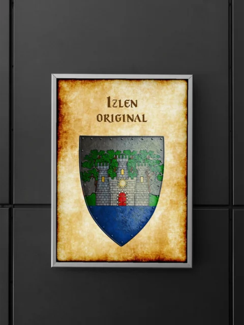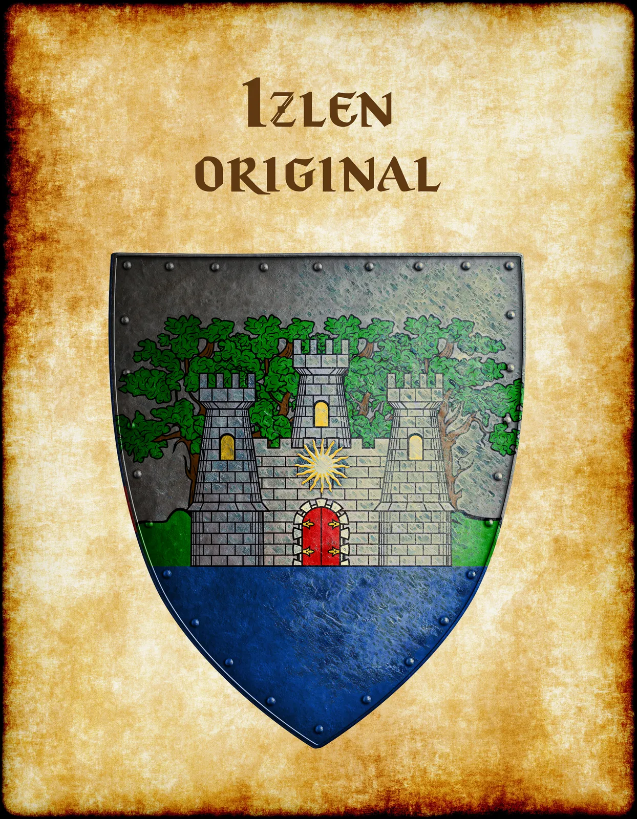 Additionally, the riveted dark blue-gray border frames the device like weathered campaign armor. Izlen’s heraldry combines architectural detail with natural elements—castle, trees, and radiant sun against divided fields. Moreover, the parchment background ages the composition with burnt edges and golden-brown tones.