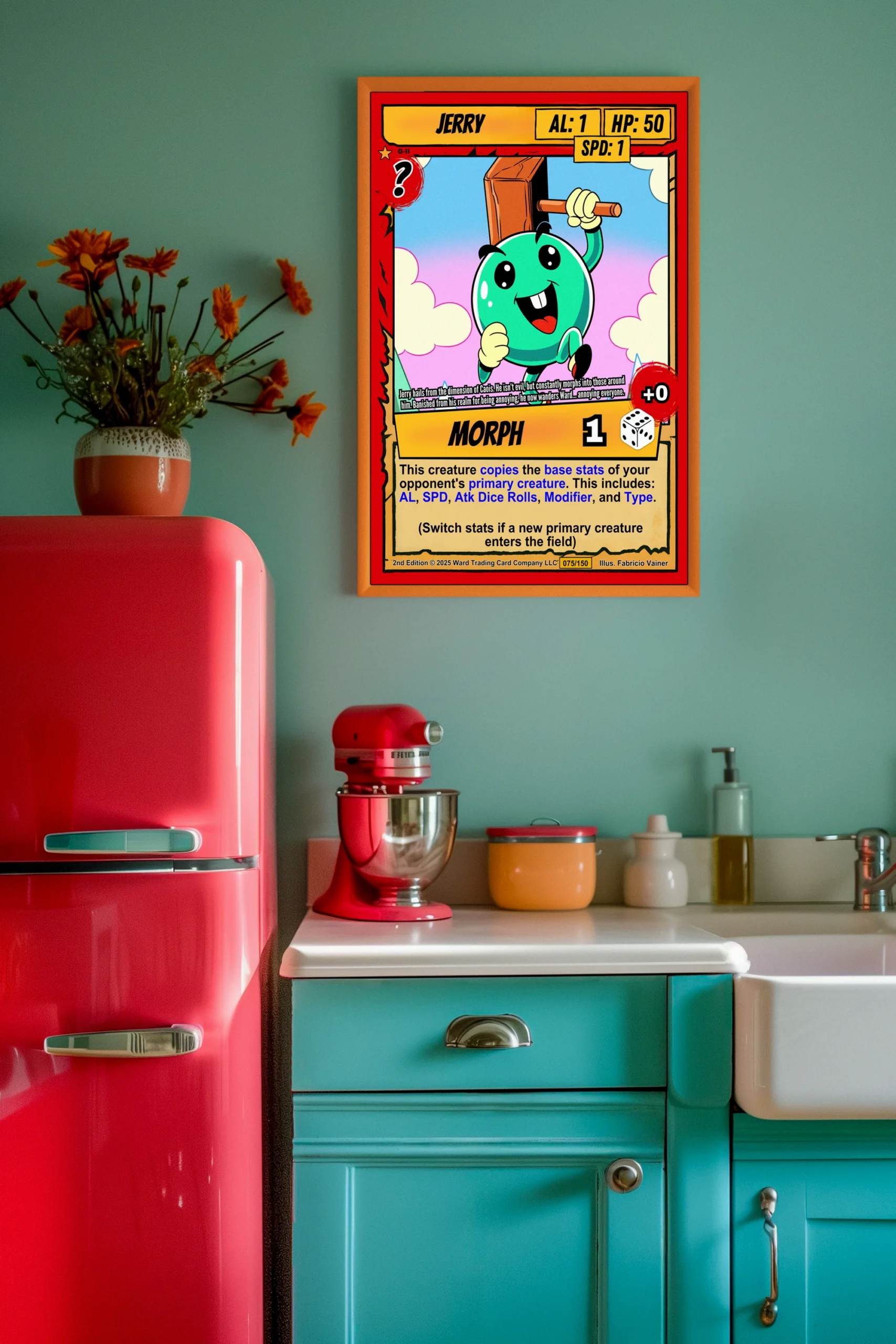 At room scale, the gradient sky and stylized clouds balance the character’s mischievous pose. Collectors of Ward TCG will recognize the card’s signature layout. The jerry trading card canvas print works best where bold colors and playful design are welcome.