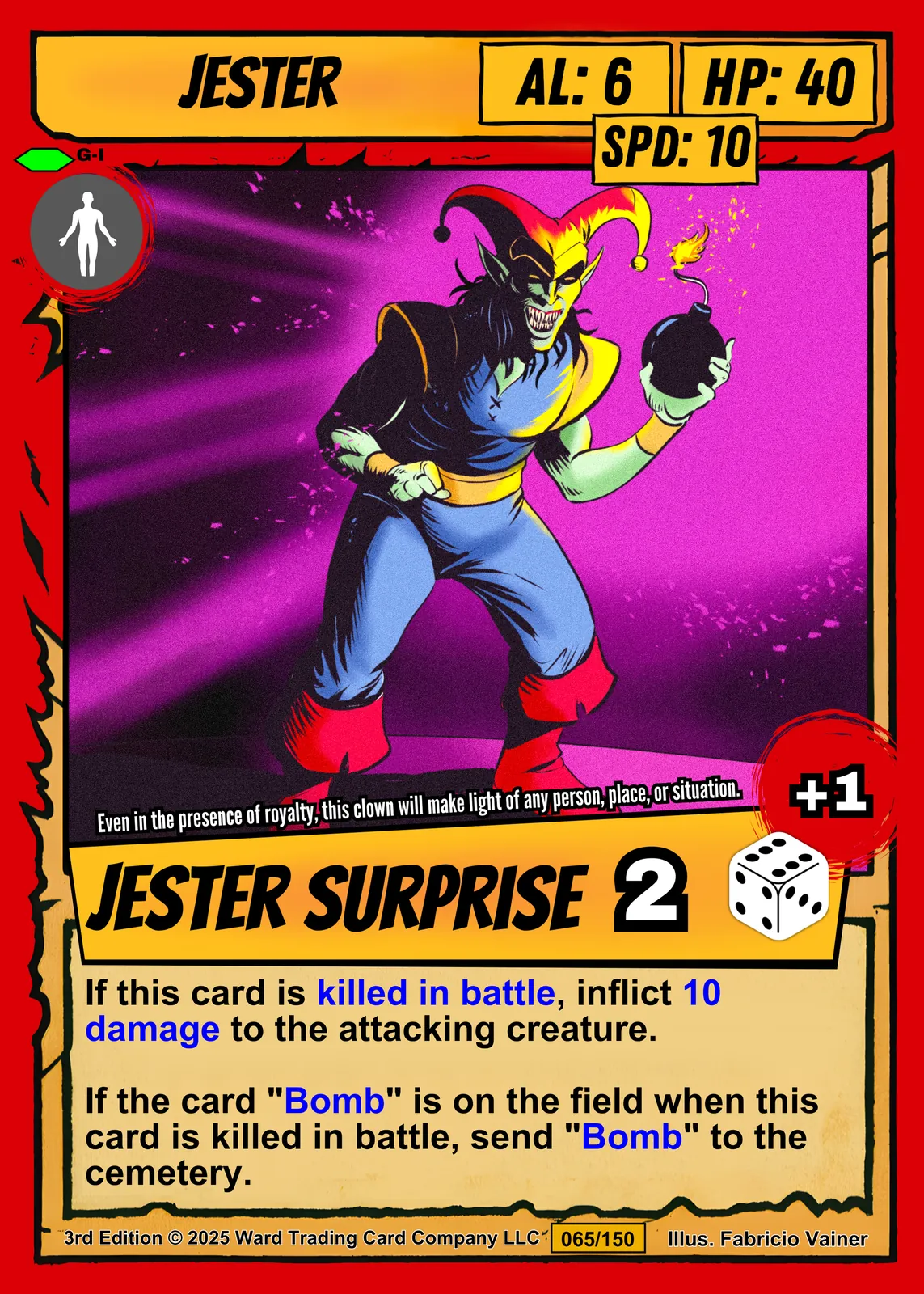 A menacing jester grins with razor-sharp teeth beneath a yellow and purple pointed cap. This jester trading card canvas print captures Fabricio Vainer’s bold cel-shaded illustration from Ward TCG. Notably, the green-tinted skin contrasts sharply against the cosmic purple background.