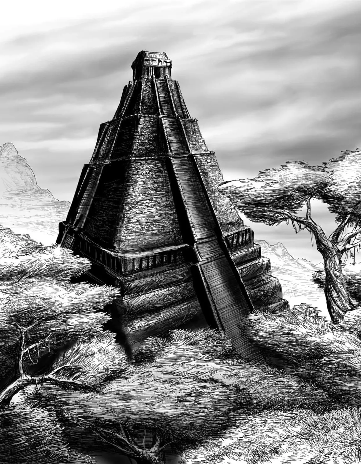 Stone tiers climb sharply, guiding the eye upward through fractured steps and shadowed landings. Additionally, angled lines and dense foliage create forward momentum, pulling attention toward the summit where secrets wait. The composition balances mass and ascent, giving the illustration a tense, deliberate motion.