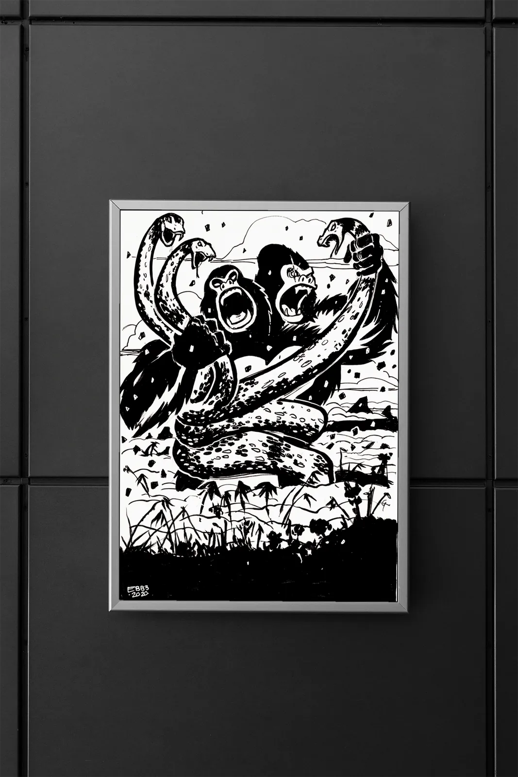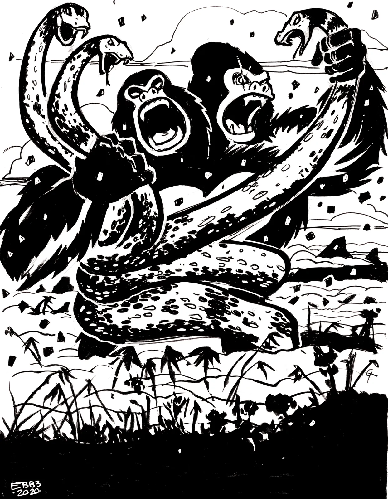 Crushing fists and whipping bodies drive the composition forward in violent arcs. Additionally, overlapping forms and angled limbs create relentless motion, forcing the eye across the struggle. Each creature presses inward, tightening the scene and heightening tension as dominance remains fiercely contested.