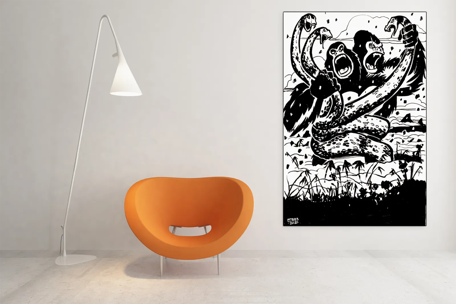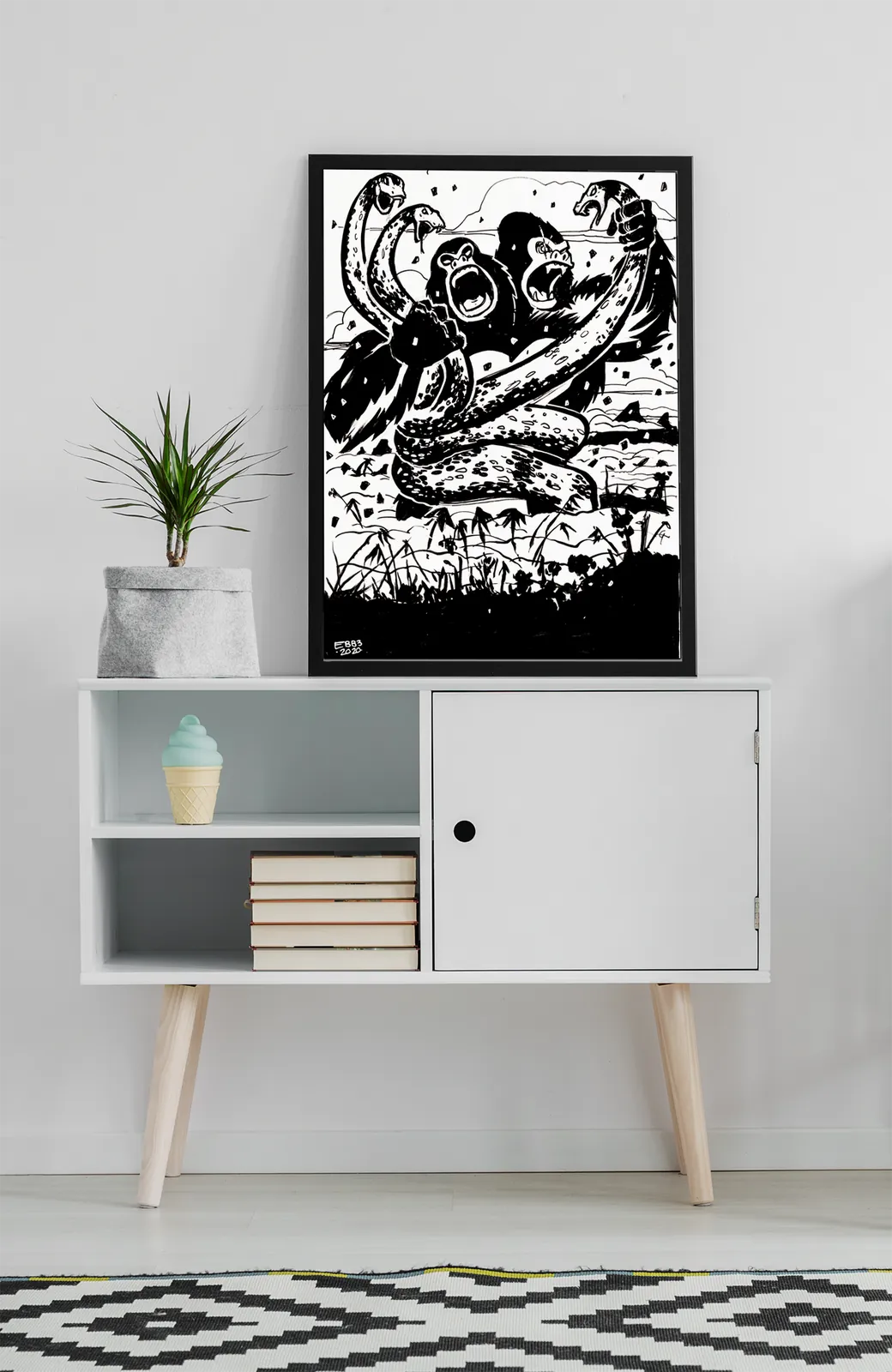 Heavy blacks slam against stark whites to amplify scale and aggression. However, the limited palette sharpens impact rather than softening it, making every blow feel decisive. Consequently, the Kaiju Battle fantasy canvas art leaves a lasting impression of mythic violence and unstoppable force.