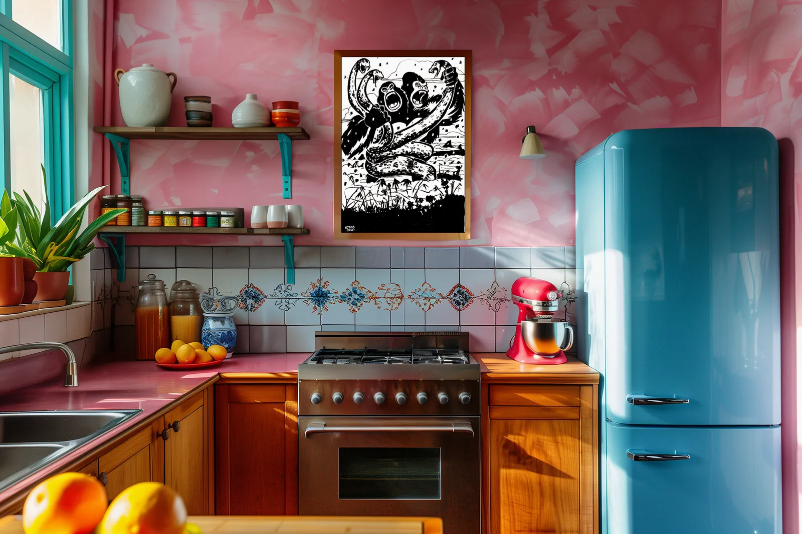 Kaiju Battle erupts as colossal beasts clash amid shattered ground and flying debris. Twin apes roar while massive serpents coil and strike, turning the battlefield into chaos. Moreover, the Kaiju Battle fantasy canvas art conveys overwhelming threat, capturing the instant where raw power and fury collide without restraint.