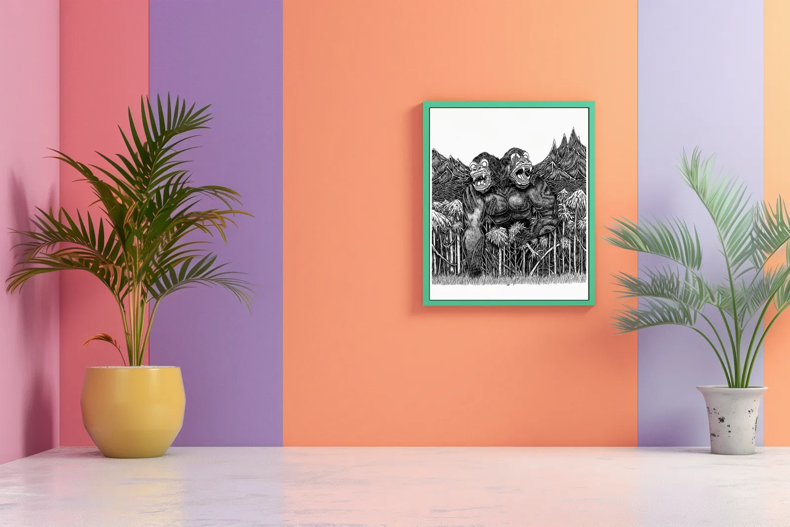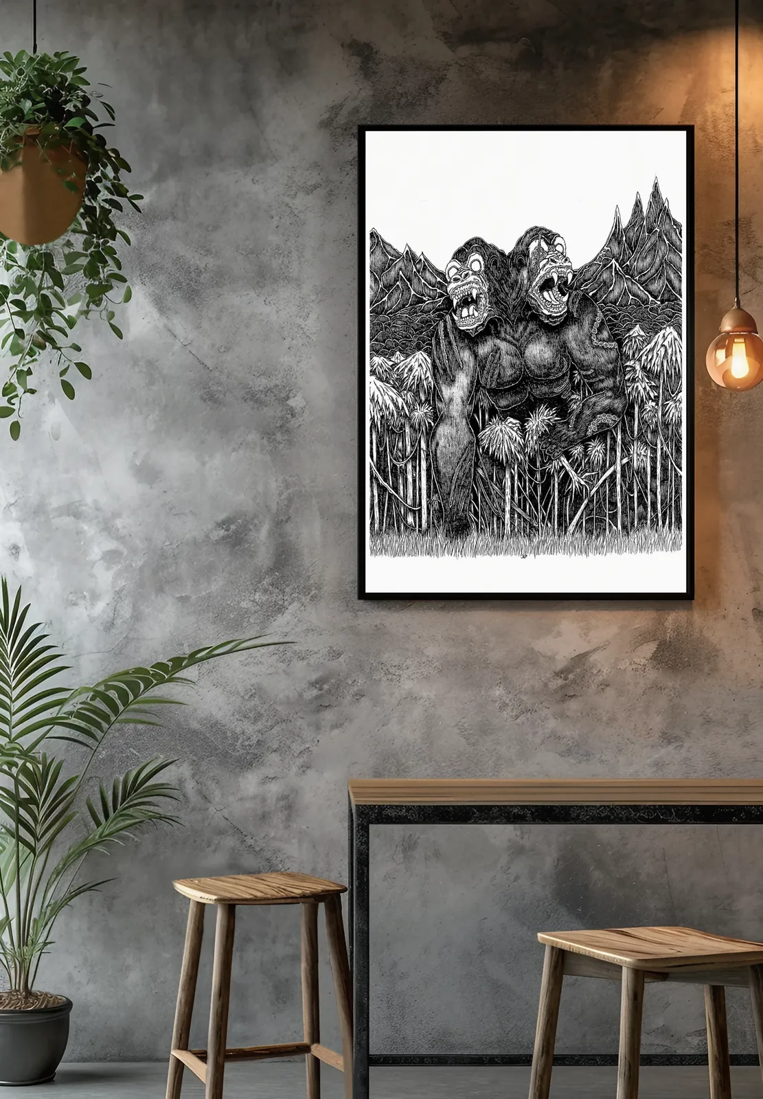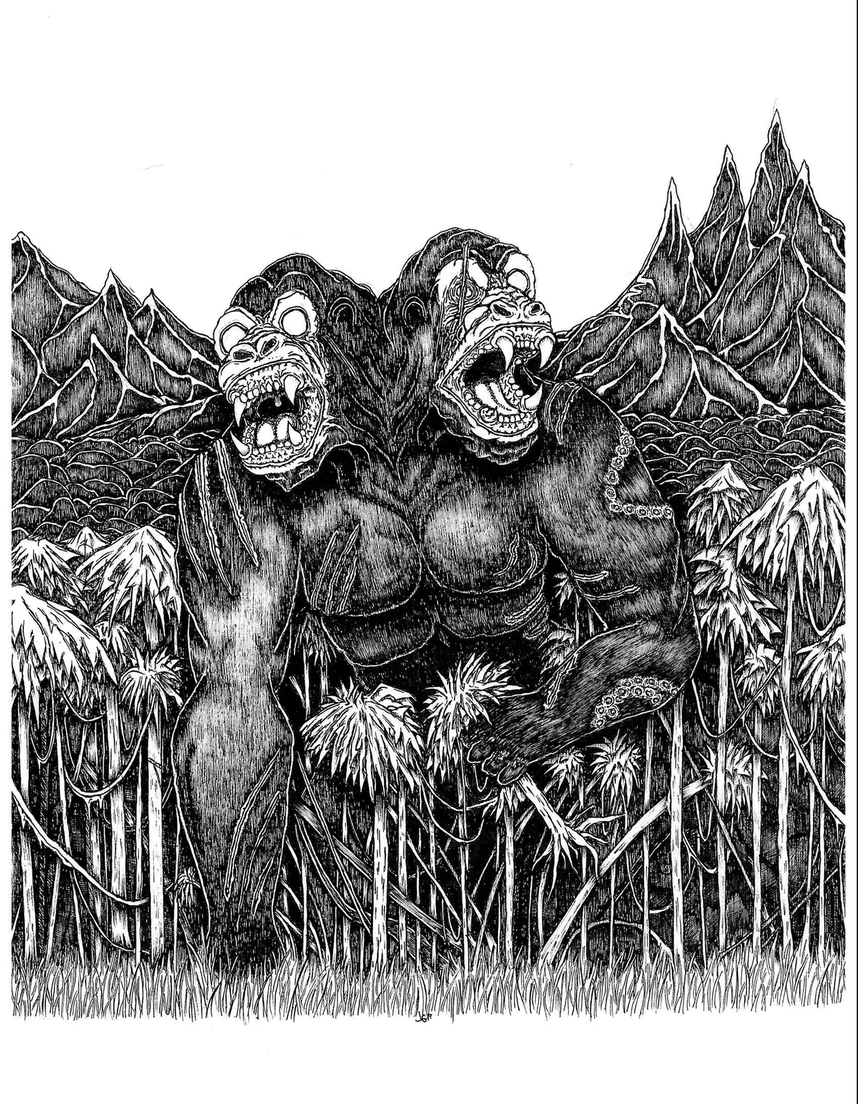 Both torsos drive forward together, forcing motion through tangled foliage and broken ground. Additionally, the mirrored heads and offset arms create brutal symmetry, pulling the eye across the confrontation while tightening the sense of impending violence.