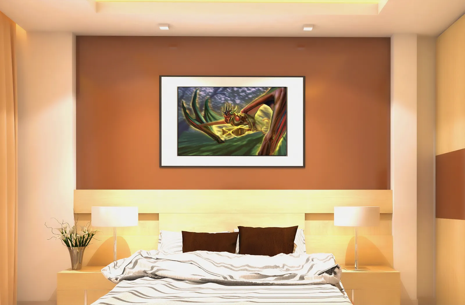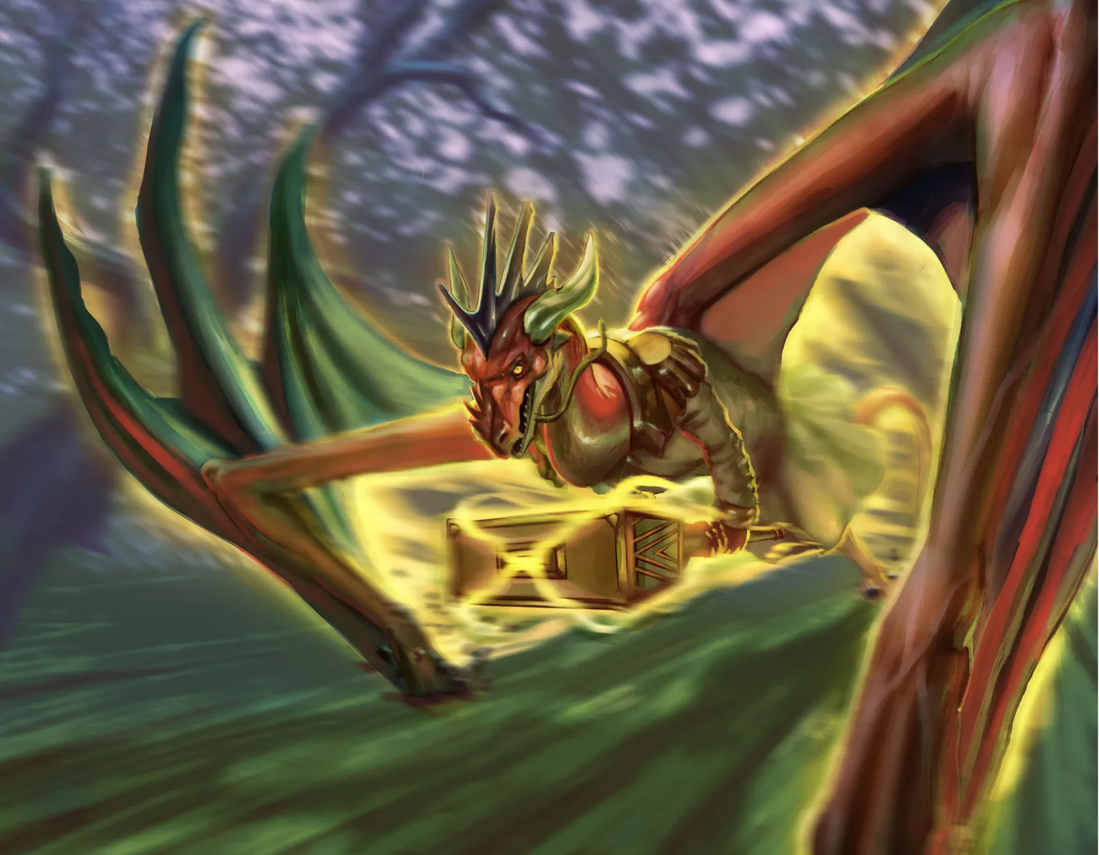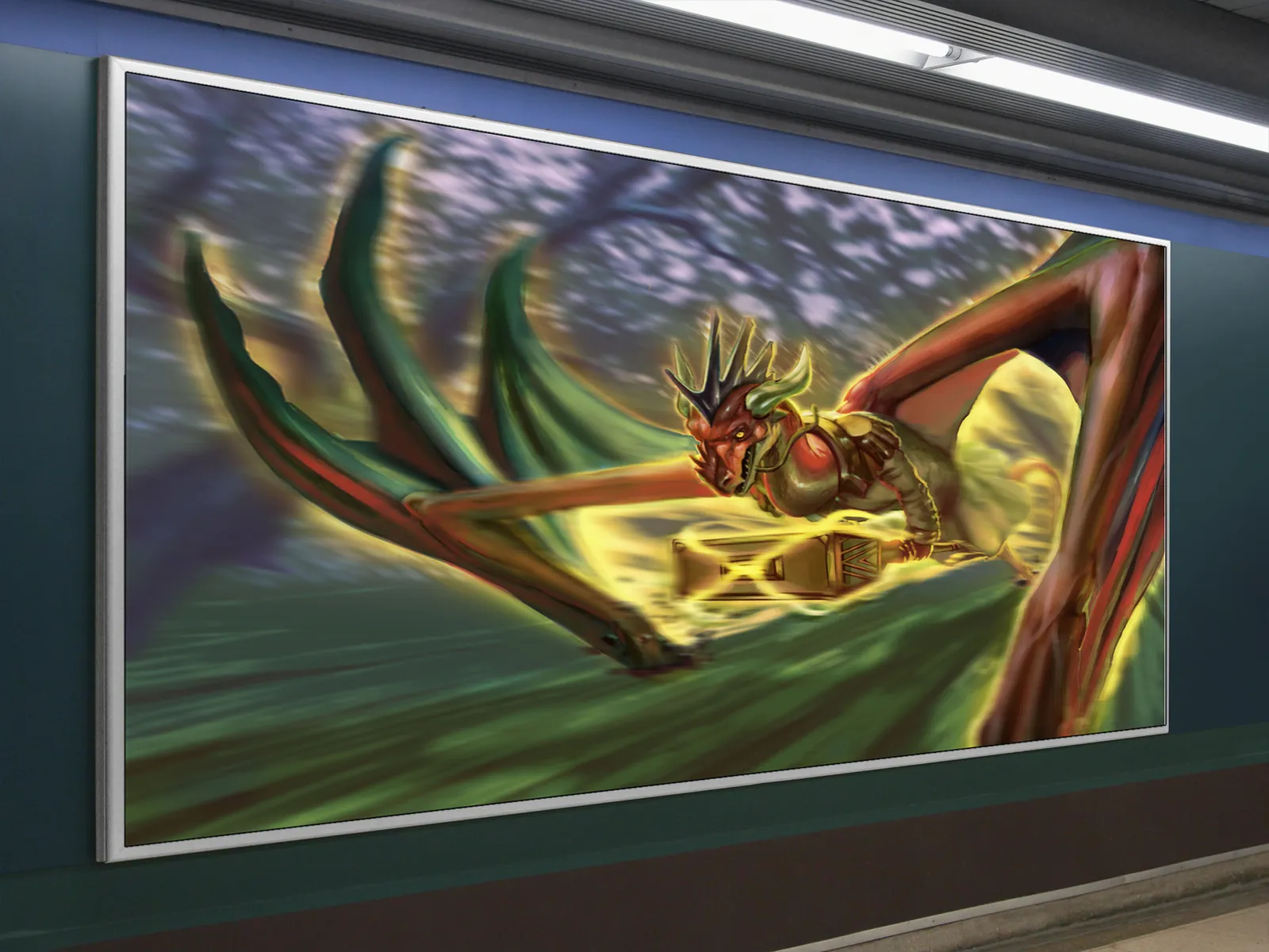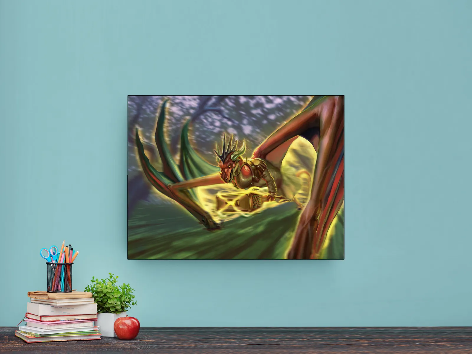 Kaodro Sieguh captures a dragon in rapid flight while guarding a glowing arcane relic. Printed on fine art canvas, it delivers motion and mysticism with a focused visual pull.