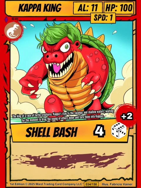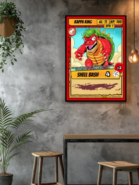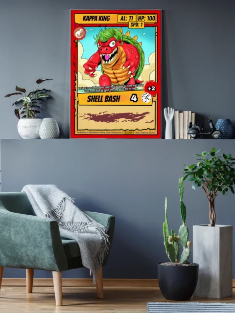 Ward TCG collectors recognize the Shell Bash ability bar and dinosaur emblem icon from across a room. This kappa king trading card canvas print speaks directly to players who remember facing this bruiser in competitive matches. The card numbering 034/150 and artist credit anchor the piece in official game history.
