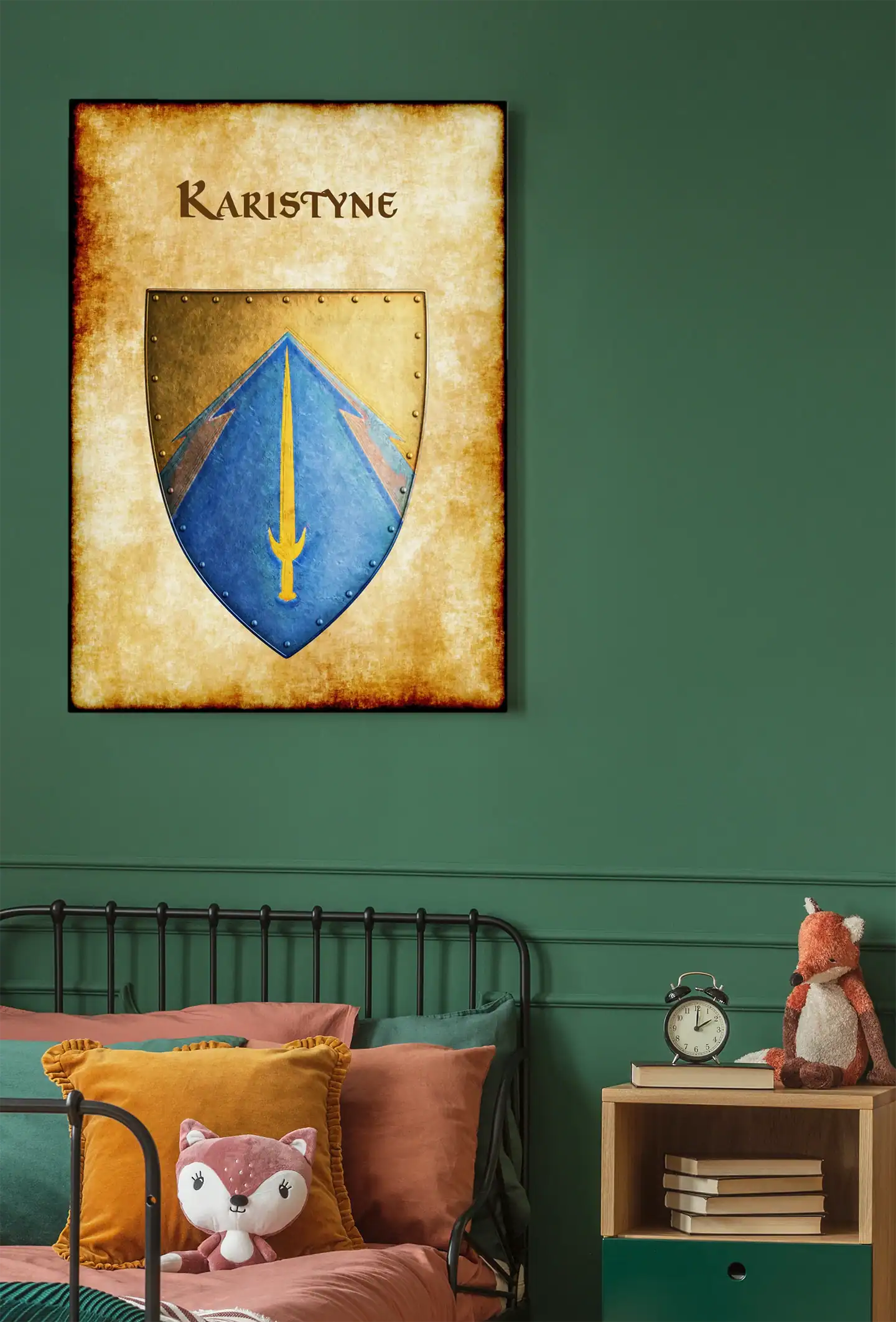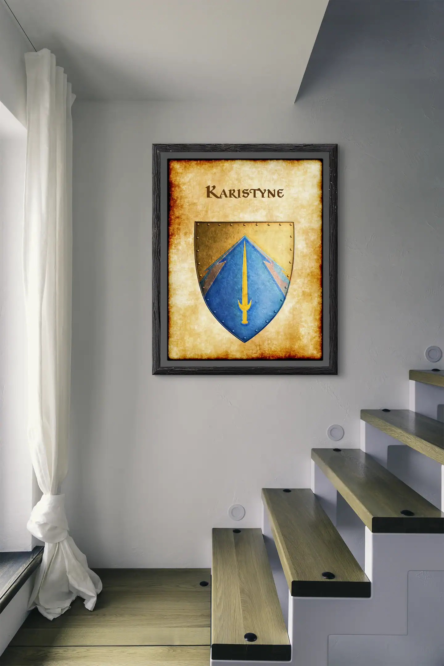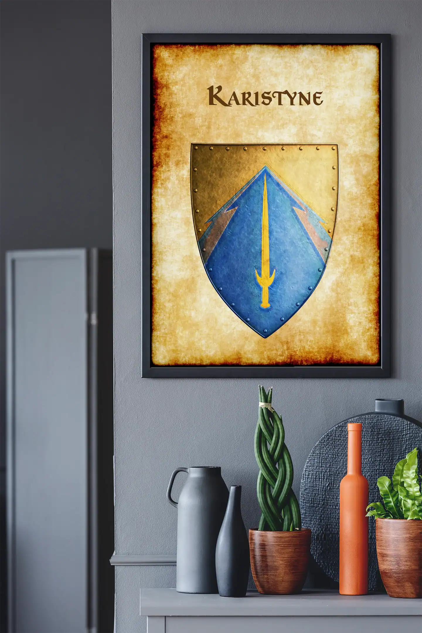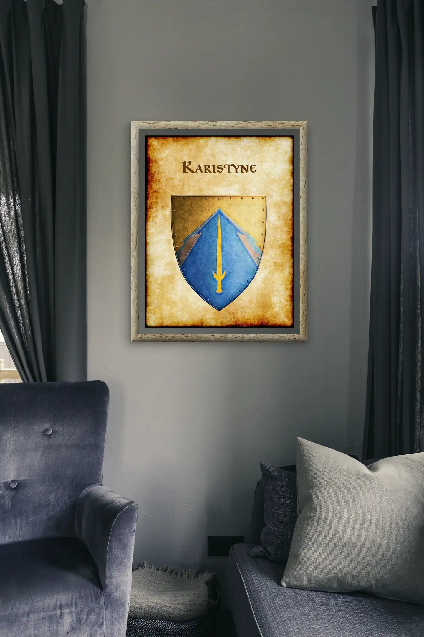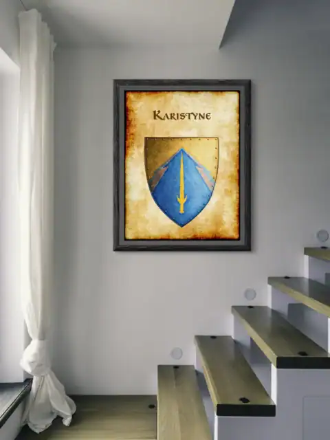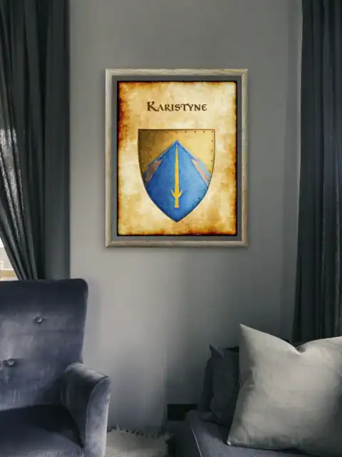A golden sword divides the azure field of Karistyne’s heraldic device. This karistyne Greyhawk heraldry canvas print displays the realm’s martial heritage clearly. Notably, crossed timber beams frame the blade against weathered parchment.