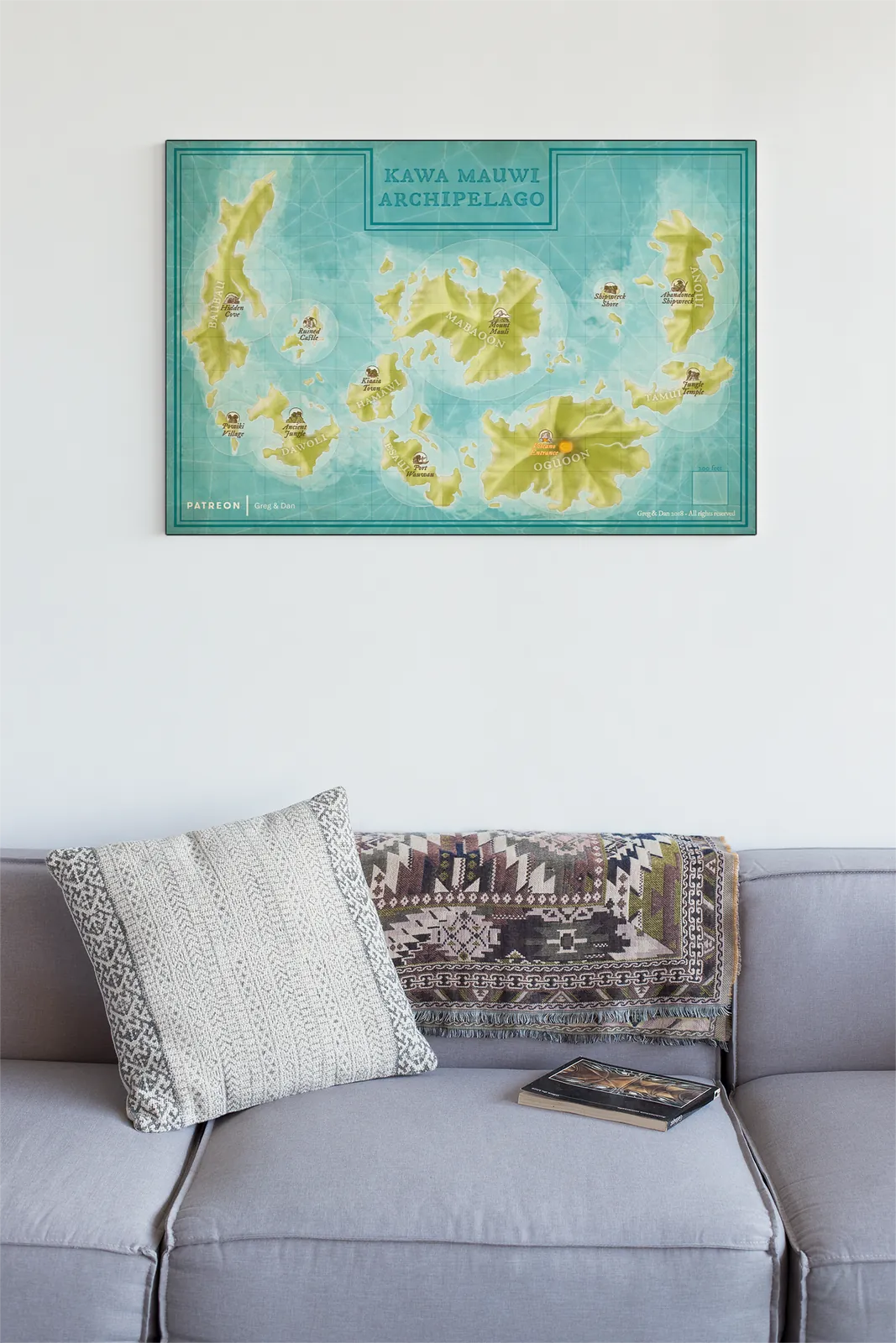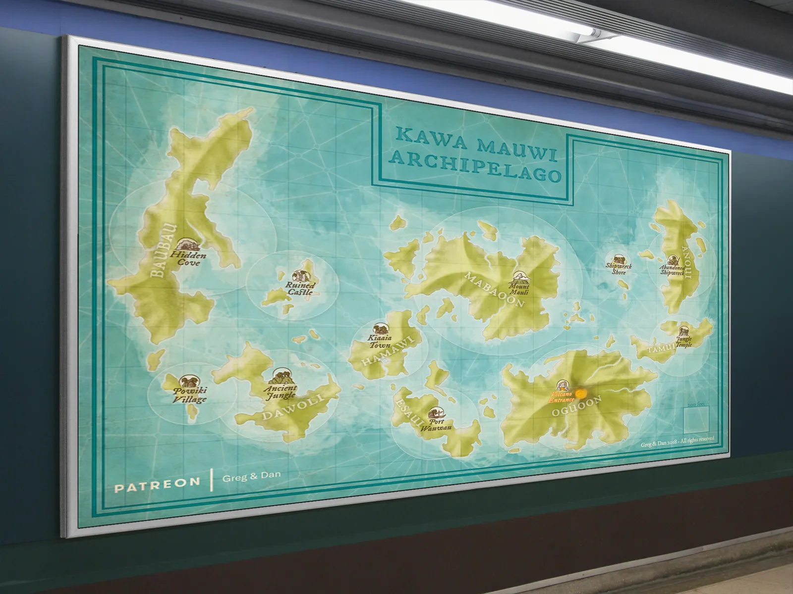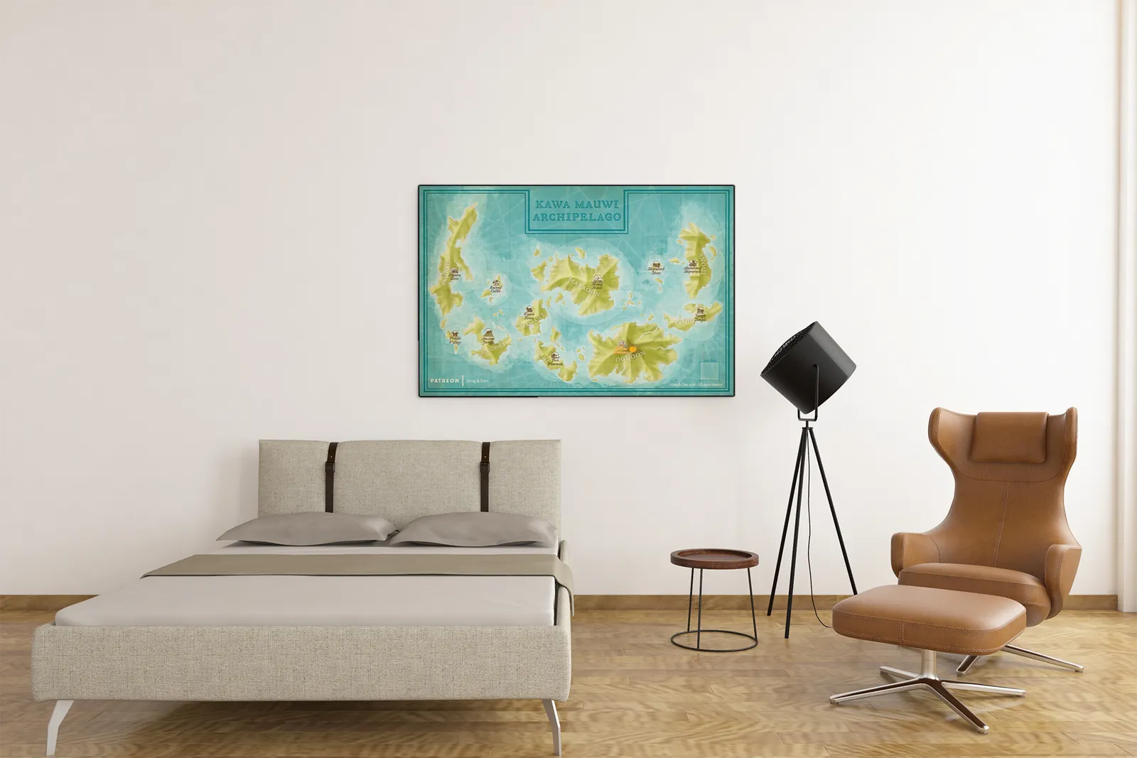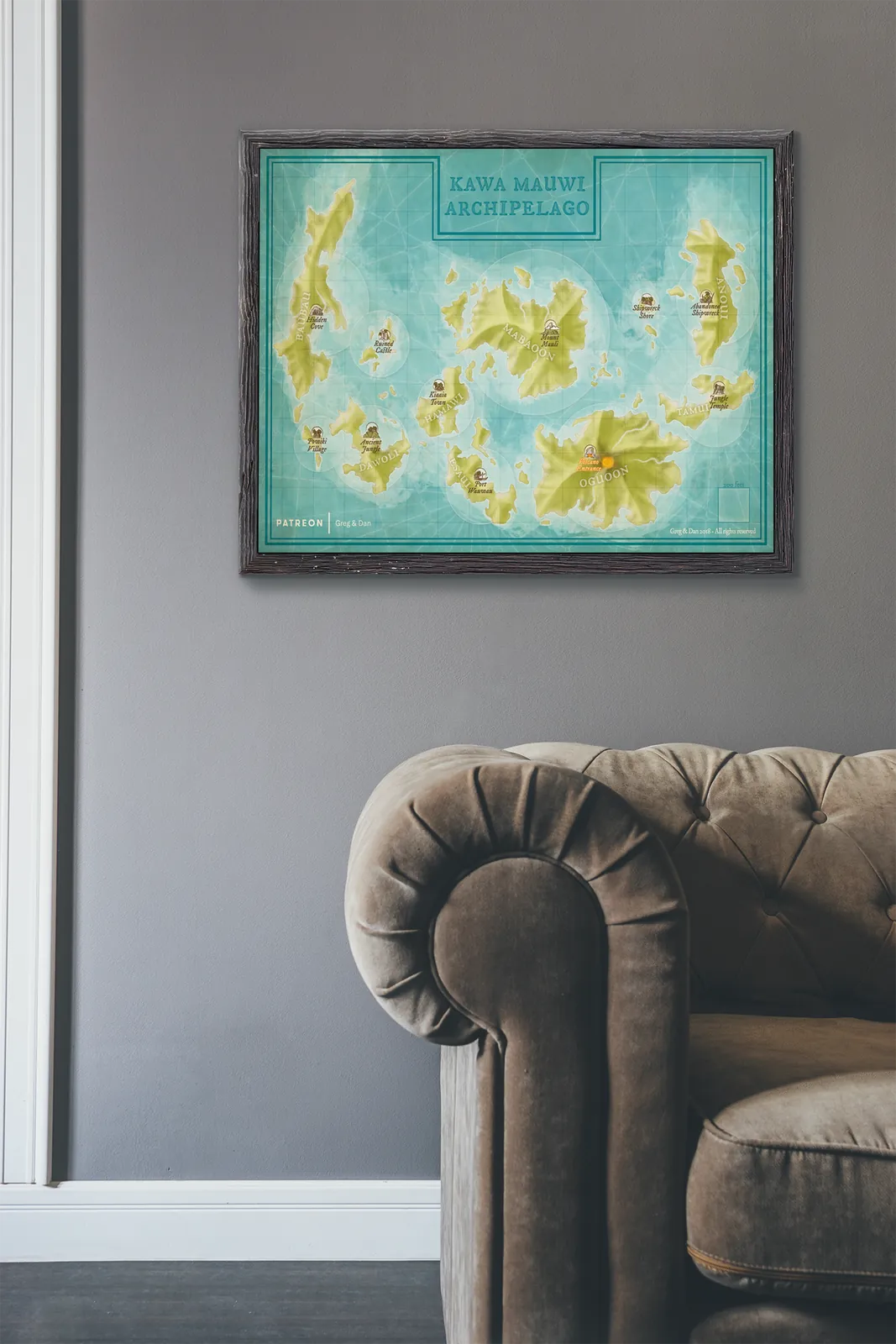 Finally, the Kawa Mauwi Archipelago Fantasy Map functions equally well as a practical reference and a display piece. Above all, it supports worldbuilders who need a believable island network while offering a visually balanced design suitable for long-term wall display.