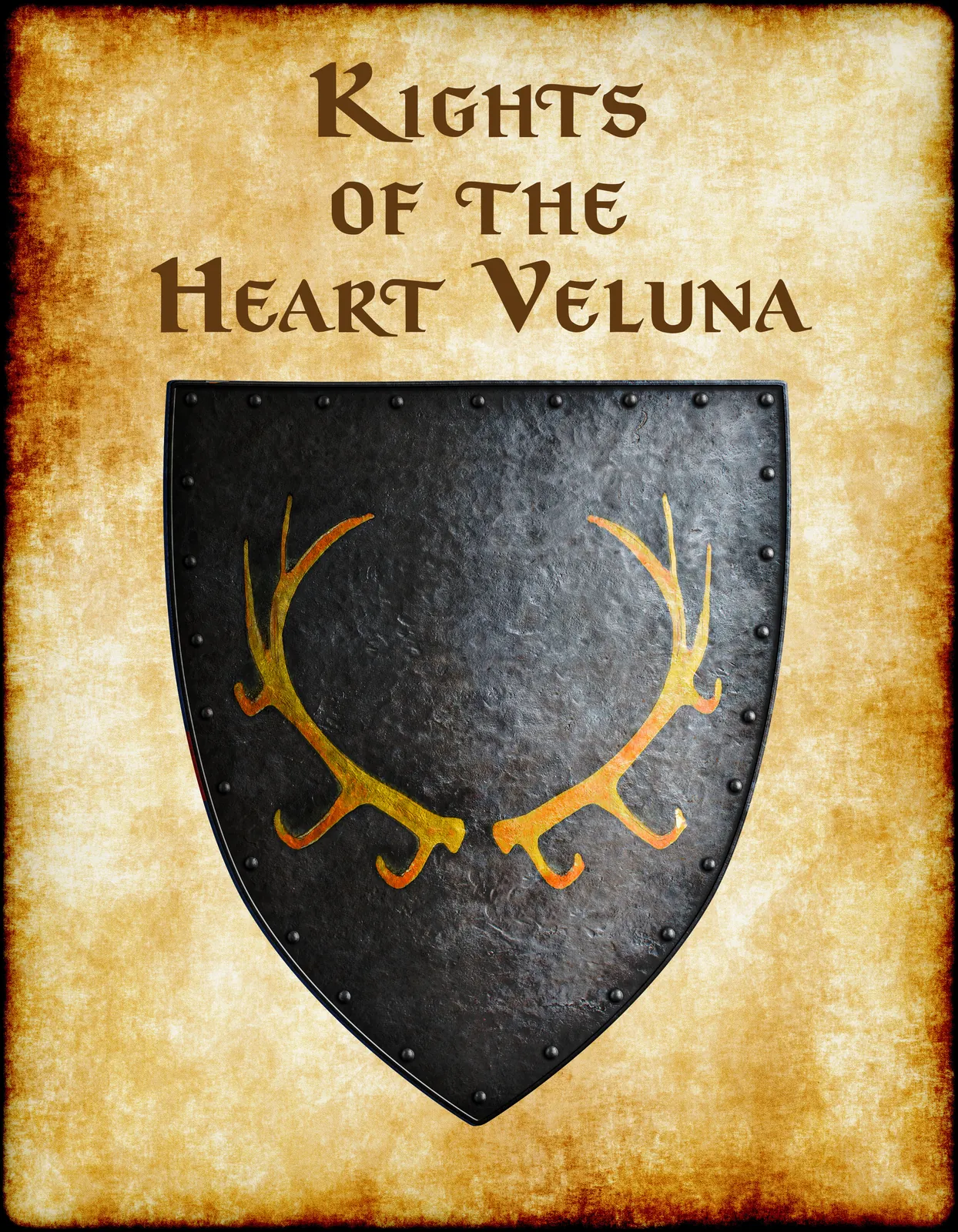 Also, aged parchment backing frames the shield with darkened, burnt edges. The riveted border suggests battle-tested construction. Textured brushwork adds medieval manuscript depth throughout the heraldic device.