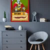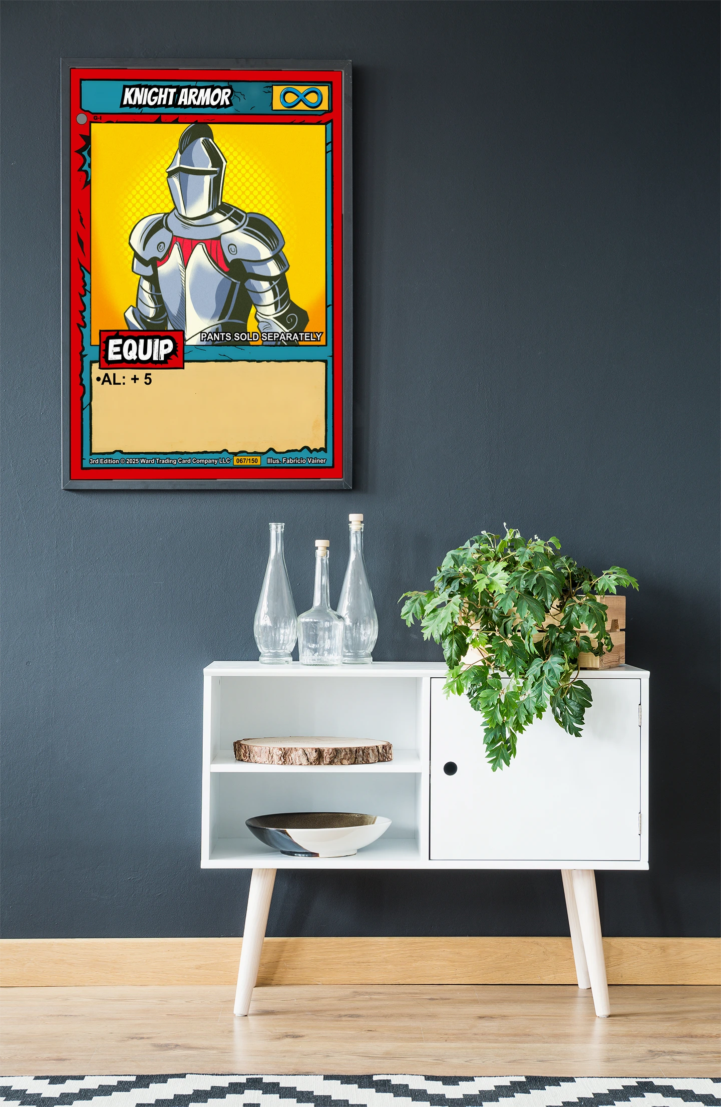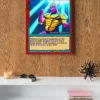 This piece anchors a game room wall beside other Ward TCG equipment prints. Indeed, the yellow background contrasts sharply with darker card art nearby.