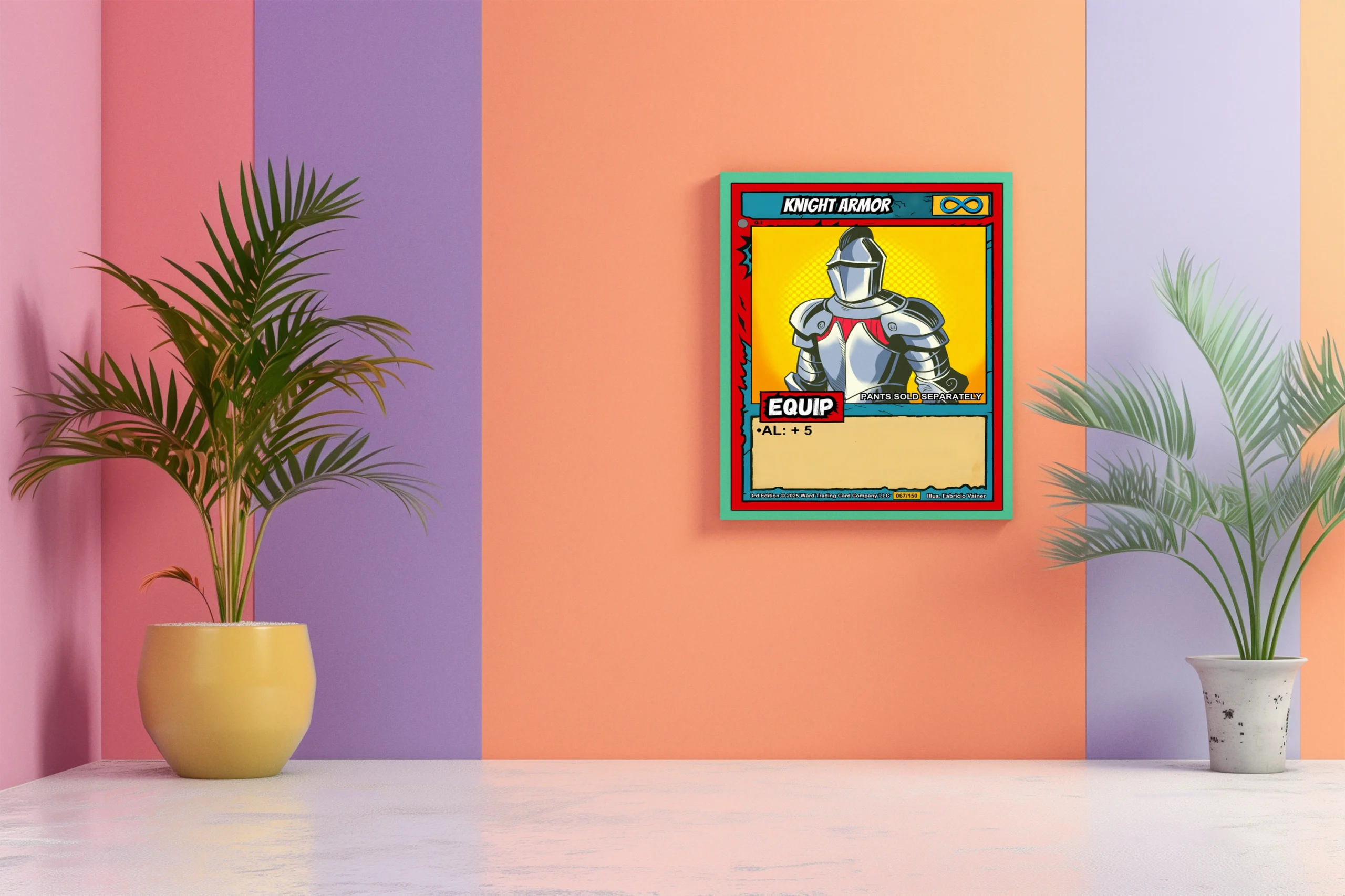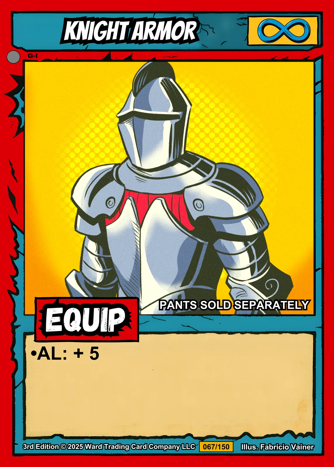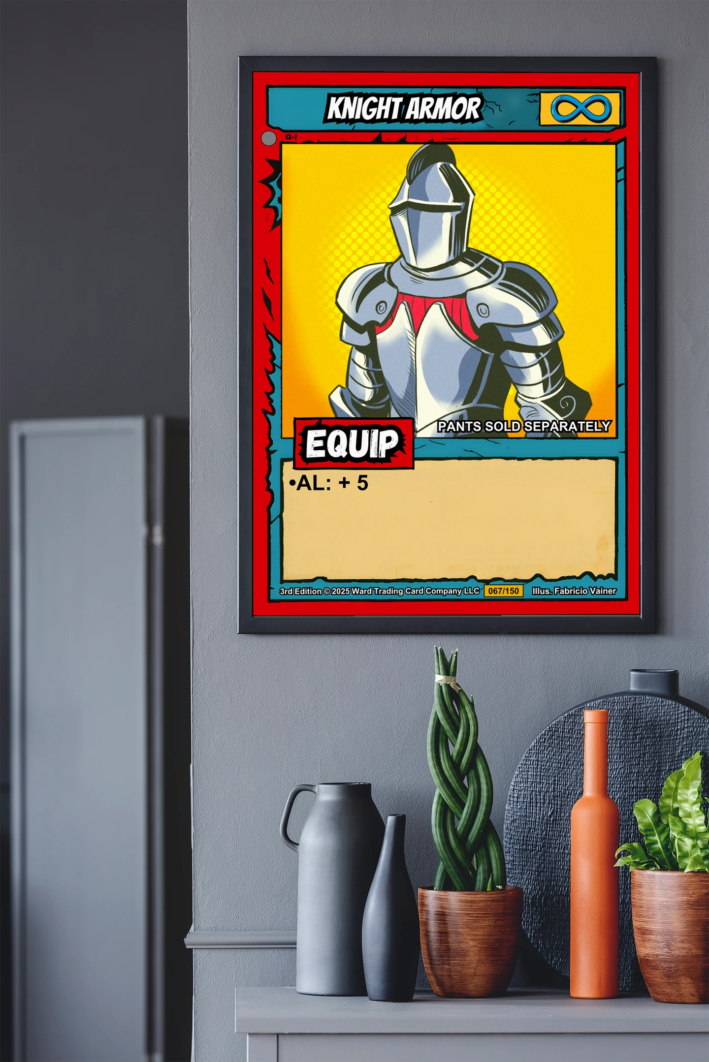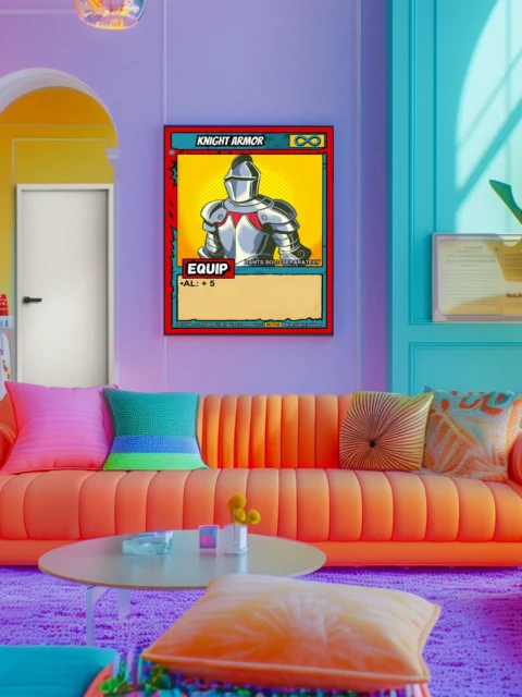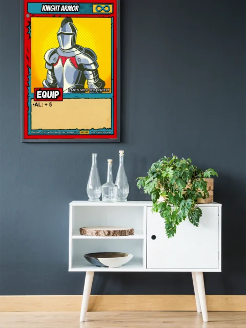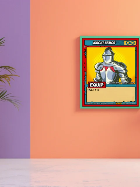 The humorous notation PANTS SOLD SEPARATELY reads clearly from across the room. Collectors of equipment cards and armor-themed TCG art recognize the infinity symbol instantly. This knight armor trading card canvas print delivers nostalgic pop art energy for dedicated Ward players.