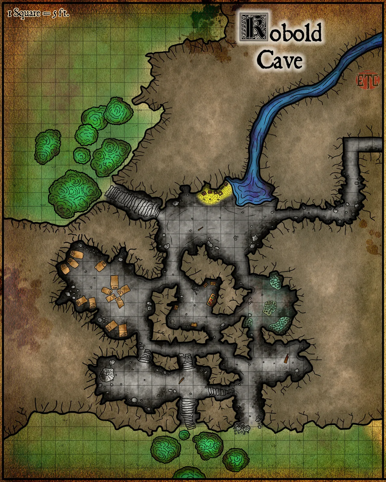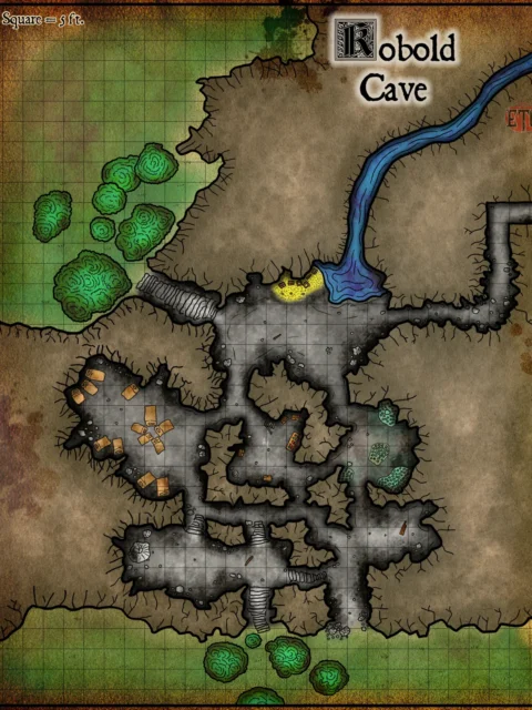A turquoise stream cuts through gray stone chambers where kobolds store crates. This kobold cave fantasy battle map canvas print shows a gridded dungeon complex. Fungal patches bloom green against brown cave walls, notably around the water pools.