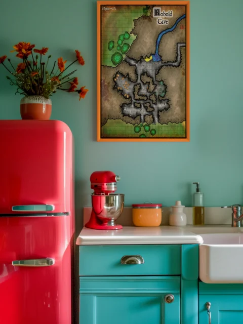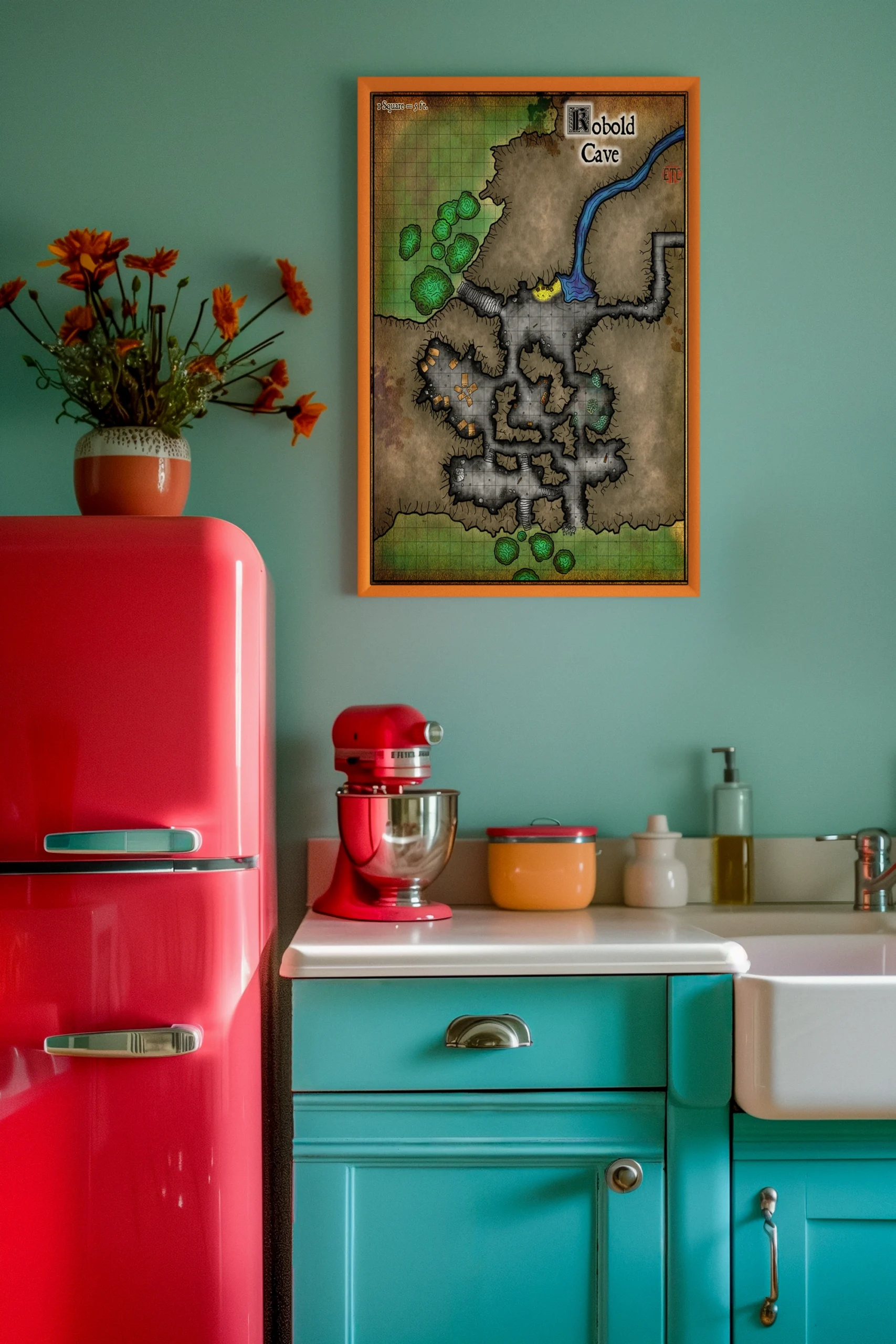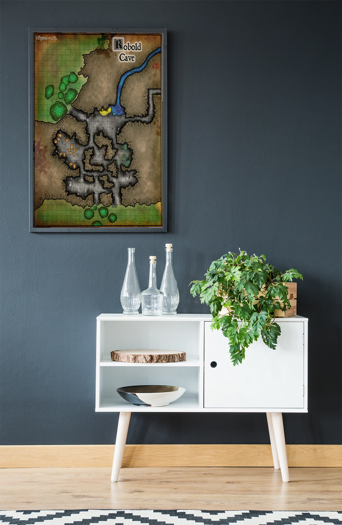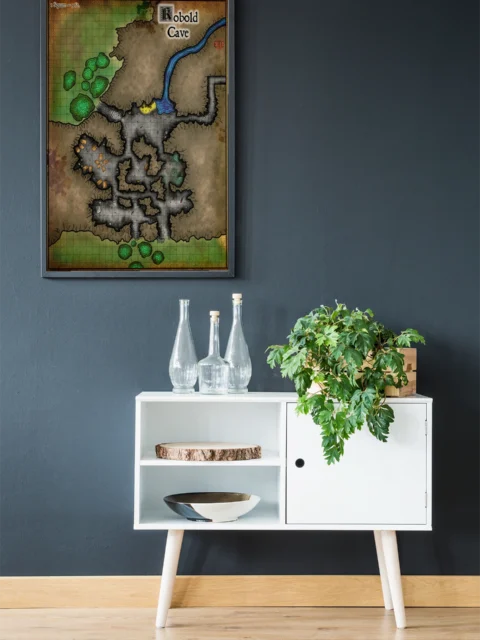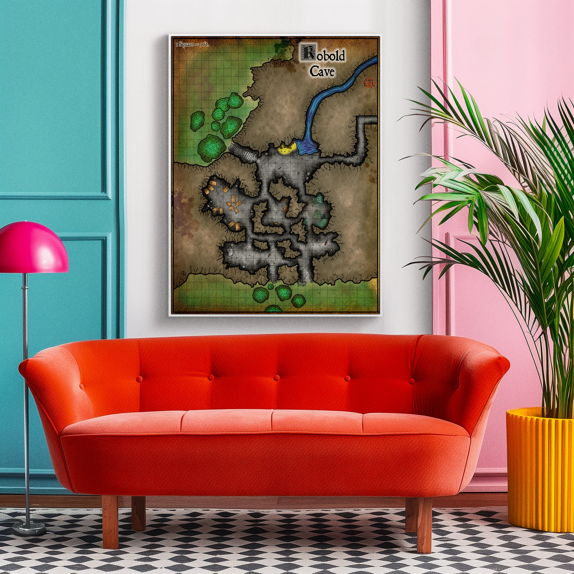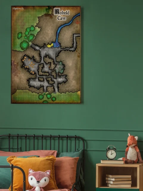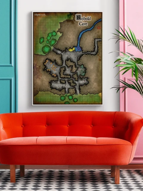 This map gives dungeon masters a reusable low-level encounter location without prep time. Derek Ruiz designed it for D&D 5e tables that need drop-in kobold lairs. The kobold cave fantasy battle map canvas print works particularly well for early campaign sessions.