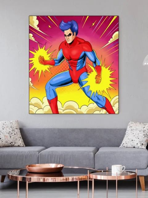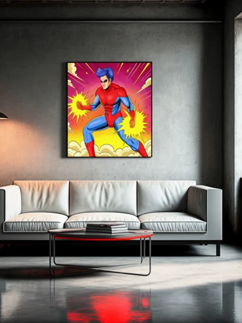 Game rooms and collector galleries benefit from the bold pop art color scheme and heroic energy. Additionally, the piece anchors superhero-themed spaces with authentic comic book illustration lineage and vintage halftone texture.