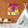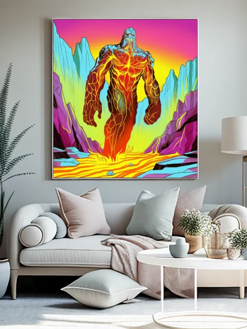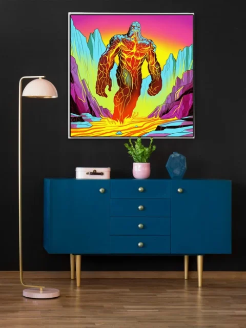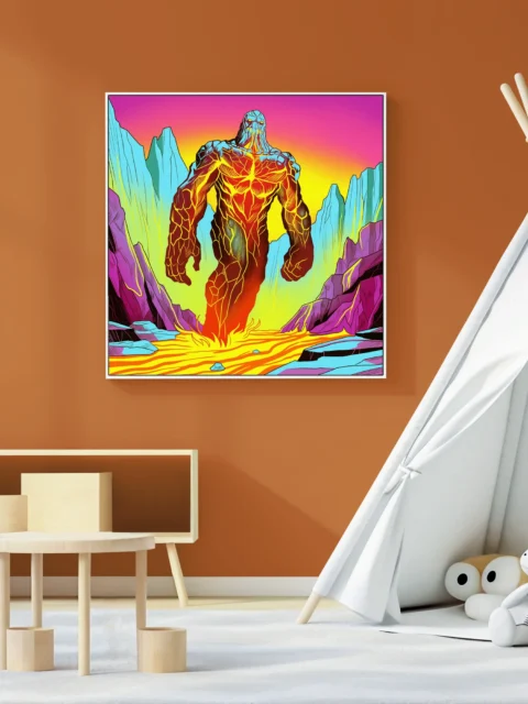 On the wall, the high-saturation neon palette holds intensity that small-scale prints lose. Ward TCG collectors and retro fantasy art enthusiasts recognize Vainer’s distinctive comic book style. This lava golem art trading card art canvas print delivers gallery-ready creature illustration.