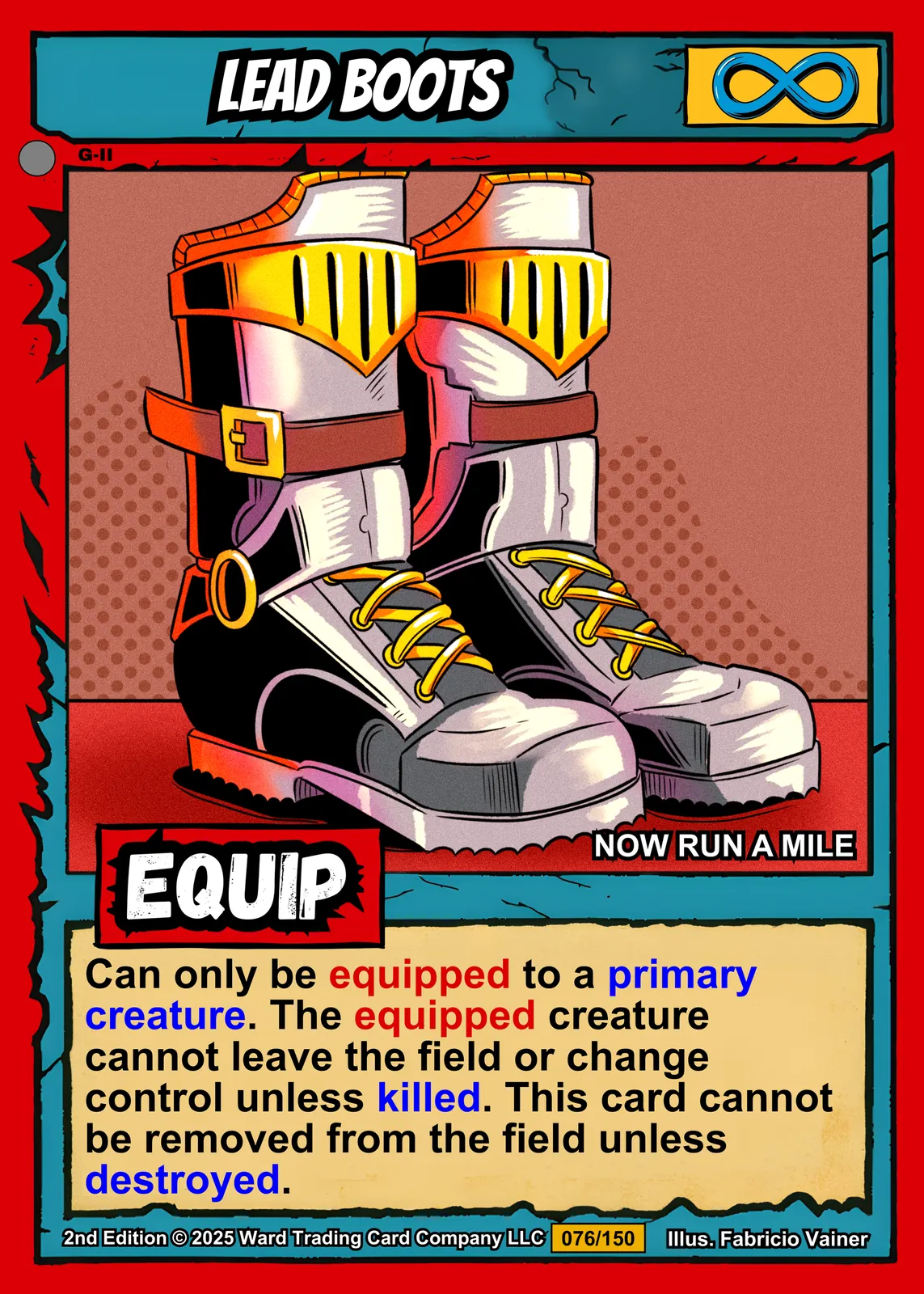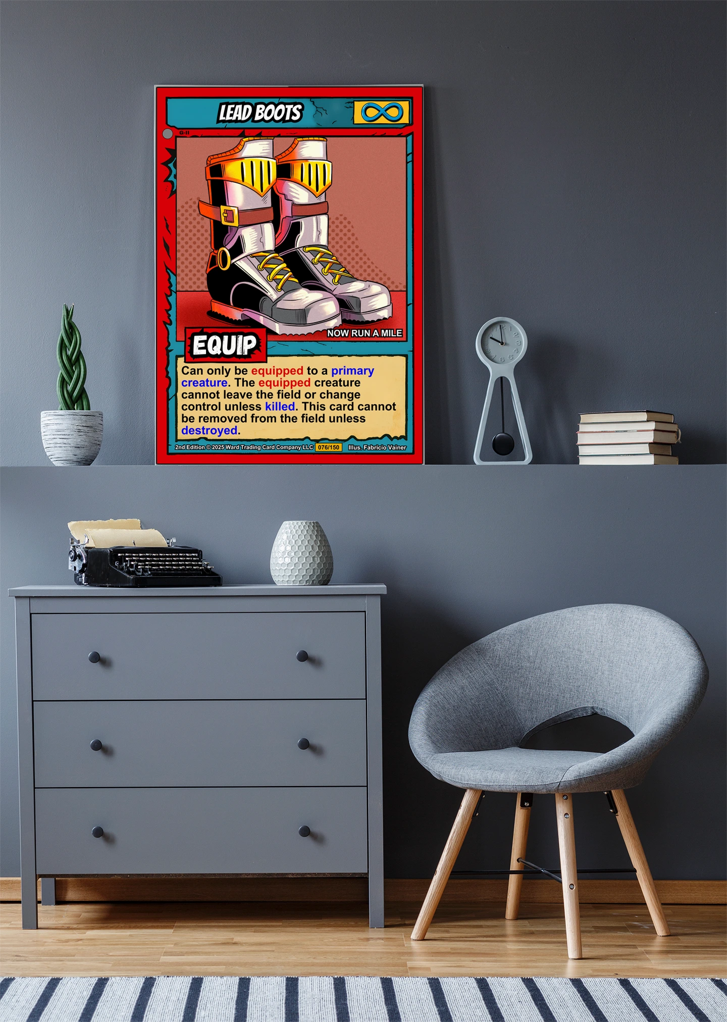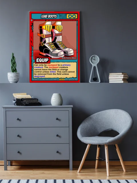 The high-contrast palette and cel-shaded rendering read clearly from across a room. Collectors of equipment cards and comic-style fantasy art recognize the playful tone immediately. This lead boots trading card canvas print brings Ward TCG humor to the wall.