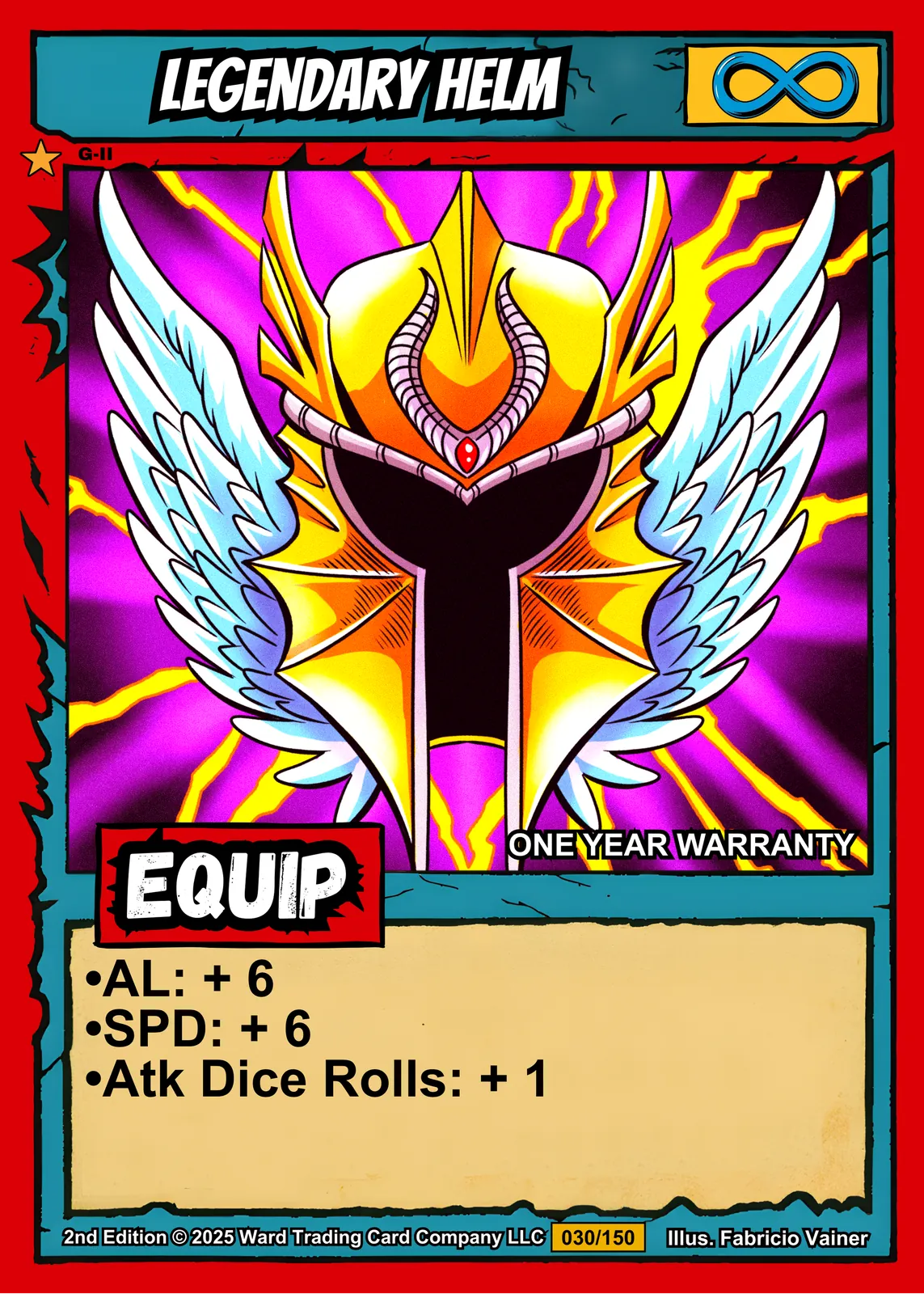 Additionally, the bold red border frames a cyan inner edge around the artwork. The header displays ‘LEGENDARY HELM’ in stylized white text with a cyan infinity symbol. A tan stat box lists AL: +6, SPD: +6, and Atk Dice Rolls: +1 beneath the red ‘EQUIP’ label.