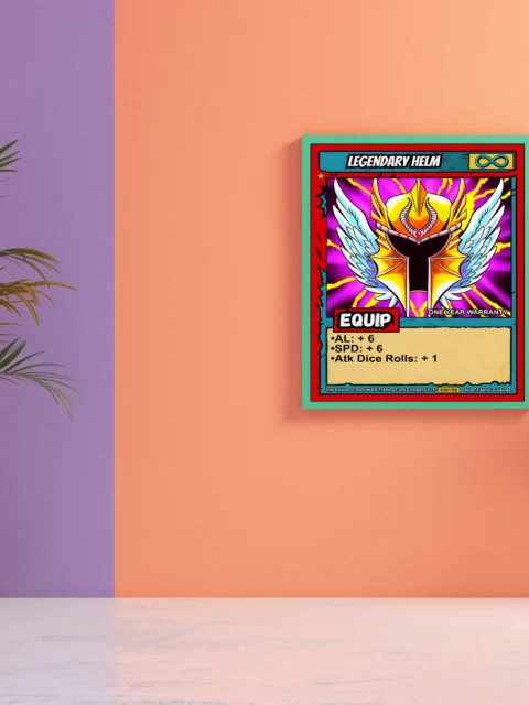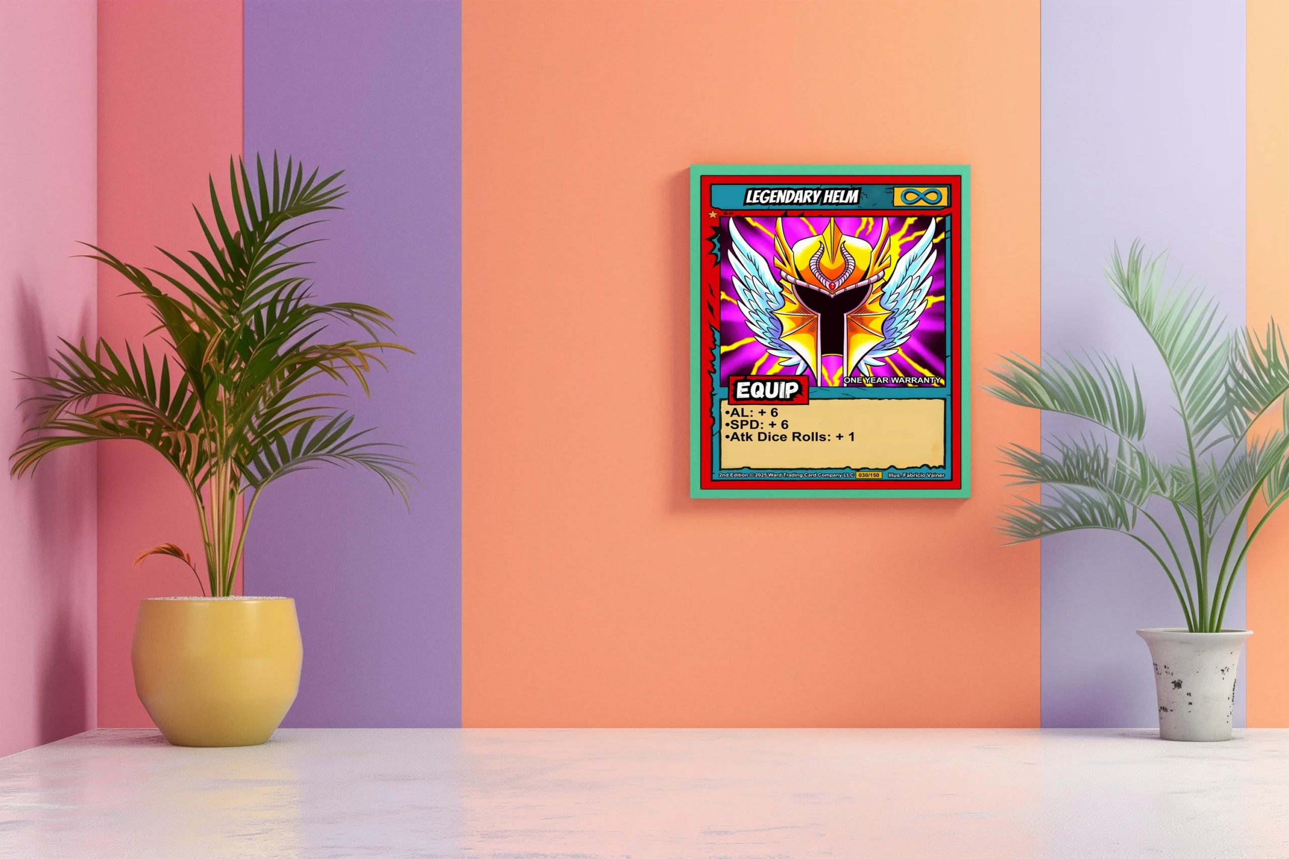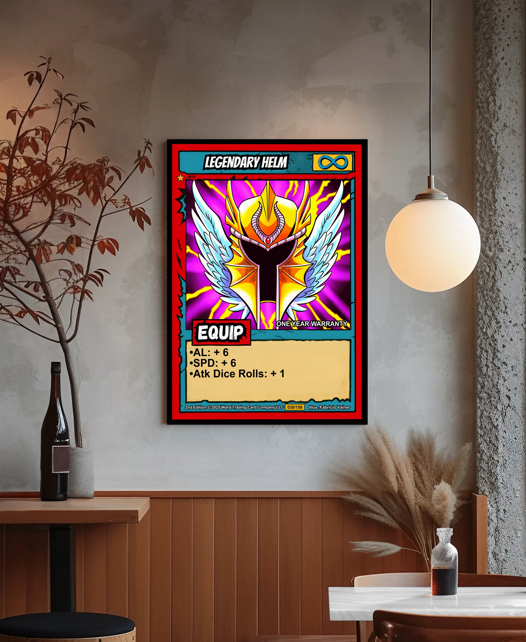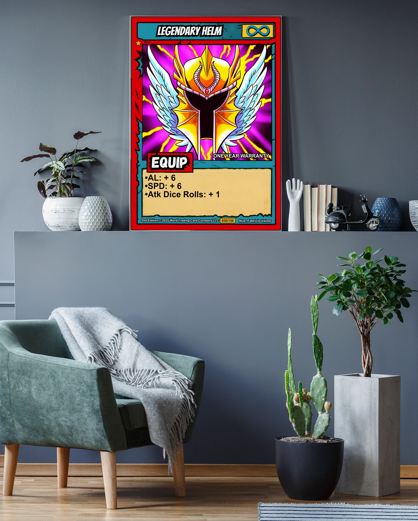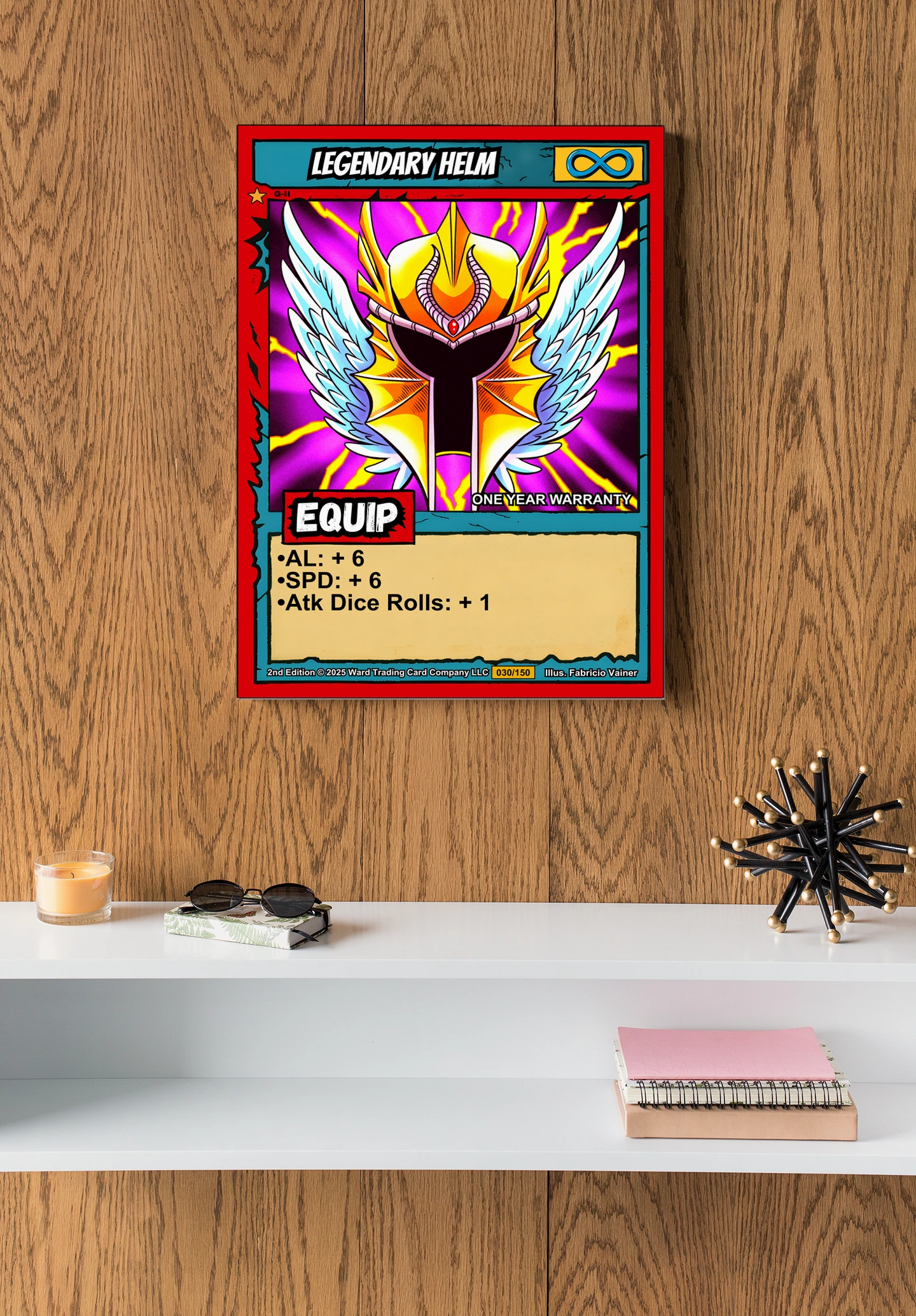At room scale, the vibrant magenta and gold palette commands attention from across the space. Ward TCG collectors recognize the iconic card design language and equipment card formatting. This legendary helm trading card canvas print delivers authentic game art at display dimensions.