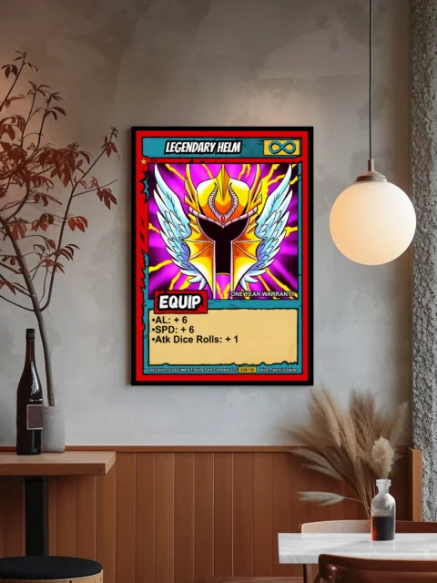 This piece anchors a game room wall where bold color and fantasy iconography set the tone. Additionally, it complements other Ward TCG equipment card prints in a collector’s gallery arrangement.