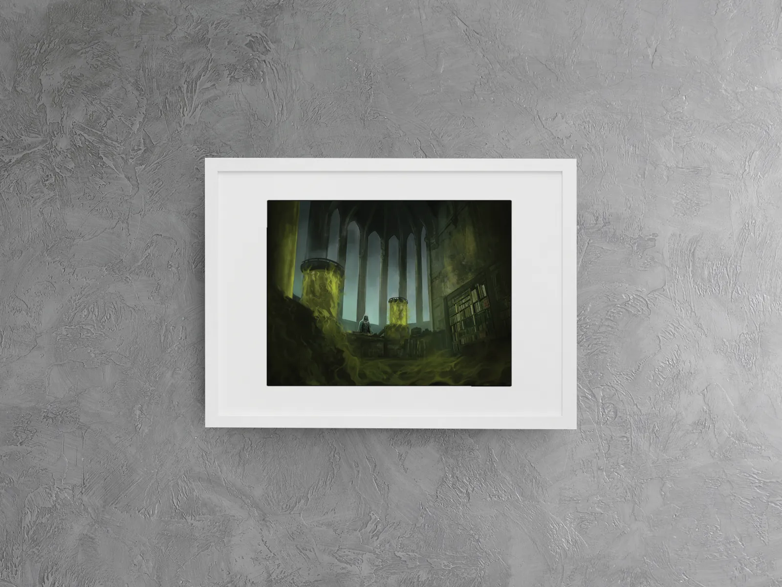 Sickly greens coil against cold stone and shadowed shelves of forgotten lore, embodying Liches fine art canvas style. Consequently, the color contrast intensifies the impact, making the space feel corrupted, ancient, and perilously alive.