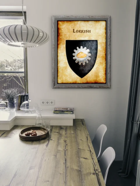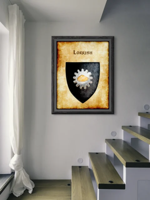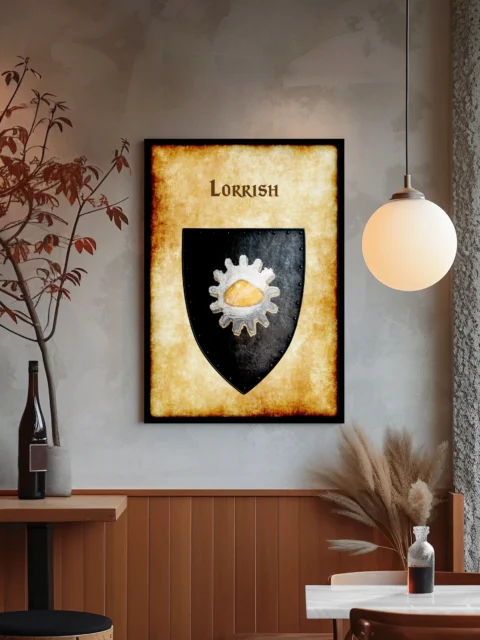 A weathered heater shield displays Lorrish heraldry on aged parchment. This lorrish Greyhawk heraldry canvas print features the faction’s distinctive gear symbol. The silver cog surrounds a golden hemisphere against black field.