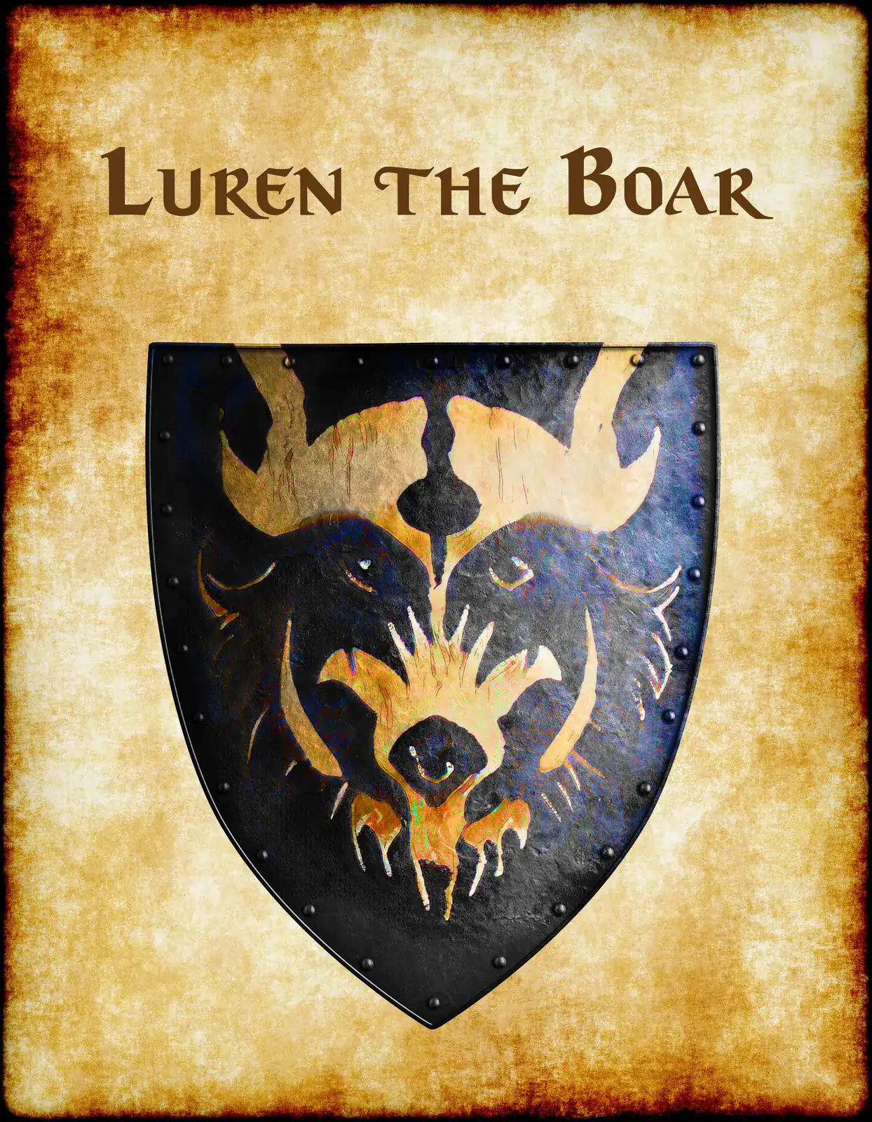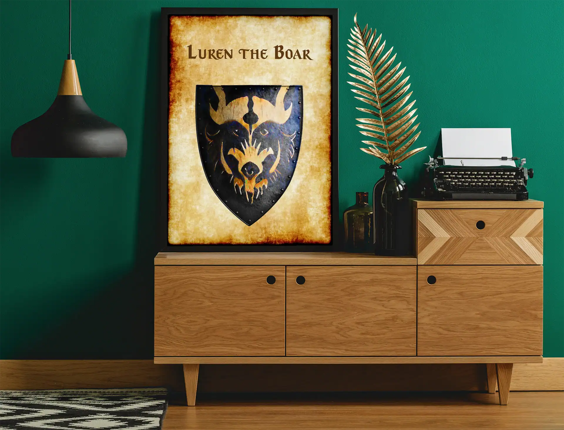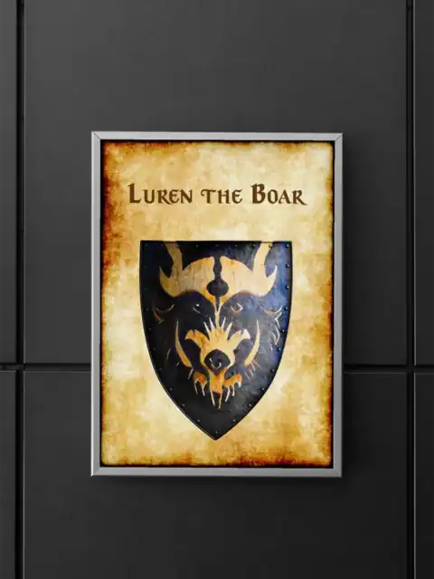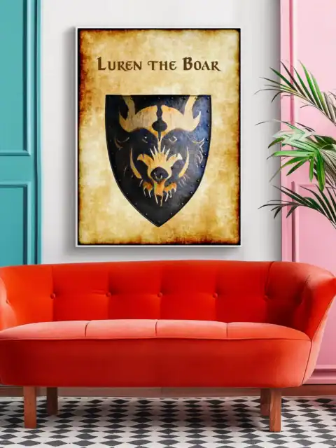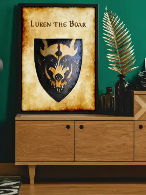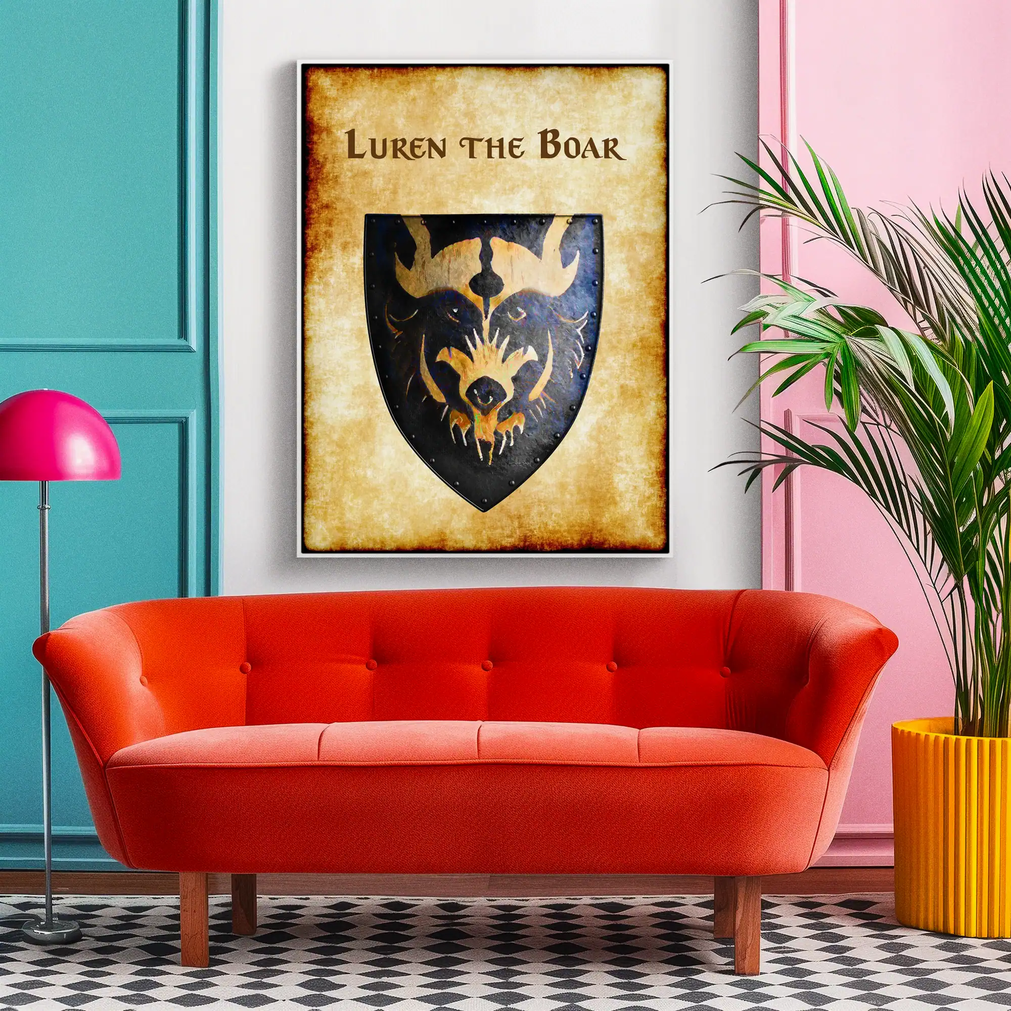 The golden boar’s head glares forward from its black heraldic field. This luren the boar Greyhawk heraldry canvas print showcases medieval faction symbolism. Notably, the weathered parchment background adds authentic manuscript character.