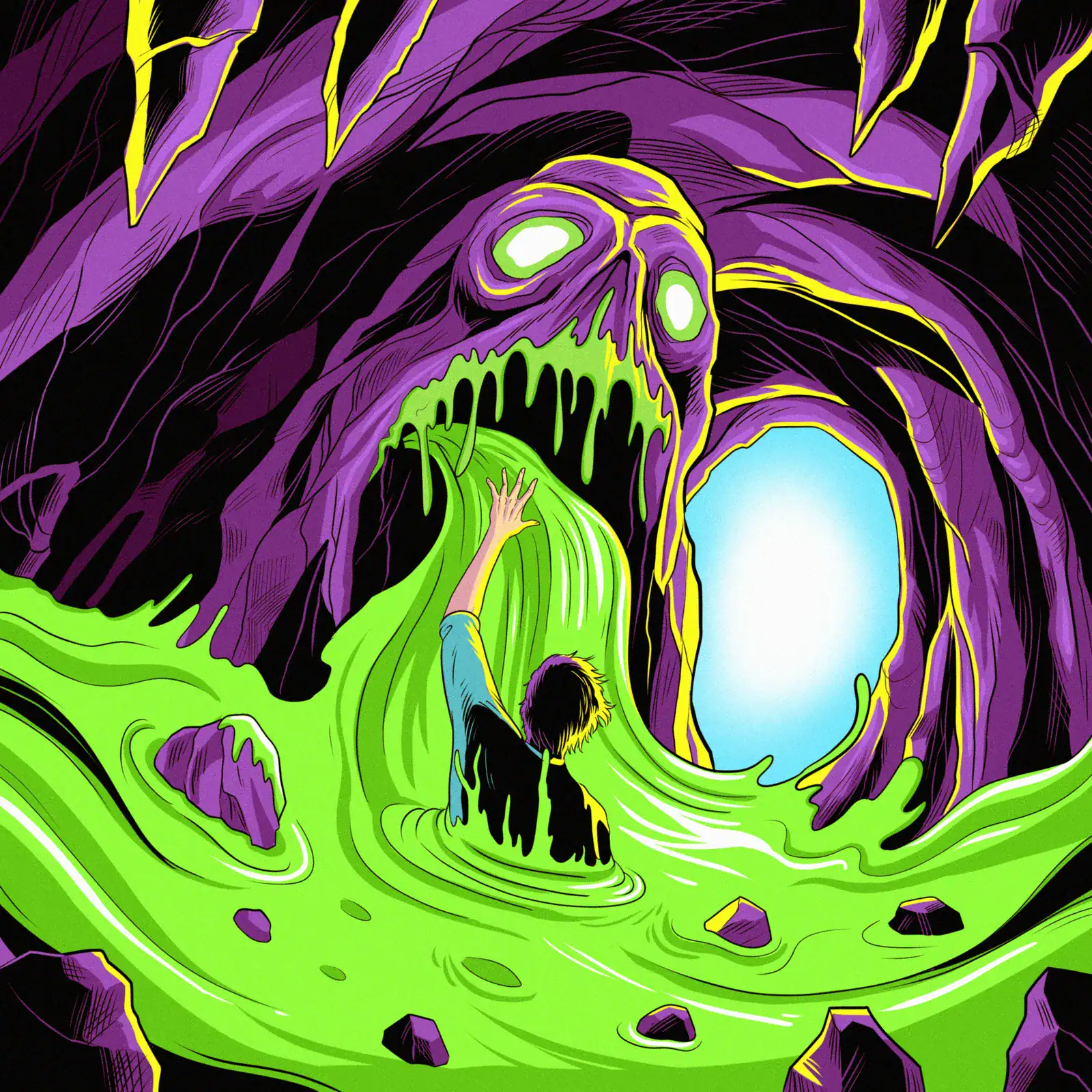 Indeed, swirling purple tendrils frame a bright blue portal glowing within the monster’s torso. The cavern setting uses bold comic book linework with high-contrast neon colors. Moreover, black ichor drips from exposed teeth in classic 1990s animated style.