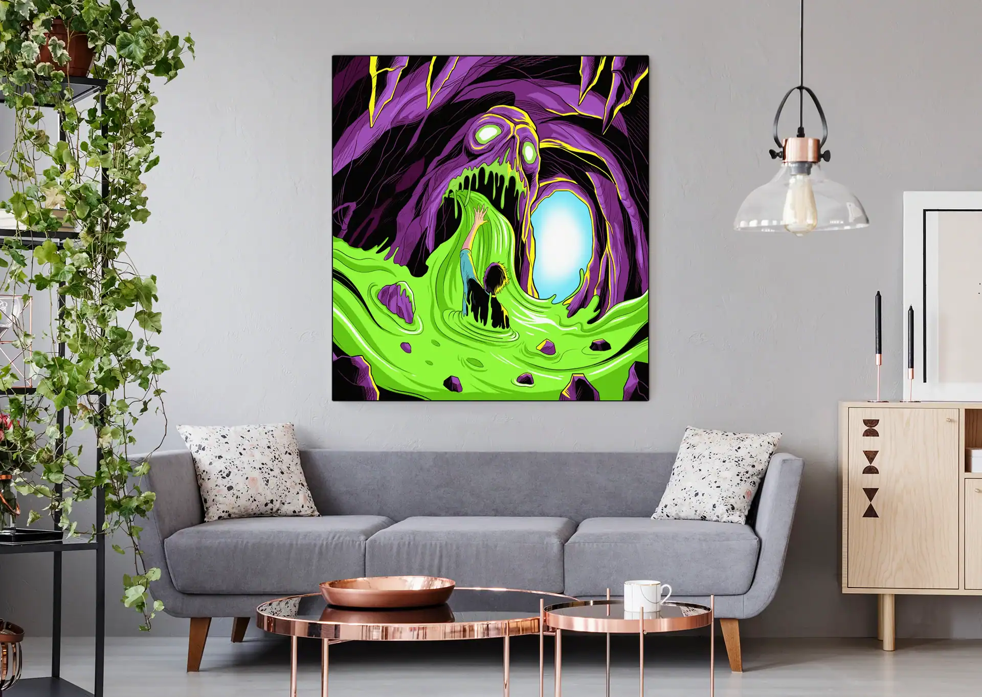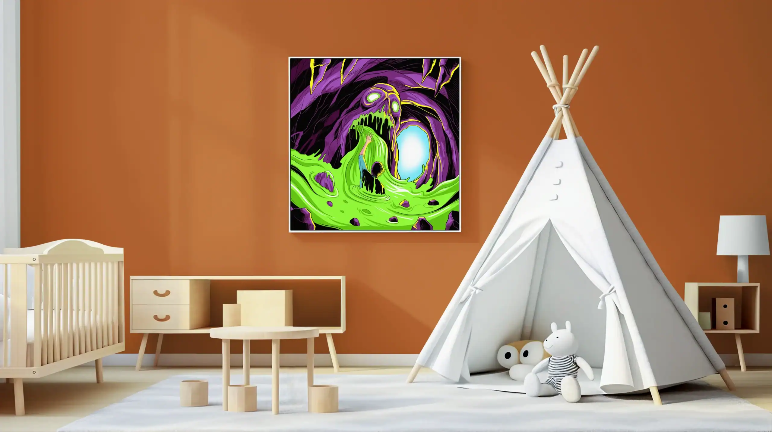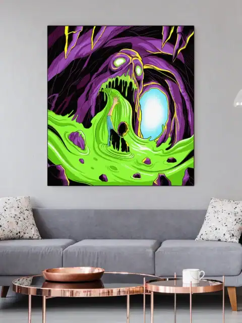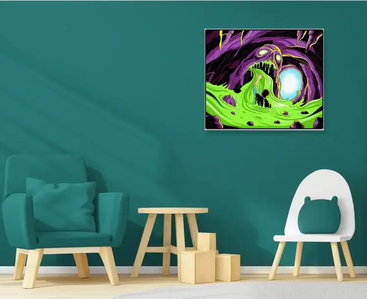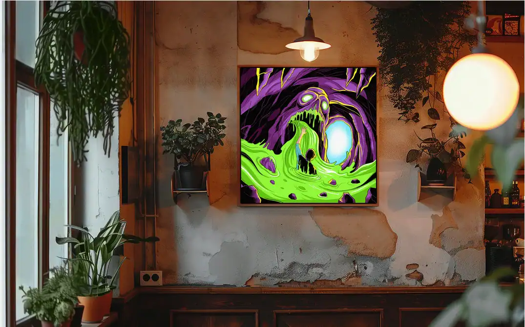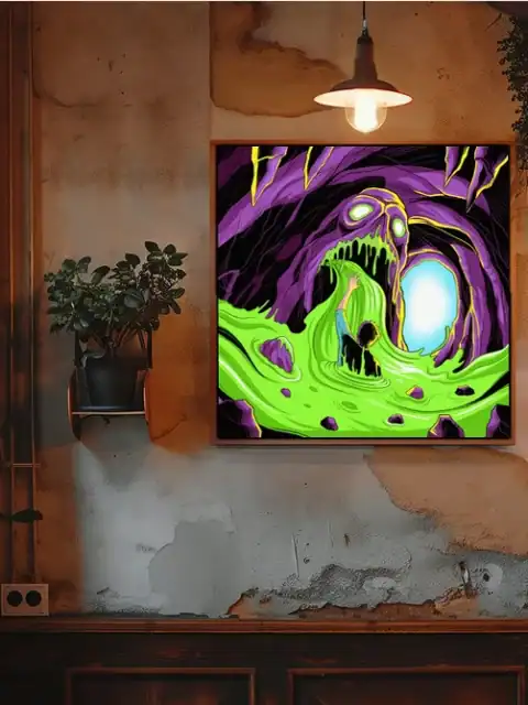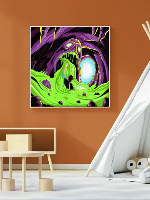 Creative studio or gaming den sessions gain atmospheric horror through this nightmarish creature art. Additionally, the bold neon palette provides dramatic lighting for late-night tabletop campaigns.
