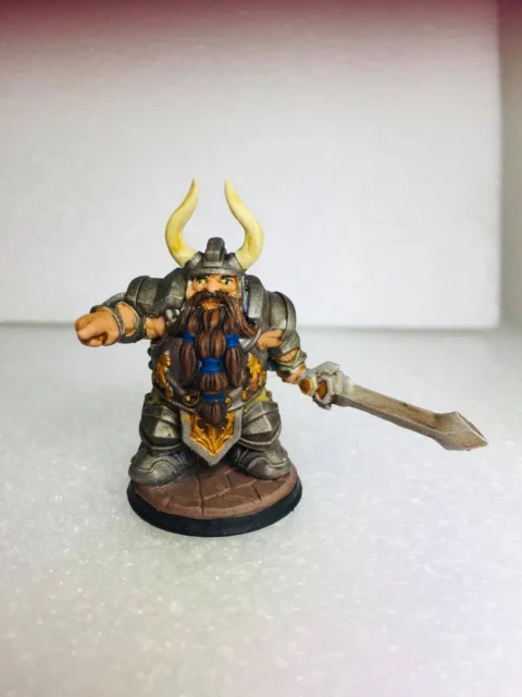 Luther The King renders judgment with an outstretched finger while his sword waits low. The luther the king dwarf miniature commands absolute authority when clan disputes require a voice none dare question. Notably, his forked beard carries more braid rings than any other Oakentap elder.
