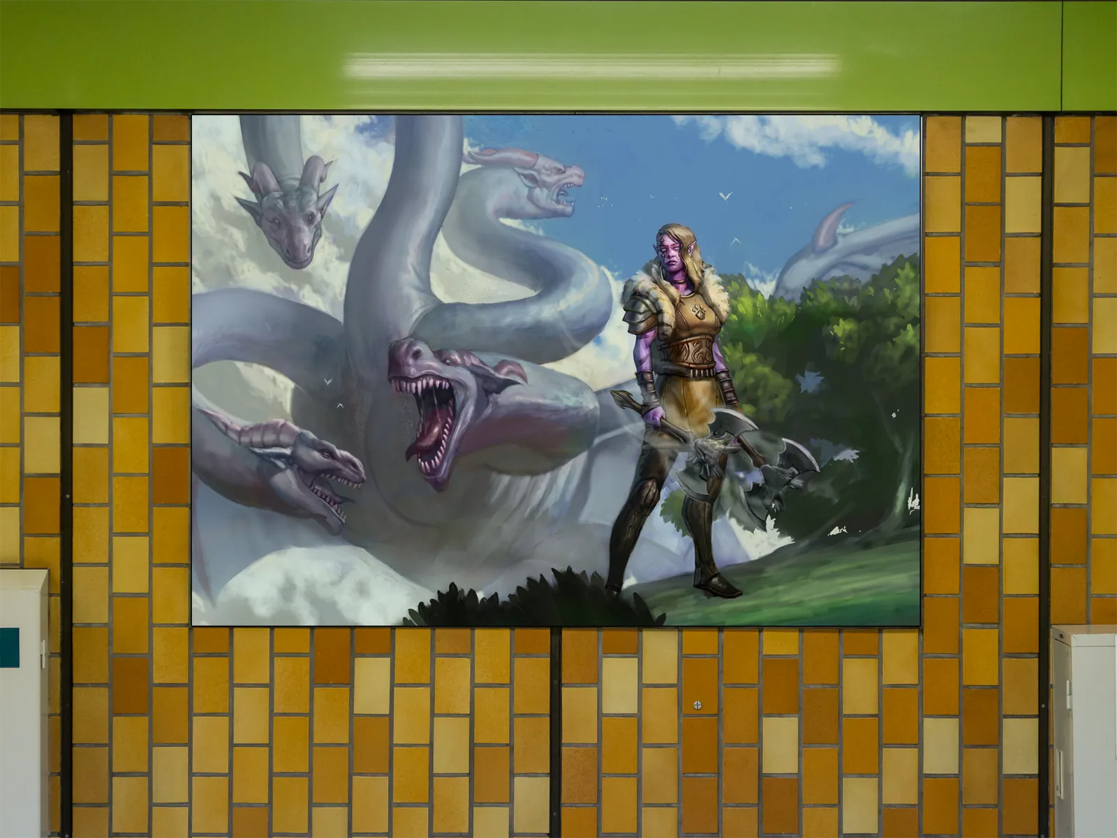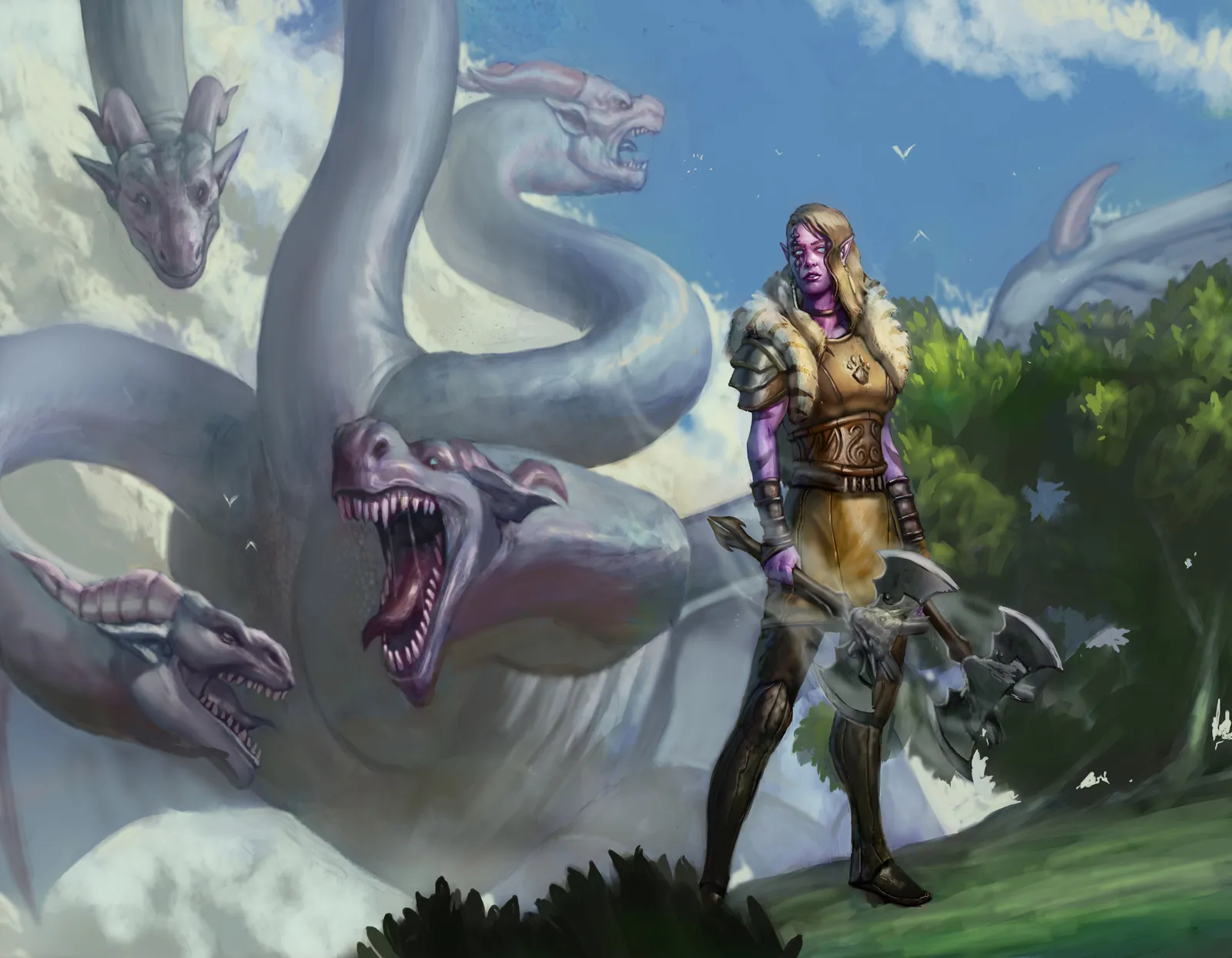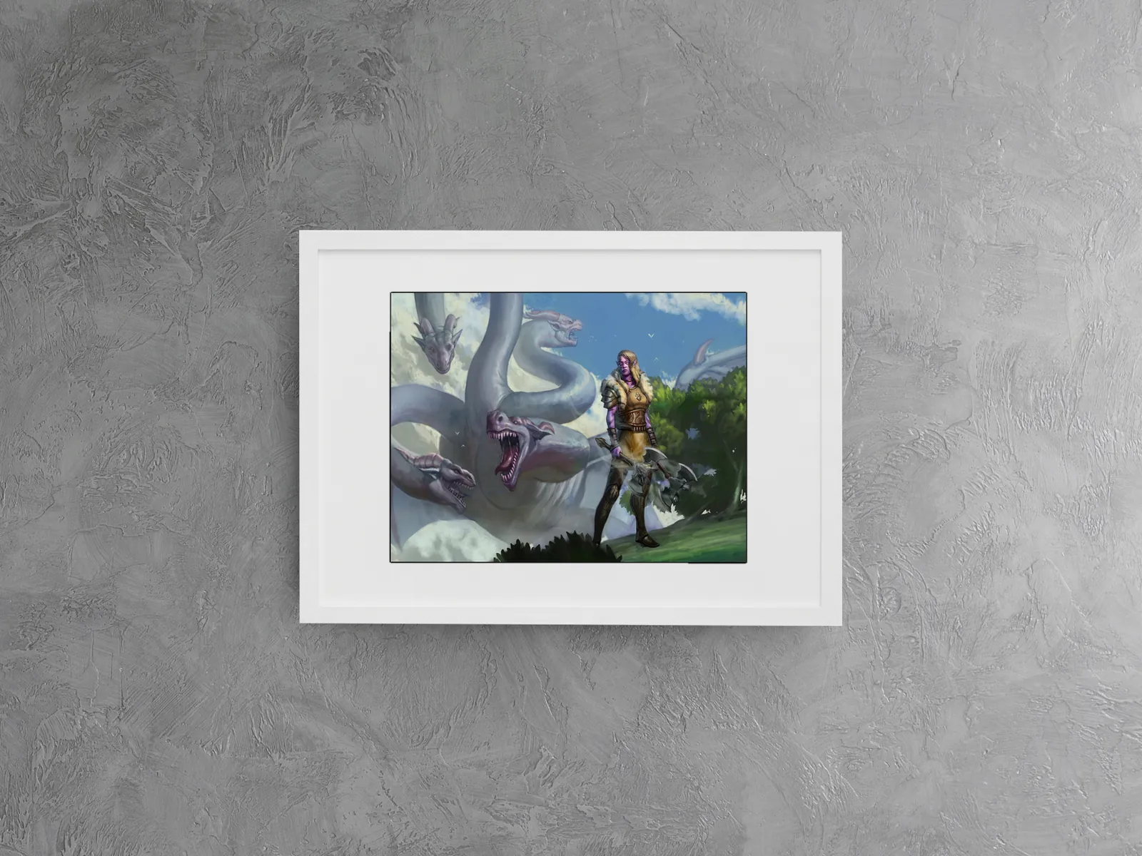 Additionally, the composition balances vertical power and human scale, using the serpent’s sweeping necks to frame the figures. However, the open sky and softened foliage keep the confrontation readable and composed. Consequently, the scene carries dramatic weight without collapsing into chaos.